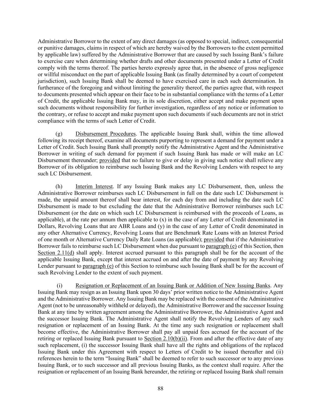 88 Administrative Borrower to the extent of any direct damages (as opposed to special, indirect, consequential or punitive damages, claims in respect of which are hereby waived by the Borrowers to the extent permitted by applicable law) suffered by the Administrative Borrower that are caused by such Issuing Bank’s failure to exercise care when determining whether drafts and other documents presented under a Letter of Credit comply with the terms thereof. The parties hereto expressly agree that, in the absence of gross negligence or willful misconduct on the part of applicable Issuing Bank (as finally determined by a court of competent jurisdiction), such Issuing Bank shall be deemed to have exercised care in each such determination. In furtherance of the foregoing and without limiting the generality thereof, the parties agree that, with respect to documents presented which appear on their face to be in substantial compliance with the terms of a Letter of Credit, the applicable Issuing Bank may, in its sole discretion, either accept and make payment upon such documents without responsibility for further investigation, regardless of any notice or information to the contrary, or refuse to accept and make payment upon such documents if such documents are not in strict compliance with the terms of such Letter of Credit. (g) Disbursement Procedures. The applicable Issuing Bank shall, within the time allowed following its receipt thereof, examine all documents purporting to represent a demand for payment under a Letter of Credit. Such Issuing Bank shall promptly notify the Administrative Agent and the Administrative Borrower in writing of such demand for payment if such Issuing Bank has made or will make an LC Disbursement thereunder; provided that no failure to give or delay in giving such notice shall relieve any Borrower of its obligation to reimburse such Issuing Bank and the Revolving Lenders with respect to any such LC Disbursement. (h) Interim Interest. If any Issuing Bank makes any LC Disbursement, then, unless the Administrative Borrower reimburses such LC Disbursement in full on the date such LC Disbursement is made, the unpaid amount thereof shall bear interest, for each day from and including the date such LC Disbursement is made to but excluding the date that the Administrative Borrower reimburses such LC Disbursement (or the date on which such LC Disbursement is reimbursed with the proceeds of Loans, as applicable), at the rate per annum then applicable to (x) in the case of any Letter of Credit denominated in Dollars, Revolving Loans that are ABR Loans and (y) in the case of any Letter of Credit denominated in any other Alternative Currency, Revolving Loans that are Benchmark Rate Loans with an Interest Period of one month or Alternative Currency Daily Rate Loans (as applicable); provided that if the Administrative Borrower fails to reimburse such LC Disbursement when due pursuant to paragraph (e) of this Section, then Section 2.11(d) shall apply. Interest accrued pursuant to this paragraph shall be for the account of the applicable Issuing Bank, except that interest accrued on and after the date of payment by any Revolving Lender pursuant to paragraph (e) of this Section to reimburse such Issuing Bank shall be for the account of such Revolving Lender to the extent of such payment. (i) Resignation or Replacement of an Issuing Bank or Addition of New Issuing Banks. Any Issuing Bank may resign as an Issuing Bank upon 30 days’ prior written notice to the Administrative Agent and the Administrative Borrower. Any Issuing Bank may be replaced with the consent of the Administrative Agent (not to be unreasonably withheld or delayed), the Administrative Borrower and the successor Issuing Bank at any time by written agreement among the Administrative Borrower, the Administrative Agent and the successor Issuing Bank. The Administrative Agent shall notify the Revolving Lenders of any such resignation or replacement of an Issuing Bank. At the time any such resignation or replacement shall become effective, the Administrative Borrower shall pay all unpaid fees accrued for the account of the retiring or replaced Issuing Bank pursuant to Section 2.10(b)(ii). From and after the effective date of any such replacement, (i) the successor Issuing Bank shall have all the rights and obligations of the replaced Issuing Bank under this Agreement with respect to Letters of Credit to be issued thereafter and (ii) references herein to the term “Issuing Bank” shall be deemed to refer to such successor or to any previous Issuing Bank, or to such successor and all previous Issuing Banks, as the context shall require. After the resignation or replacement of an Issuing Bank hereunder, the retiring or replaced Issuing Bank shall remain