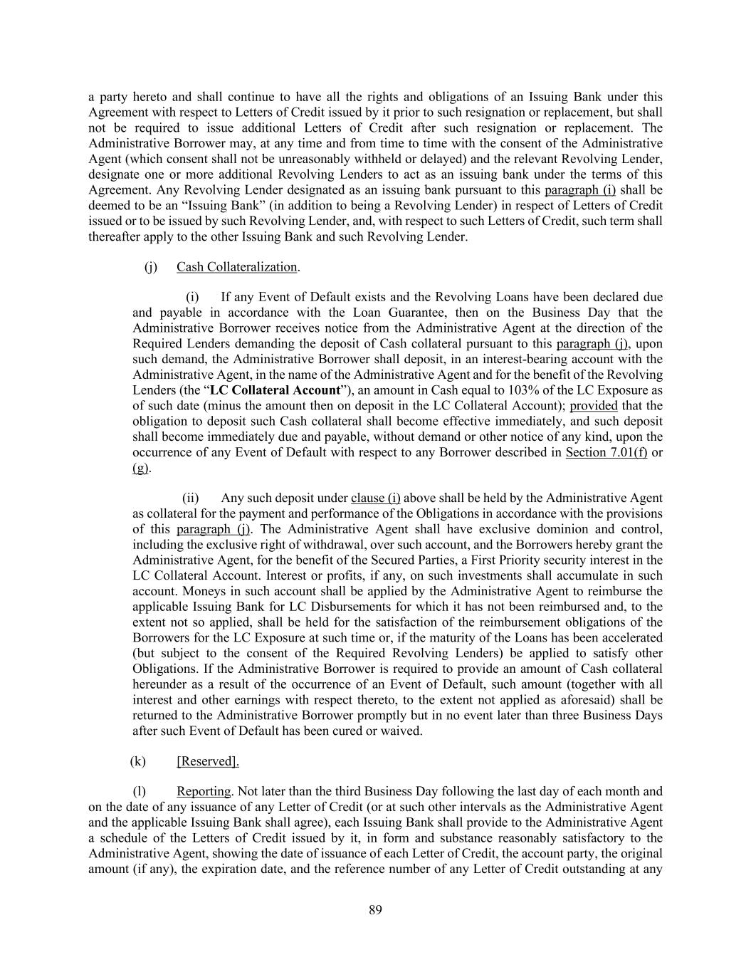 89 a party hereto and shall continue to have all the rights and obligations of an Issuing Bank under this Agreement with respect to Letters of Credit issued by it prior to such resignation or replacement, but shall not be required to issue additional Letters of Credit after such resignation or replacement. The Administrative Borrower may, at any time and from time to time with the consent of the Administrative Agent (which consent shall not be unreasonably withheld or delayed) and the relevant Revolving Lender, designate one or more additional Revolving Lenders to act as an issuing bank under the terms of this Agreement. Any Revolving Lender designated as an issuing bank pursuant to this paragraph (i) shall be deemed to be an “Issuing Bank” (in addition to being a Revolving Lender) in respect of Letters of Credit issued or to be issued by such Revolving Lender, and, with respect to such Letters of Credit, such term shall thereafter apply to the other Issuing Bank and such Revolving Lender. (j) Cash Collateralization. (i) If any Event of Default exists and the Revolving Loans have been declared due and payable in accordance with the Loan Guarantee, then on the Business Day that the Administrative Borrower receives notice from the Administrative Agent at the direction of the Required Lenders demanding the deposit of Cash collateral pursuant to this paragraph (j), upon such demand, the Administrative Borrower shall deposit, in an interest-bearing account with the Administrative Agent, in the name of the Administrative Agent and for the benefit of the Revolving Lenders (the “LC Collateral Account”), an amount in Cash equal to 103% of the LC Exposure as of such date (minus the amount then on deposit in the LC Collateral Account); provided that the obligation to deposit such Cash collateral shall become effective immediately, and such deposit shall become immediately due and payable, without demand or other notice of any kind, upon the occurrence of any Event of Default with respect to any Borrower described in Section 7.01(f) or (g). (ii) Any such deposit under clause (i) above shall be held by the Administrative Agent as collateral for the payment and performance of the Obligations in accordance with the provisions of this paragraph (j). The Administrative Agent shall have exclusive dominion and control, including the exclusive right of withdrawal, over such account, and the Borrowers hereby grant the Administrative Agent, for the benefit of the Secured Parties, a First Priority security interest in the LC Collateral Account. Interest or profits, if any, on such investments shall accumulate in such account. Moneys in such account shall be applied by the Administrative Agent to reimburse the applicable Issuing Bank for LC Disbursements for which it has not been reimbursed and, to the extent not so applied, shall be held for the satisfaction of the reimbursement obligations of the Borrowers for the LC Exposure at such time or, if the maturity of the Loans has been accelerated (but subject to the consent of the Required Revolving Lenders) be applied to satisfy other Obligations. If the Administrative Borrower is required to provide an amount of Cash collateral hereunder as a result of the occurrence of an Event of Default, such amount (together with all interest and other earnings with respect thereto, to the extent not applied as aforesaid) shall be returned to the Administrative Borrower promptly but in no event later than three Business Days after such Event of Default has been cured or waived. (k) [Reserved]. (l) Reporting. Not later than the third Business Day following the last day of each month and on the date of any issuance of any Letter of Credit (or at such other intervals as the Administrative Agent and the applicable Issuing Bank shall agree), each Issuing Bank shall provide to the Administrative Agent a schedule of the Letters of Credit issued by it, in form and substance reasonably satisfactory to the Administrative Agent, showing the date of issuance of each Letter of Credit, the account party, the original amount (if any), the expiration date, and the reference number of any Letter of Credit outstanding at any