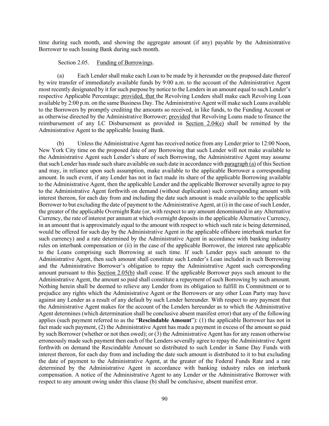90 time during such month, and showing the aggregate amount (if any) payable by the Administrative Borrower to such Issuing Bank during such month. Section 2.05. Funding of Borrowings. (a) Each Lender shall make each Loan to be made by it hereunder on the proposed date thereof by wire transfer of immediately available funds by 9:00 a.m. to the account of the Administrative Agent most recently designated by it for such purpose by notice to the Lenders in an amount equal to such Lender’s respective Applicable Percentage; provided, that the Revolving Lenders shall make each Revolving Loan available by 2:00 p.m. on the same Business Day. The Administrative Agent will make such Loans available to the Borrowers by promptly crediting the amounts so received, in like funds, to the Funding Account or as otherwise directed by the Administrative Borrower; provided that Revolving Loans made to finance the reimbursement of any LC Disbursement as provided in Section 2.04(e) shall be remitted by the Administrative Agent to the applicable Issuing Bank. (b) Unless the Administrative Agent has received notice from any Lender prior to 12:00 Noon, New York City time on the proposed date of any Borrowing that such Lender will not make available to the Administrative Agent such Lender’s share of such Borrowing, the Administrative Agent may assume that such Lender has made such share available on such date in accordance with paragraph (a) of this Section and may, in reliance upon such assumption, make available to the applicable Borrower a corresponding amount. In such event, if any Lender has not in fact made its share of the applicable Borrowing available to the Administrative Agent, then the applicable Lender and the applicable Borrower severally agree to pay to the Administrative Agent forthwith on demand (without duplication) such corresponding amount with interest thereon, for each day from and including the date such amount is made available to the applicable Borrower to but excluding the date of payment to the Administrative Agent, at (i) in the case of such Lender, the greater of the applicable Overnight Rate (or, with respect to any amount denominated in any Alternative Currency, the rate of interest per annum at which overnight deposits in the applicable Alternative Currency, in an amount that is approximately equal to the amount with respect to which such rate is being determined, would be offered for such day by the Administrative Agent in the applicable offshore interbank market for such currency) and a rate determined by the Administrative Agent in accordance with banking industry rules on interbank compensation or (ii) in the case of the applicable Borrower, the interest rate applicable to the Loans comprising such Borrowing at such time. If such Lender pays such amount to the Administrative Agent, then such amount shall constitute such Lender’s Loan included in such Borrowing and the Administrative Borrower’s obligation to repay the Administrative Agent such corresponding amount pursuant to this Section 2.05(b) shall cease. If the applicable Borrower pays such amount to the Administrative Agent, the amount so paid shall constitute a repayment of such Borrowing by such amount. Nothing herein shall be deemed to relieve any Lender from its obligation to fulfill its Commitment or to prejudice any rights which the Administrative Agent or the Borrowers or any other Loan Party may have against any Lender as a result of any default by such Lender hereunder. With respect to any payment that the Administrative Agent makes for the account of the Lenders hereunder as to which the Administrative Agent determines (which determination shall be conclusive absent manifest error) that any of the following applies (such payment referred to as the “Rescindable Amount”): (1) the applicable Borrower has not in fact made such payment, (2) the Administrative Agent has made a payment in excess of the amount so paid by such Borrower (whether or not then owed); or (3) the Administrative Agent has for any reason otherwise erroneously made such payment then each of the Lenders severally agree to repay the Administrative Agent forthwith on demand the Rescindable Amount so distributed to such Lender in Same Day Funds with interest thereon, for each day from and including the date such amount is distributed to it to but excluding the date of payment to the Administrative Agent, at the greater of the Federal Funds Rate and a rate determined by the Administrative Agent in accordance with banking industry rules on interbank compensation. A notice of the Administrative Agent to any Lender or the Administrative Borrower with respect to any amount owing under this clause (b) shall be conclusive, absent manifest error.