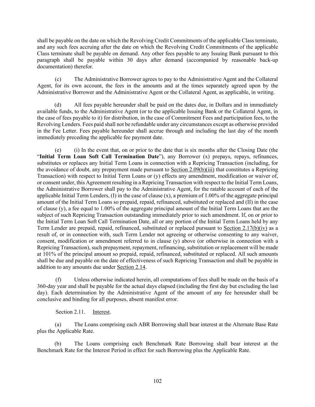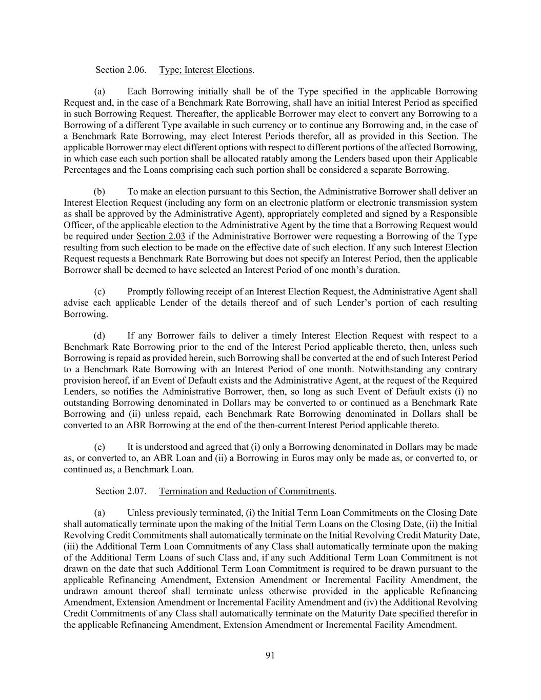 91 Section 2.06. Type; Interest Elections. (a) Each Borrowing initially shall be of the Type specified in the applicable Borrowing Request and, in the case of a Benchmark Rate Borrowing, shall have an initial Interest Period as specified in such Borrowing Request. Thereafter, the applicable Borrower may elect to convert any Borrowing to a Borrowing of a different Type available in such currency or to continue any Borrowing and, in the case of a Benchmark Rate Borrowing, may elect Interest Periods therefor, all as provided in this Section. The applicable Borrower may elect different options with respect to different portions of the affected Borrowing, in which case each such portion shall be allocated ratably among the Lenders based upon their Applicable Percentages and the Loans comprising each such portion shall be considered a separate Borrowing. (b) To make an election pursuant to this Section, the Administrative Borrower shall deliver an Interest Election Request (including any form on an electronic platform or electronic transmission system as shall be approved by the Administrative Agent), appropriately completed and signed by a Responsible Officer, of the applicable election to the Administrative Agent by the time that a Borrowing Request would be required under Section 2.03 if the Administrative Borrower were requesting a Borrowing of the Type resulting from such election to be made on the effective date of such election. If any such Interest Election Request requests a Benchmark Rate Borrowing but does not specify an Interest Period, then the applicable Borrower shall be deemed to have selected an Interest Period of one month’s duration. (c) Promptly following receipt of an Interest Election Request, the Administrative Agent shall advise each applicable Lender of the details thereof and of such Lender’s portion of each resulting Borrowing. (d) If any Borrower fails to deliver a timely Interest Election Request with respect to a Benchmark Rate Borrowing prior to the end of the Interest Period applicable thereto, then, unless such Borrowing is repaid as provided herein, such Borrowing shall be converted at the end of such Interest Period to a Benchmark Rate Borrowing with an Interest Period of one month. Notwithstanding any contrary provision hereof, if an Event of Default exists and the Administrative Agent, at the request of the Required Lenders, so notifies the Administrative Borrower, then, so long as such Event of Default exists (i) no outstanding Borrowing denominated in Dollars may be converted to or continued as a Benchmark Rate Borrowing and (ii) unless repaid, each Benchmark Rate Borrowing denominated in Dollars shall be converted to an ABR Borrowing at the end of the then-current Interest Period applicable thereto. (e) It is understood and agreed that (i) only a Borrowing denominated in Dollars may be made as, or converted to, an ABR Loan and (ii) a Borrowing in Euros may only be made as, or converted to, or continued as, a Benchmark Loan. Section 2.07. Termination and Reduction of Commitments. (a) Unless previously terminated, (i) the Initial Term Loan Commitments on the Closing Date shall automatically terminate upon the making of the Initial Term Loans on the Closing Date, (ii) the Initial Revolving Credit Commitments shall automatically terminate on the Initial Revolving Credit Maturity Date, (iii) the Additional Term Loan Commitments of any Class shall automatically terminate upon the making of the Additional Term Loans of such Class and, if any such Additional Term Loan Commitment is not drawn on the date that such Additional Term Loan Commitment is required to be drawn pursuant to the applicable Refinancing Amendment, Extension Amendment or Incremental Facility Amendment, the undrawn amount thereof shall terminate unless otherwise provided in the applicable Refinancing Amendment, Extension Amendment or Incremental Facility Amendment and (iv) the Additional Revolving Credit Commitments of any Class shall automatically terminate on the Maturity Date specified therefor in the applicable Refinancing Amendment, Extension Amendment or Incremental Facility Amendment.