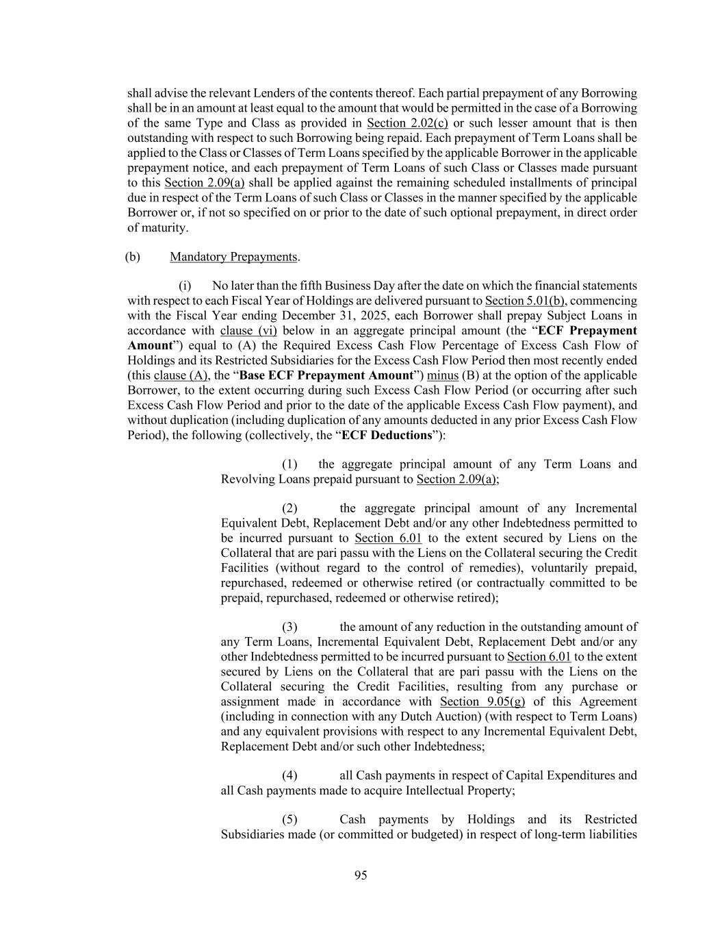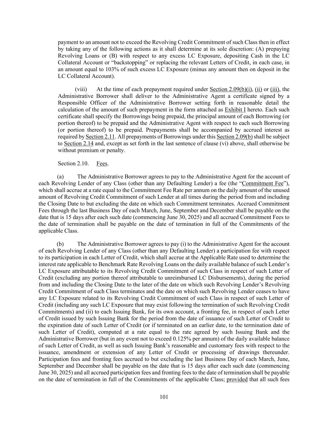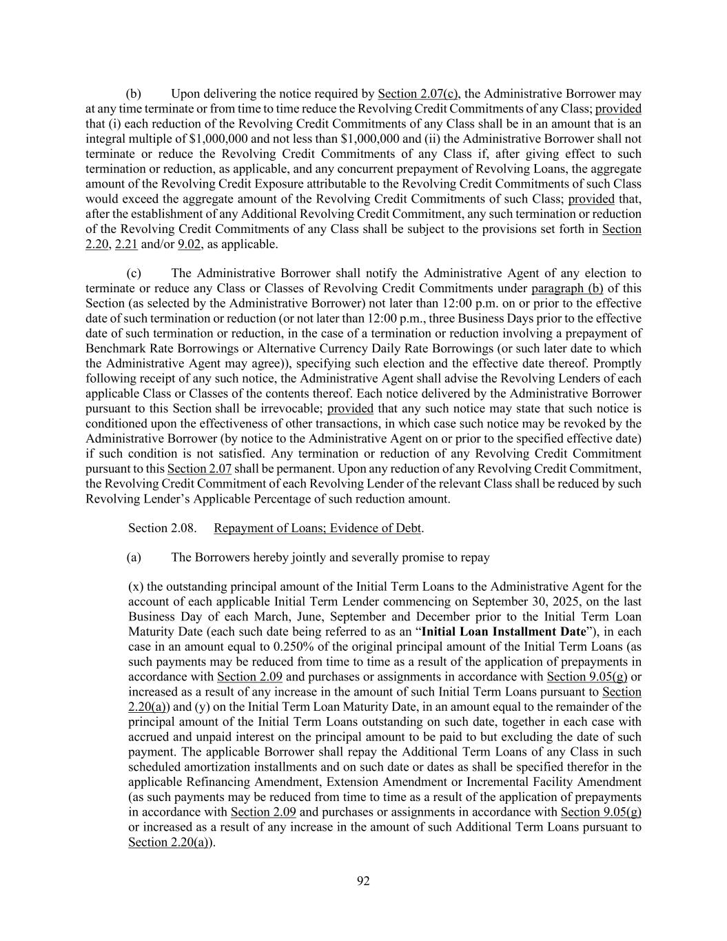 92 (b) Upon delivering the notice required by Section 2.07(c), the Administrative Borrower may at any time terminate or from time to time reduce the Revolving Credit Commitments of any Class; provided that (i) each reduction of the Revolving Credit Commitments of any Class shall be in an amount that is an integral multiple of $1,000,000 and not less than $1,000,000 and (ii) the Administrative Borrower shall not terminate or reduce the Revolving Credit Commitments of any Class if, after giving effect to such termination or reduction, as applicable, and any concurrent prepayment of Revolving Loans, the aggregate amount of the Revolving Credit Exposure attributable to the Revolving Credit Commitments of such Class would exceed the aggregate amount of the Revolving Credit Commitments of such Class; provided that, after the establishment of any Additional Revolving Credit Commitment, any such termination or reduction of the Revolving Credit Commitments of any Class shall be subject to the provisions set forth in Section 2.20, 2.21 and/or 9.02, as applicable. (c) The Administrative Borrower shall notify the Administrative Agent of any election to terminate or reduce any Class or Classes of Revolving Credit Commitments under paragraph (b) of this Section (as selected by the Administrative Borrower) not later than 12:00 p.m. on or prior to the effective date of such termination or reduction (or not later than 12:00 p.m., three Business Days prior to the effective date of such termination or reduction, in the case of a termination or reduction involving a prepayment of Benchmark Rate Borrowings or Alternative Currency Daily Rate Borrowings (or such later date to which the Administrative Agent may agree)), specifying such election and the effective date thereof. Promptly following receipt of any such notice, the Administrative Agent shall advise the Revolving Lenders of each applicable Class or Classes of the contents thereof. Each notice delivered by the Administrative Borrower pursuant to this Section shall be irrevocable; provided that any such notice may state that such notice is conditioned upon the effectiveness of other transactions, in which case such notice may be revoked by the Administrative Borrower (by notice to the Administrative Agent on or prior to the specified effective date) if such condition is not satisfied. Any termination or reduction of any Revolving Credit Commitment pursuant to this Section 2.07 shall be permanent. Upon any reduction of any Revolving Credit Commitment, the Revolving Credit Commitment of each Revolving Lender of the relevant Class shall be reduced by such Revolving Lender’s Applicable Percentage of such reduction amount. Section 2.08. Repayment of Loans; Evidence of Debt. (a) The Borrowers hereby jointly and severally promise to repay (x) the outstanding principal amount of the Initial Term Loans to the Administrative Agent for the account of each applicable Initial Term Lender commencing on September 30, 2025, on the last Business Day of each March, June, September and December prior to the Initial Term Loan Maturity Date (each such date being referred to as an “Initial Loan Installment Date”), in each case in an amount equal to 0.250% of the original principal amount of the Initial Term Loans (as such payments may be reduced from time to time as a result of the application of prepayments in accordance with Section 2.09 and purchases or assignments in accordance with Section 9.05(g) or increased as a result of any increase in the amount of such Initial Term Loans pursuant to Section 2.20(a)) and (y) on the Initial Term Loan Maturity Date, in an amount equal to the remainder of the principal amount of the Initial Term Loans outstanding on such date, together in each case with accrued and unpaid interest on the principal amount to be paid to but excluding the date of such payment. The applicable Borrower shall repay the Additional Term Loans of any Class in such scheduled amortization installments and on such date or dates as shall be specified therefor in the applicable Refinancing Amendment, Extension Amendment or Incremental Facility Amendment (as such payments may be reduced from time to time as a result of the application of prepayments in accordance with Section 2.09 and purchases or assignments in accordance with Section 9.05(g) or increased as a result of any increase in the amount of such Additional Term Loans pursuant to Section 2.20(a)).