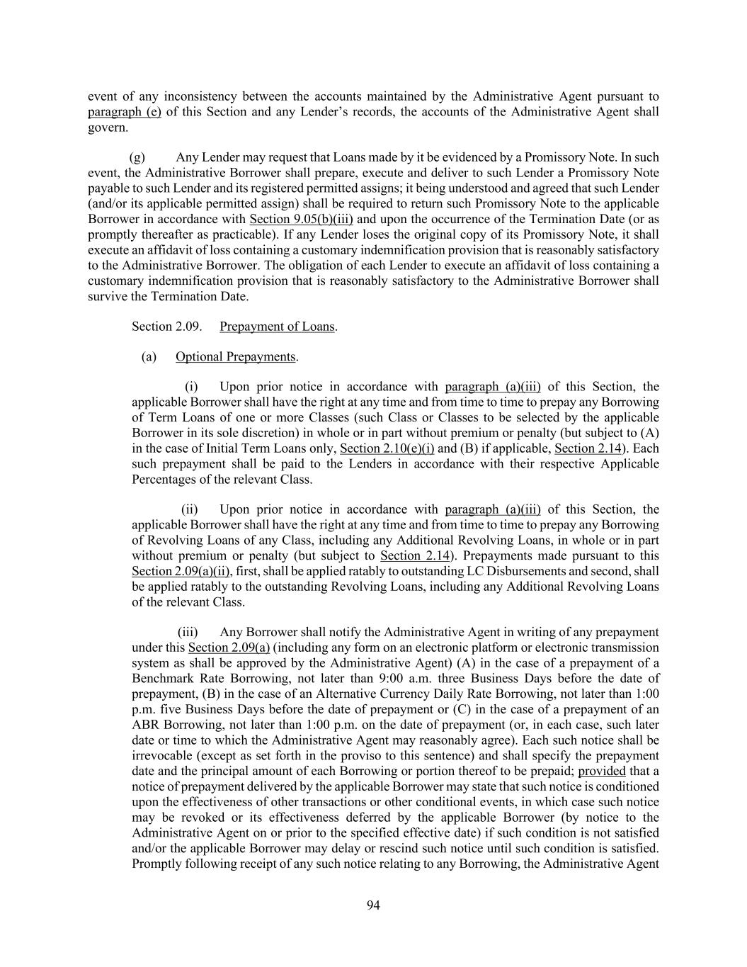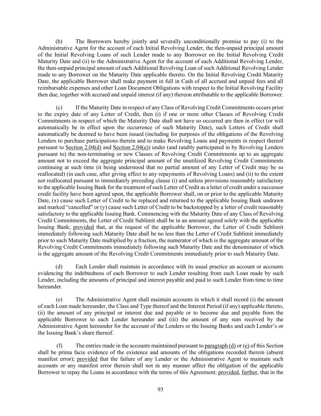 93 (b) The Borrowers hereby jointly and severally unconditionally promise to pay (i) to the Administrative Agent for the account of each Initial Revolving Lender, the then-unpaid principal amount of the Initial Revolving Loans of such Lender made to any Borrower on the Initial Revolving Credit Maturity Date and (ii) to the Administrative Agent for the account of each Additional Revolving Lender, the then-unpaid principal amount of each Additional Revolving Loan of such Additional Revolving Lender made to any Borrower on the Maturity Date applicable thereto. On the Initial Revolving Credit Maturity Date, the applicable Borrower shall make payment in full in Cash of all accrued and unpaid fees and all reimbursable expenses and other Loan Document Obligations with respect to the Initial Revolving Facility then due, together with accrued and unpaid interest (if any) thereon attributable to the applicable Borrower. (c) If the Maturity Date in respect of any Class of Revolving Credit Commitments occurs prior to the expiry date of any Letter of Credit, then (i) if one or more other Classes of Revolving Credit Commitments in respect of which the Maturity Date shall not have so occurred are then in effect (or will automatically be in effect upon the occurrence of such Maturity Date), such Letters of Credit shall automatically be deemed to have been issued (including for purposes of the obligations of the Revolving Lenders to purchase participations therein and to make Revolving Loans and payments in respect thereof pursuant to Section 2.04(d) and Section 2.04(e)) under (and ratably participated in by Revolving Lenders pursuant to) the non-terminating or new Classes of Revolving Credit Commitments up to an aggregate amount not to exceed the aggregate principal amount of the unutilized Revolving Credit Commitments continuing at such time (it being understood that no partial amount of any Letter of Credit may be so reallocated) (in each case, after giving effect to any repayments of Revolving Loans) and (ii) to the extent not reallocated pursuant to immediately preceding clause (i) and unless provisions reasonably satisfactory to the applicable Issuing Bank for the treatment of such Letter of Credit as a letter of credit under a successor credit facility have been agreed upon, the applicable Borrower shall, on or prior to the applicable Maturity Date, (x) cause such Letter of Credit to be replaced and returned to the applicable Issuing Bank undrawn and marked “cancelled” or (y) cause such Letter of Credit to be backstopped by a letter of credit reasonably satisfactory to the applicable Issuing Bank. Commencing with the Maturity Date of any Class of Revolving Credit Commitments, the Letter of Credit Sublimit shall be in an amount agreed solely with the applicable Issuing Bank; provided that, at the request of the applicable Borrower, the Letter of Credit Sublimit immediately following such Maturity Date shall be no less than the Letter of Credit Sublimit immediately prior to such Maturity Date multiplied by a fraction, the numerator of which is the aggregate amount of the Revolving Credit Commitments immediately following such Maturity Date and the denominator of which is the aggregate amount of the Revolving Credit Commitments immediately prior to such Maturity Date. (d) Each Lender shall maintain in accordance with its usual practice an account or accounts evidencing the indebtedness of each Borrower to such Lender resulting from each Loan made by such Lender, including the amounts of principal and interest payable and paid to such Lender from time to time hereunder. (e) The Administrative Agent shall maintain accounts in which it shall record (i) the amount of each Loan made hereunder, the Class and Type thereof and the Interest Period (if any) applicable thereto, (ii) the amount of any principal or interest due and payable or to become due and payable from the applicable Borrower to each Lender hereunder and (iii) the amount of any sum received by the Administrative Agent hereunder for the account of the Lenders or the Issuing Banks and each Lender’s or the Issuing Bank’s share thereof. (f) The entries made in the accounts maintained pursuant to paragraph (d) or (e) of this Section shall be prima facie evidence of the existence and amounts of the obligations recorded therein (absent manifest error); provided that the failure of any Lender or the Administrative Agent to maintain such accounts or any manifest error therein shall not in any manner affect the obligation of the applicable Borrower to repay the Loans in accordance with the terms of this Agreement; provided, further, that in the