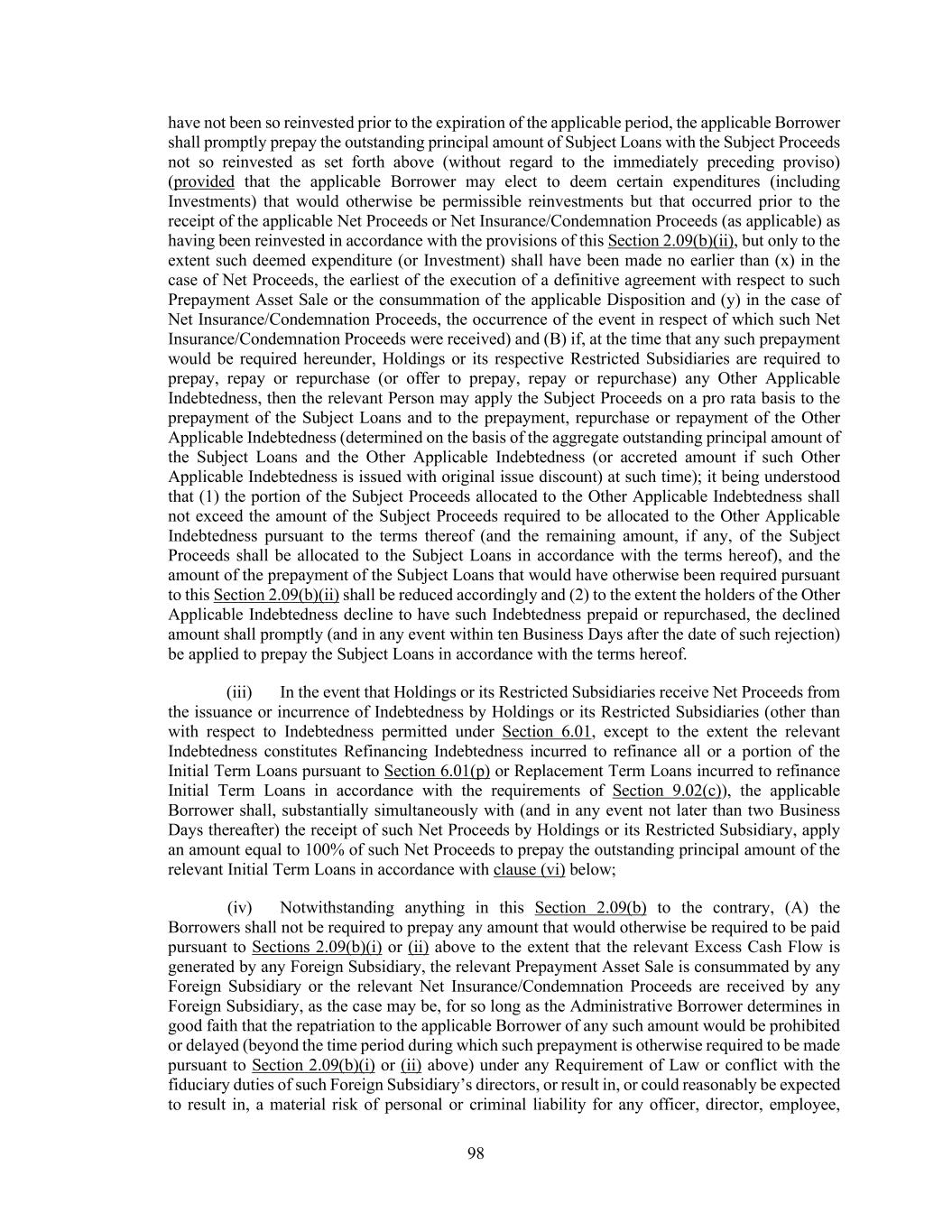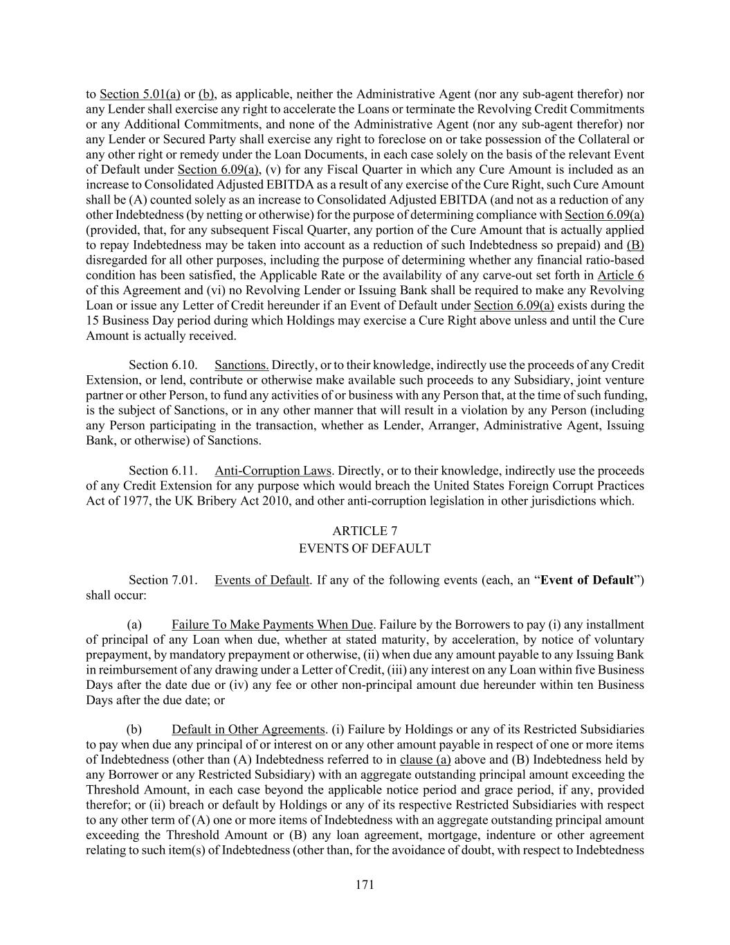 171 to Section 5.01(a) or (b), as applicable, neither the Administrative Agent (nor any sub-agent therefor) nor any Lender shall exercise any right to accelerate the Loans or terminate the Revolving Credit Commitments or any Additional Commitments, and none of the Administrative Agent (nor any sub-agent therefor) nor any Lender or Secured Party shall exercise any right to foreclose on or take possession of the Collateral or any other right or remedy under the Loan Documents, in each case solely on the basis of the relevant Event of Default under Section 6.09(a), (v) for any Fiscal Quarter in which any Cure Amount is included as an increase to Consolidated Adjusted EBITDA as a result of any exercise of the Cure Right, such Cure Amount shall be (A) counted solely as an increase to Consolidated Adjusted EBITDA (and not as a reduction of any other Indebtedness (by netting or otherwise) for the purpose of determining compliance with Section 6.09(a) (provided, that, for any subsequent Fiscal Quarter, any portion of the Cure Amount that is actually applied to repay Indebtedness may be taken into account as a reduction of such Indebtedness so prepaid) and (B) disregarded for all other purposes, including the purpose of determining whether any financial ratio-based condition has been satisfied, the Applicable Rate or the availability of any carve-out set forth in Article 6 of this Agreement and (vi) no Revolving Lender or Issuing Bank shall be required to make any Revolving Loan or issue any Letter of Credit hereunder if an Event of Default under Section 6.09(a) exists during the 15 Business Day period during which Holdings may exercise a Cure Right above unless and until the Cure Amount is actually received. Section 6.10. Sanctions. Directly, or to their knowledge, indirectly use the proceeds of any Credit Extension, or lend, contribute or otherwise make available such proceeds to any Subsidiary, joint venture partner or other Person, to fund any activities of or business with any Person that, at the time of such funding, is the subject of Sanctions, or in any other manner that will result in a violation by any Person (including any Person participating in the transaction, whether as Lender, Arranger, Administrative Agent, Issuing Bank, or otherwise) of Sanctions. Section 6.11. Anti-Corruption Laws. Directly, or to their knowledge, indirectly use the proceeds of any Credit Extension for any purpose which would breach the United States Foreign Corrupt Practices Act of 1977, the UK Bribery Act 2010, and other anti-corruption legislation in other jurisdictions which. ARTICLE 7 EVENTS OF DEFAULT Section 7.01. Events of Default. If any of the following events (each, an “Event of Default”) shall occur: (a) Failure To Make Payments When Due. Failure by the Borrowers to pay (i) any installment of principal of any Loan when due, whether at stated maturity, by acceleration, by notice of voluntary prepayment, by mandatory prepayment or otherwise, (ii) when due any amount payable to any Issuing Bank in reimbursement of any drawing under a Letter of Credit, (iii) any interest on any Loan within five Business Days after the date due or (iv) any fee or other non-principal amount due hereunder within ten Business Days after the due date; or (b) Default in Other Agreements. (i) Failure by Holdings or any of its Restricted Subsidiaries to pay when due any principal of or interest on or any other amount payable in respect of one or more items of Indebtedness (other than (A) Indebtedness referred to in clause (a) above and (B) Indebtedness held by any Borrower or any Restricted Subsidiary) with an aggregate outstanding principal amount exceeding the Threshold Amount, in each case beyond the applicable notice period and grace period, if any, provided therefor; or (ii) breach or default by Holdings or any of its respective Restricted Subsidiaries with respect to any other term of (A) one or more items of Indebtedness with an aggregate outstanding principal amount exceeding the Threshold Amount or (B) any loan agreement, mortgage, indenture or other agreement relating to such item(s) of Indebtedness (other than, for the avoidance of doubt, with respect to Indebtedness