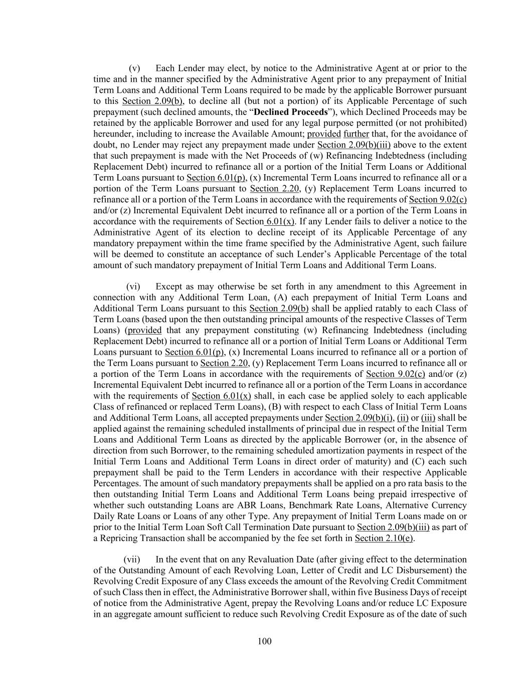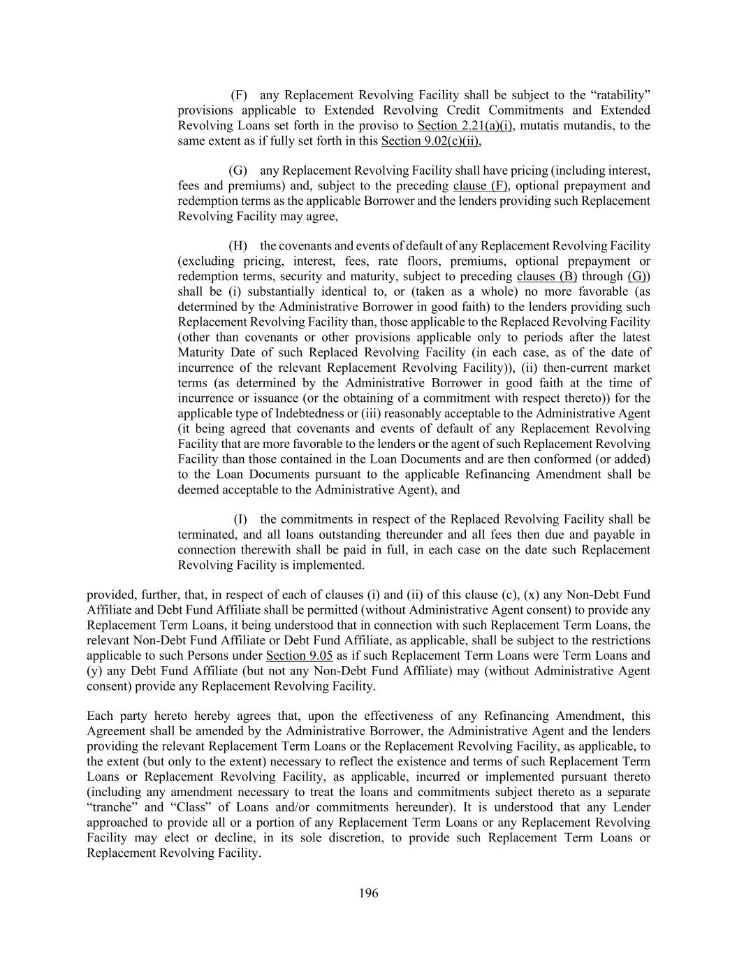 196 (F) any Replacement Revolving Facility shall be subject to the “ratability” provisions applicable to Extended Revolving Credit Commitments and Extended Revolving Loans set forth in the proviso to Section 2.21(a)(i), mutatis mutandis, to the same extent as if fully set forth in this Section 9.02(c)(ii), (G) any Replacement Revolving Facility shall have pricing (including interest, fees and premiums) and, subject to the preceding clause (F), optional prepayment and redemption terms as the applicable Borrower and the lenders providing such Replacement Revolving Facility may agree, (H) the covenants and events of default of any Replacement Revolving Facility (excluding pricing, interest, fees, rate floors, premiums, optional prepayment or redemption terms, security and maturity, subject to preceding clauses (B) through (G)) shall be (i) substantially identical to, or (taken as a whole) no more favorable (as determined by the Administrative Borrower in good faith) to the lenders providing such Replacement Revolving Facility than, those applicable to the Replaced Revolving Facility (other than covenants or other provisions applicable only to periods after the latest Maturity Date of such Replaced Revolving Facility (in each case, as of the date of incurrence of the relevant Replacement Revolving Facility)), (ii) then-current market terms (as determined by the Administrative Borrower in good faith at the time of incurrence or issuance (or the obtaining of a commitment with respect thereto)) for the applicable type of Indebtedness or (iii) reasonably acceptable to the Administrative Agent (it being agreed that covenants and events of default of any Replacement Revolving Facility that are more favorable to the lenders or the agent of such Replacement Revolving Facility than those contained in the Loan Documents and are then conformed (or added) to the Loan Documents pursuant to the applicable Refinancing Amendment shall be deemed acceptable to the Administrative Agent), and (I) the commitments in respect of the Replaced Revolving Facility shall be terminated, and all loans outstanding thereunder and all fees then due and payable in connection therewith shall be paid in full, in each case on the date such Replacement Revolving Facility is implemented. provided, further, that, in respect of each of clauses (i) and (ii) of this clause (c), (x) any Non-Debt Fund Affiliate and Debt Fund Affiliate shall be permitted (without Administrative Agent consent) to provide any Replacement Term Loans, it being understood that in connection with such Replacement Term Loans, the relevant Non-Debt Fund Affiliate or Debt Fund Affiliate, as applicable, shall be subject to the restrictions applicable to such Persons under Section 9.05 as if such Replacement Term Loans were Term Loans and (y) any Debt Fund Affiliate (but not any Non-Debt Fund Affiliate) may (without Administrative Agent consent) provide any Replacement Revolving Facility. Each party hereto hereby agrees that, upon the effectiveness of any Refinancing Amendment, this Agreement shall be amended by the Administrative Borrower, the Administrative Agent and the lenders providing the relevant Replacement Term Loans or the Replacement Revolving Facility, as applicable, to the extent (but only to the extent) necessary to reflect the existence and terms of such Replacement Term Loans or Replacement Revolving Facility, as applicable, incurred or implemented pursuant thereto (including any amendment necessary to treat the loans and commitments subject thereto as a separate “tranche” and “Class” of Loans and/or commitments hereunder). It is understood that any Lender approached to provide all or a portion of any Replacement Term Loans or any Replacement Revolving Facility may elect or decline, in its sole discretion, to provide such Replacement Term Loans or Replacement Revolving Facility.