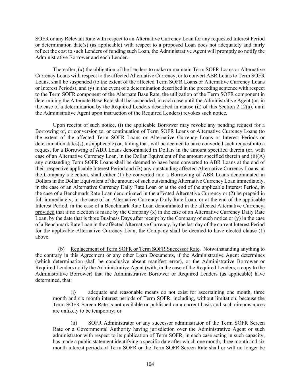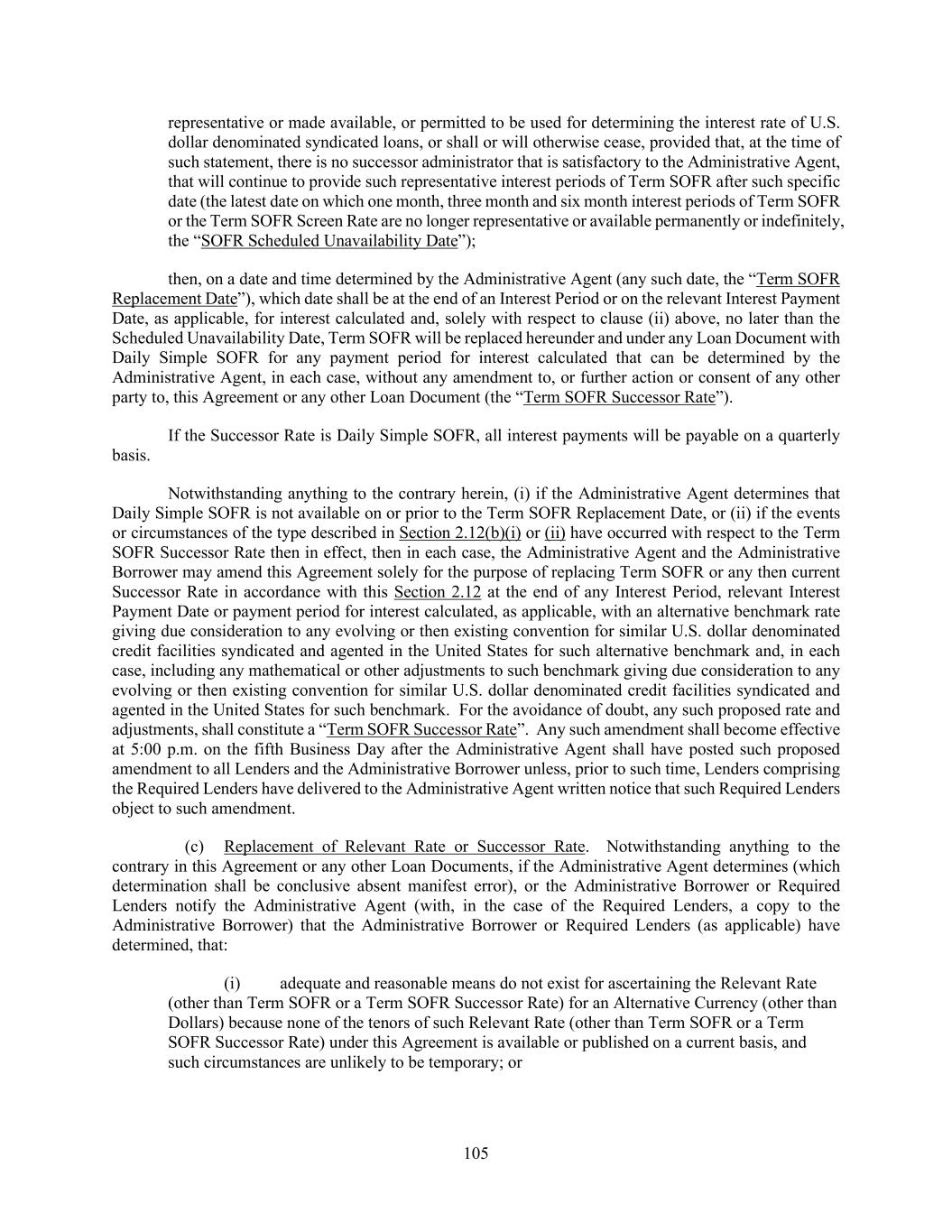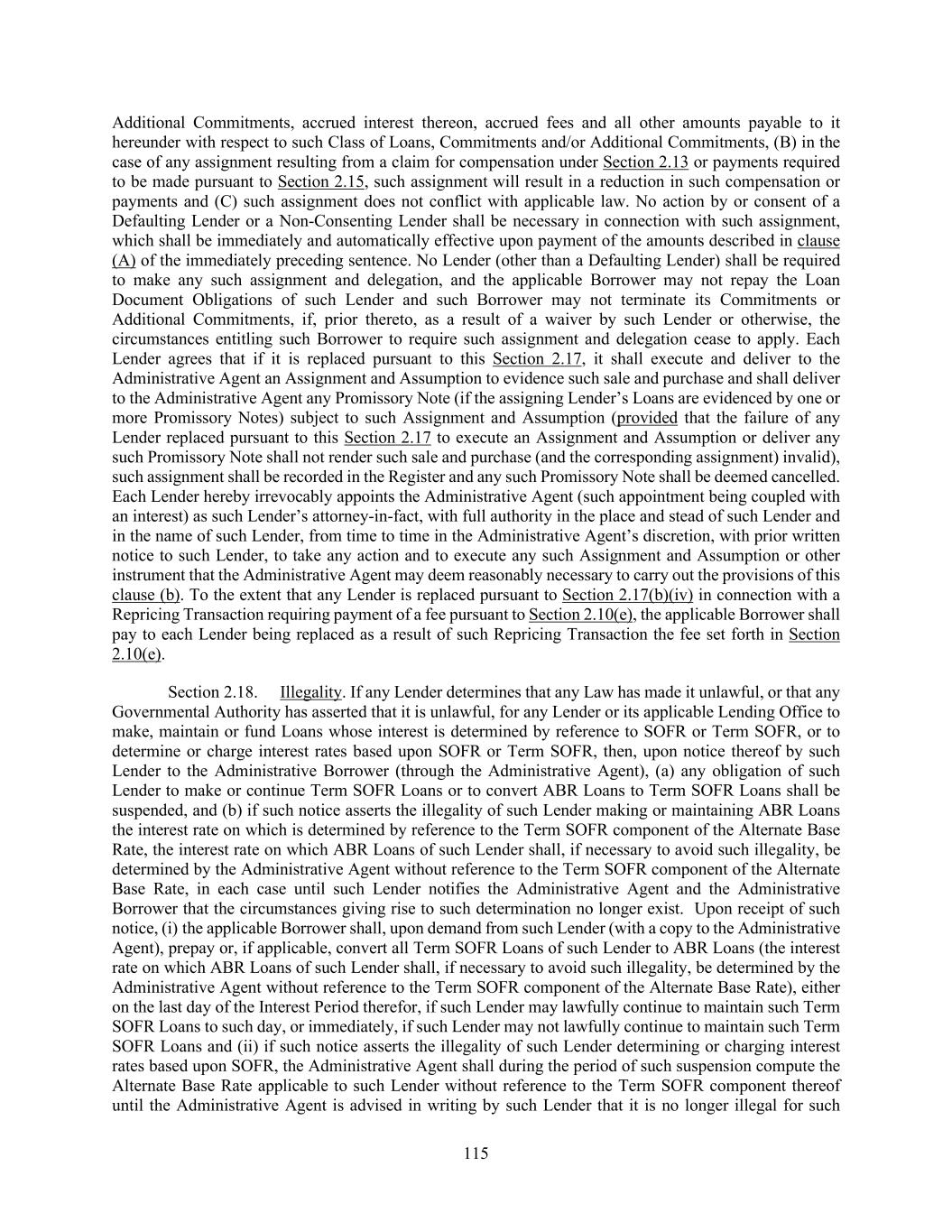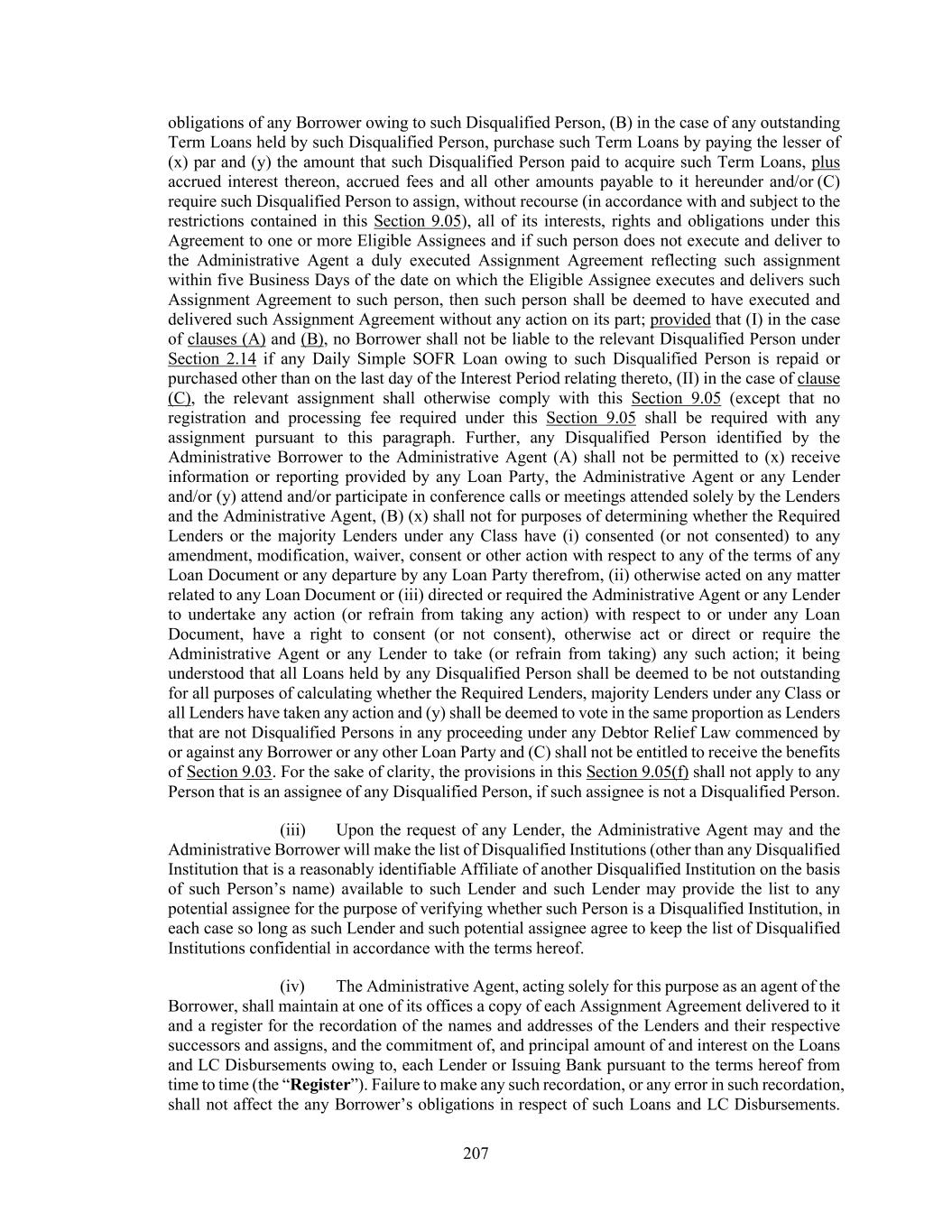 207 obligations of any Borrower owing to such Disqualified Person, (B) in the case of any outstanding Term Loans held by such Disqualified Person, purchase such Term Loans by paying the lesser of (x) par and (y) the amount that such Disqualified Person paid to acquire such Term Loans, plus accrued interest thereon, accrued fees and all other amounts payable to it hereunder and/or (C) require such Disqualified Person to assign, without recourse (in accordance with and subject to the restrictions contained in this Section 9.05), all of its interests, rights and obligations under this Agreement to one or more Eligible Assignees and if such person does not execute and deliver to the Administrative Agent a duly executed Assignment Agreement reflecting such assignment within five Business Days of the date on which the Eligible Assignee executes and delivers such Assignment Agreement to such person, then such person shall be deemed to have executed and delivered such Assignment Agreement without any action on its part; provided that (I) in the case of clauses (A) and (B), no Borrower shall not be liable to the relevant Disqualified Person under Section 2.14 if any Daily Simple SOFR Loan owing to such Disqualified Person is repaid or purchased other than on the last day of the Interest Period relating thereto, (II) in the case of clause (C), the relevant assignment shall otherwise comply with this Section 9.05 (except that no registration and processing fee required under this Section 9.05 shall be required with any assignment pursuant to this paragraph. Further, any Disqualified Person identified by the Administrative Borrower to the Administrative Agent (A) shall not be permitted to (x) receive information or reporting provided by any Loan Party, the Administrative Agent or any Lender and/or (y) attend and/or participate in conference calls or meetings attended solely by the Lenders and the Administrative Agent, (B) (x) shall not for purposes of determining whether the Required Lenders or the majority Lenders under any Class have (i) consented (or not consented) to any amendment, modification, waiver, consent or other action with respect to any of the terms of any Loan Document or any departure by any Loan Party therefrom, (ii) otherwise acted on any matter related to any Loan Document or (iii) directed or required the Administrative Agent or any Lender to undertake any action (or refrain from taking any action) with respect to or under any Loan Document, have a right to consent (or not consent), otherwise act or direct or require the Administrative Agent or any Lender to take (or refrain from taking) any such action; it being understood that all Loans held by any Disqualified Person shall be deemed to be not outstanding for all purposes of calculating whether the Required Lenders, majority Lenders under any Class or all Lenders have taken any action and (y) shall be deemed to vote in the same proportion as Lenders that are not Disqualified Persons in any proceeding under any Debtor Relief Law commenced by or against any Borrower or any other Loan Party and (C) shall not be entitled to receive the benefits of Section 9.03. For the sake of clarity, the provisions in this Section 9.05(f) shall not apply to any Person that is an assignee of any Disqualified Person, if such assignee is not a Disqualified Person. (iii) Upon the request of any Lender, the Administrative Agent may and the Administrative Borrower will make the list of Disqualified Institutions (other than any Disqualified Institution that is a reasonably identifiable Affiliate of another Disqualified Institution on the basis of such Person’s name) available to such Lender and such Lender may provide the list to any potential assignee for the purpose of verifying whether such Person is a Disqualified Institution, in each case so long as such Lender and such potential assignee agree to keep the list of Disqualified Institutions confidential in accordance with the terms hereof. (iv) The Administrative Agent, acting solely for this purpose as an agent of the Borrower, shall maintain at one of its offices a copy of each Assignment Agreement delivered to it and a register for the recordation of the names and addresses of the Lenders and their respective successors and assigns, and the commitment of, and principal amount of and interest on the Loans and LC Disbursements owing to, each Lender or Issuing Bank pursuant to the terms hereof from time to time (the “Register”). Failure to make any such recordation, or any error in such recordation, shall not affect the any Borrower’s obligations in respect of such Loans and LC Disbursements.