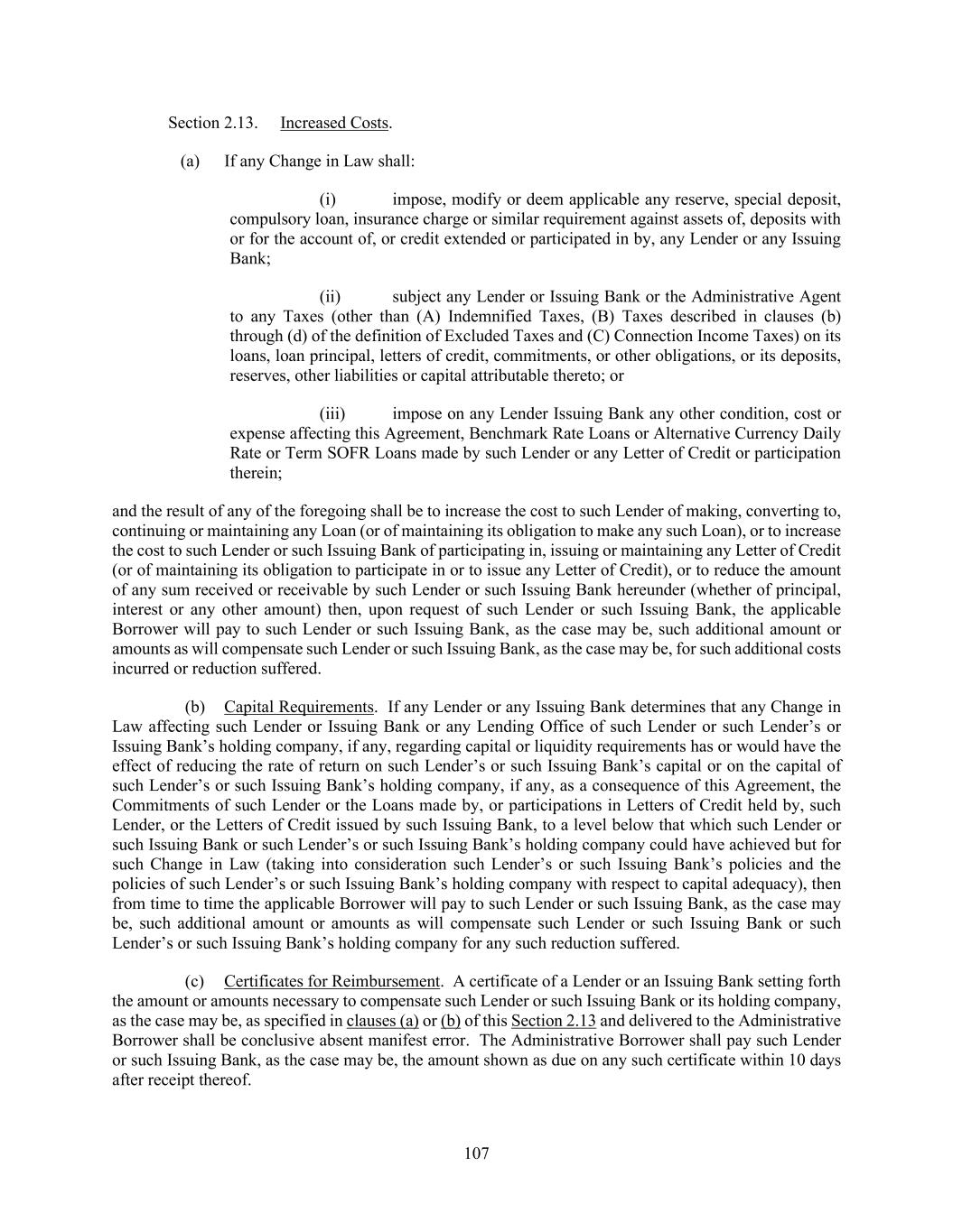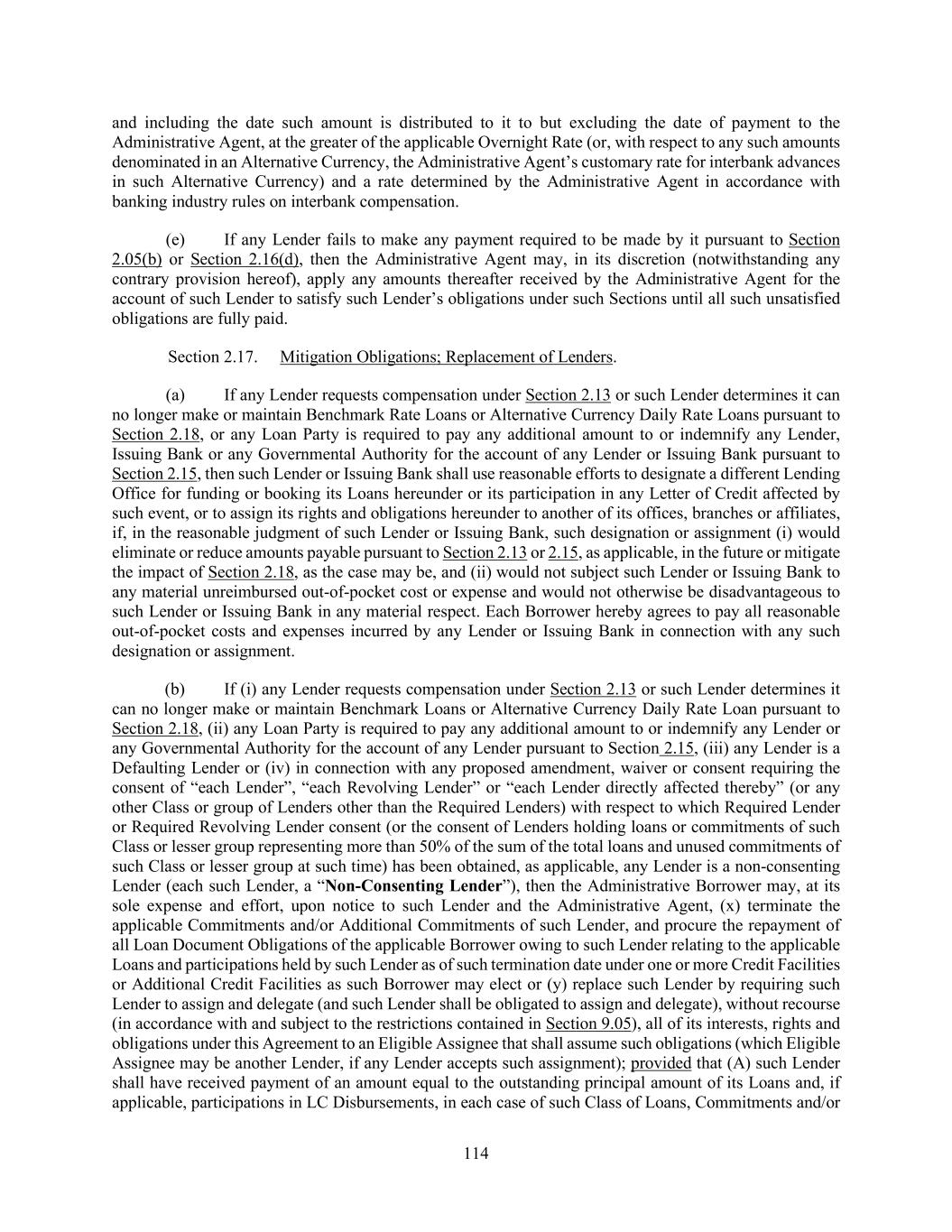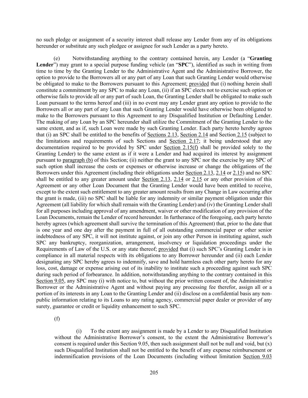 205 no such pledge or assignment of a security interest shall release any Lender from any of its obligations hereunder or substitute any such pledgee or assignee for such Lender as a party hereto. (e) Notwithstanding anything to the contrary contained herein, any Lender (a “Granting Lender”) may grant to a special purpose funding vehicle (an “SPC”), identified as such in writing from time to time by the Granting Lender to the Administrative Agent and the Administrative Borrower, the option to provide to the Borrowers all or any part of any Loan that such Granting Lender would otherwise be obligated to make to the Borrowers pursuant to this Agreement; provided that (i) nothing herein shall constitute a commitment by any SPC to make any Loan, (ii) if an SPC elects not to exercise such option or otherwise fails to provide all or any part of such Loan, the Granting Lender shall be obligated to make such Loan pursuant to the terms hereof and (iii) in no event may any Lender grant any option to provide to the Borrowers all or any part of any Loan that such Granting Lender would have otherwise been obligated to make to the Borrowers pursuant to this Agreement to any Disqualified Institution or Defaulting Lender. The making of any Loan by an SPC hereunder shall utilize the Commitment of the Granting Lender to the same extent, and as if, such Loan were made by such Granting Lender. Each party hereto hereby agrees that (i) an SPC shall be entitled to the benefits of Sections 2.13, Section 2.14 and Section 2.15 (subject to the limitations and requirements of such Sections and Section 2.17; it being understood that any documentation required to be provided by SPC under Section 2.15(f) shall be provided solely to the Granting Lender) to the same extent as if it were a Lender and had acquired its interest by assignment pursuant to paragraph (b) of this Section; (ii) neither the grant to any SPC nor the exercise by any SPC of such option shall increase the costs or expenses or otherwise increase or change the obligations of the Borrowers under this Agreement (including their obligations under Section 2.13, 2.14 or 2.15) and no SPC shall be entitled to any greater amount under Section 2.13, 2.14 or 2.15 or any other provision of this Agreement or any other Loan Document that the Granting Lender would have been entitled to receive, except to the extent such entitlement to any greater amount results from any Change in Law occurring after the grant is made, (iii) no SPC shall be liable for any indemnity or similar payment obligation under this Agreement (all liability for which shall remain with the Granting Lender) and (iv) the Granting Lender shall for all purposes including approval of any amendment, waiver or other modification of any provision of the Loan Documents, remain the Lender of record hereunder. In furtherance of the foregoing, each party hereto hereby agrees (which agreement shall survive the termination of this Agreement) that, prior to the date that is one year and one day after the payment in full of all outstanding commercial paper or other senior indebtedness of any SPC, it will not institute against, or join any other Person in instituting against, such SPC any bankruptcy, reorganization, arrangement, insolvency or liquidation proceedings under the Requirements of Law of the U.S. or any state thereof; provided that (i) such SPC’s Granting Lender is in compliance in all material respects with its obligations to any Borrower hereunder and (ii) each Lender designating any SPC hereby agrees to indemnify, save and hold harmless each other party hereto for any loss, cost, damage or expense arising out of its inability to institute such a proceeding against such SPC during such period of forbearance. In addition, notwithstanding anything to the contrary contained in this Section 9.05, any SPC may (i) with notice to, but without the prior written consent of, the Administrative Borrower or the Administrative Agent and without paying any processing fee therefor, assign all or a portion of its interests in any Loan to the Granting Lender and (ii) disclose on a confidential basis any non- public information relating to its Loans to any rating agency, commercial paper dealer or provider of any surety, guarantee or credit or liquidity enhancement to such SPC. (f) (i) To the extent any assignment is made by a Lender to any Disqualified Institution without the Administrative Borrower’s consent, to the extent the Administrative Borrower’s consent is required under this Section 9.05, then such assignment shall not be null and void, but (x) such Disqualified Institution shall not be entitled to the benefit of any expense reimbursement or indemnification provisions of the Loan Documents (including without limitation Section 9.03