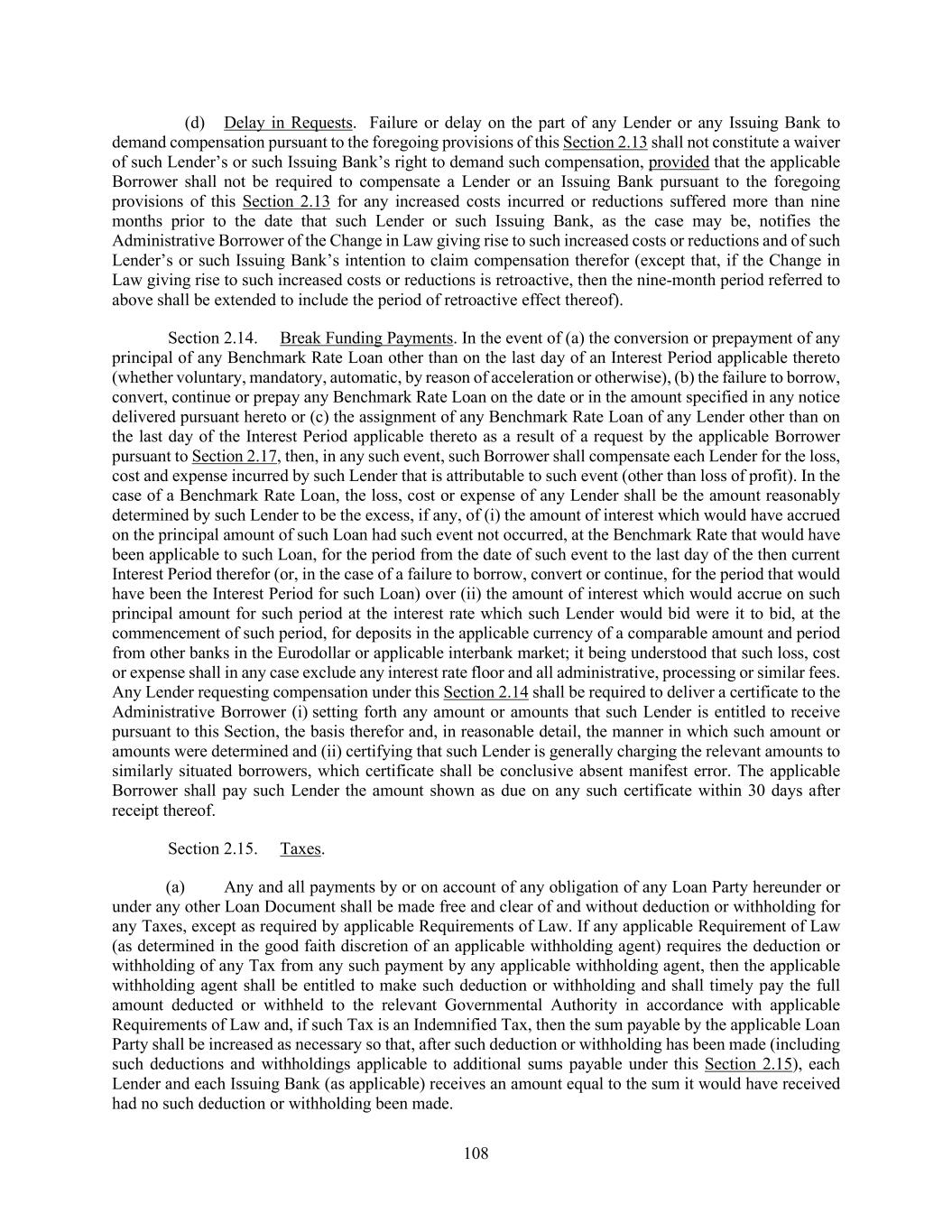 25 “Default” means any event or condition which upon notice, lapse of time or both would become an Event of Default. “Defaulting Lender” means any Lender that has (a) defaulted in its obligations under this Agreement, including without limitation, to make a Loan within two Business Days of the date required to be made by it hereunder or to fund its participation in a Letter of Credit required to be funded by it hereunder within two Business Days of the date such obligation arose or such Loan, Letter of Credit was required to be made or funded, (b) notified the Administrative Agent, any Issuing Bank or any Loan Party in writing that it does not intend to satisfy any such obligation or has made a public statement to the effect that it does not intend to comply with its funding obligations under this Agreement or under agreements in which it commits to extend credit generally (unless such writing or public statement relates to such Lender’s obligation to fund a Loan hereunder and states that such position is based on such Lender’s good faith determination that a condition precedent to funding (which condition precedent, together with any applicable default, shall be specifically identified in such writing or public statement) cannot be satisfied), (c) failed, within two Business Days after the request of the Administrative Agent or the Administrative Borrower, to confirm in writing that it will comply with the terms of this Agreement relating to its obligations to fund prospective Loans and participations in then outstanding Letters of Credit; provided that such Lender shall cease to be a Defaulting Lender pursuant to this clause (c) upon receipt of such written confirmation by the Administrative Agent, (d) become (or any parent company thereof has become) insolvent or been determined by any Governmental Authority having regulatory authority over such Person or its assets, to be insolvent, or the assets or management of which has been taken over by any Governmental Authority, (e) become (or any parent company thereof has become) the subject of a bankruptcy or insolvency proceeding, or has had a receiver, conservator, trustee, administrator, assignee for the benefit of creditors or similar Person charged with reorganization or liquidation of its business or custodian, appointed for it, or has taken any action in furtherance of, or indicating its consent to, approval of or acquiescence in, any such proceeding or appointment, unless in the case of any Lender subject to this clause (e), the Administrative Borrower and the Administrative Agent shall each have determined that such Lender intends, and has all approvals required to enable it (in form and substance satisfactory to the Administrative Borrower and the Administrative Agent), to continue to perform its obligations as a Lender hereunder or (f) become (or any parent company thereof has become) the subject of a Bail-In Action; provided that no Lender shall be deemed to be a Defaulting Lender solely by virtue of the ownership or acquisition of any Capital Stock in such Lender or its parent by any Governmental Authority; provided that such action does not result in or provide such Lender with immunity from the jurisdiction of courts within the U.S. or from the enforcement of judgments or writs of attachment on its assets or permit such Lender (or such Governmental Authority) to reject, repudiate, disavow or disaffirm any contract or agreement to which such Lender is a party. “Delaware Divided LLC” means any Delaware LLC formed upon the consummation of a Delaware LLC Division. “Delaware LLC” means any limited liability company organized or formed under the laws of the State of Delaware. “Delaware LLC Division” means the statutory division of any Delaware LLC into two or more Delaware LLCs pursuant to Section 18-217 of the Delaware Limited Liability Company Act. “Deposit Account” means a demand, time, savings, passbook or like account with a bank, savings and loan association, credit union or like organization, excluding, for the avoidance of doubt, any investment property (within the meaning of the UCC) or any account evidenced by an instrument or negotiable certificate of deposit (within the meaning of the UCC).