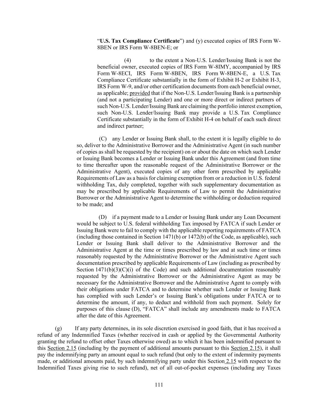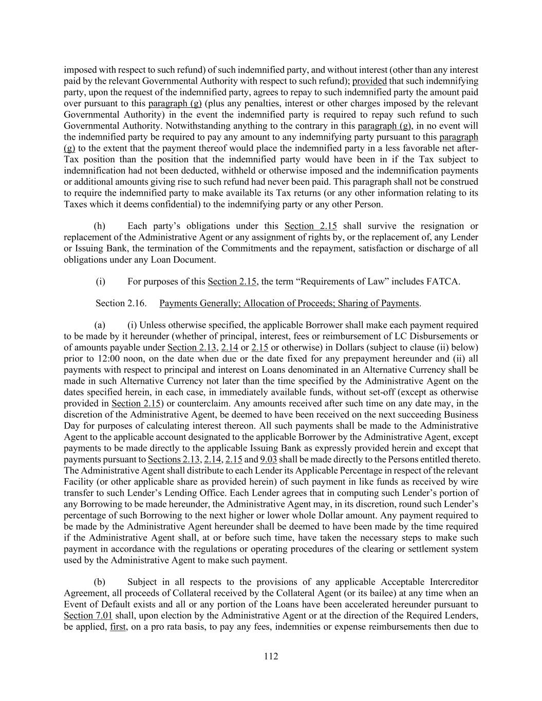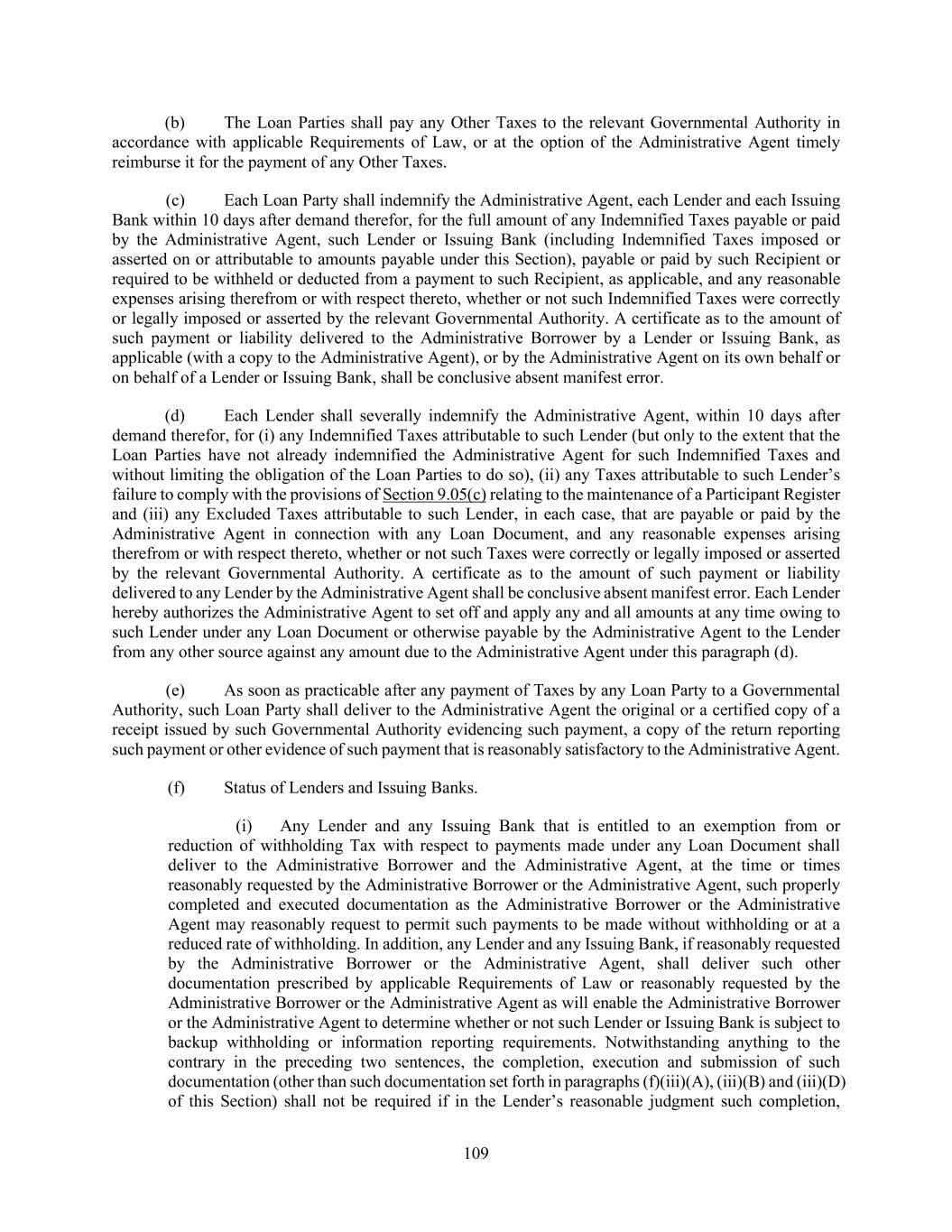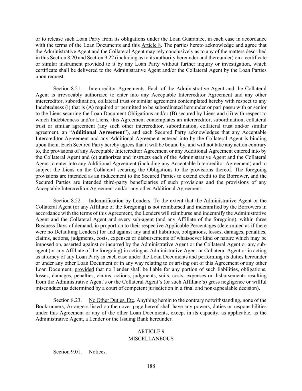 188 or to release such Loan Party from its obligations under the Loan Guarantee, in each case in accordance with the terms of the Loan Documents and this Article 8. The parties hereto acknowledge and agree that the Administrative Agent and the Collateral Agent may rely conclusively as to any of the matters described in this Section 8.20 and Section 9.22 (including as to its authority hereunder and thereunder) on a certificate or similar instrument provided to it by any Loan Party without further inquiry or investigation, which certificate shall be delivered to the Administrative Agent and/or the Collateral Agent by the Loan Parties upon request. Section 8.21. Intercreditor Agreements. Each of the Administrative Agent and the Collateral Agent is irrevocably authorized to enter into any Acceptable Intercreditor Agreement and any other intercreditor, subordination, collateral trust or similar agreement contemplated hereby with respect to any Indebtedness (i) that is (A) required or permitted to be subordinated hereunder or pari passu with or senior to the Liens securing the Loan Document Obligations and/or (B) secured by Liens and (ii) with respect to which Indebtedness and/or Liens, this Agreement contemplates an intercreditor, subordination, collateral trust or similar agreement (any such other intercreditor, subordination, collateral trust and/or similar agreement, an “Additional Agreement”), and each Secured Party acknowledges that any Acceptable Intercreditor Agreement and any Additional Agreement entered into by the Collateral Agent is binding upon them. Each Secured Party hereby agrees that it will be bound by, and will not take any action contrary to, the provisions of any Acceptable Intercreditor Agreement or any Additional Agreement entered into by the Collateral Agent and (c) authorizes and instructs each of the Administrative Agent and the Collateral Agent to enter into any Additional Agreement (including any Acceptable Intercreditor Agreement) and to subject the Liens on the Collateral securing the Obligations to the provisions thereof. The foregoing provisions are intended as an inducement to the Secured Parties to extend credit to the Borrower, and the Secured Parties are intended third-party beneficiaries of such provisions and the provisions of any Acceptable Intercreditor Agreement and/or any other Additional Agreement. Section 8.22. Indemnification by Lenders. To the extent that the Administrative Agent or the Collateral Agent (or any Affiliate of the foregoing) is not reimbursed and indemnified by the Borrowers in accordance with the terms of this Agreement, the Lenders will reimburse and indemnify the Administrative Agent and the Collateral Agent and every sub-agent (and any Affiliate of the foregoing), within three Business Days of demand, in proportion to their respective Applicable Percentages (determined as if there were no Defaulting Lenders) for and against any and all liabilities, obligations, losses, damages, penalties, claims, actions, judgments, costs, expenses or disbursements of whatsoever kind or nature which may be imposed on, asserted against or incurred by the Administrative Agent or the Collateral Agent or any sub- agent (or any Affiliate of the foregoing) in acting as Administrative Agent or Collateral Agent or in acting as attorney of any Loan Party in each case under the Loan Documents and performing its duties hereunder or under any other Loan Document or in any way relating to or arising out of this Agreement or any other Loan Document; provided that no Lender shall be liable for any portion of such liabilities, obligations, losses, damages, penalties, claims, actions, judgments, suits, costs, expenses or disbursements resulting from the Administrative Agent’s or the Collateral Agent’s (or such Affiliate’s) gross negligence or willful misconduct (as determined by a court of competent jurisdiction in a final and non-appealable decision). Section 8.23. No Other Duties, Etc. Anything herein to the contrary notwithstanding, none of the Bookrunners, Arrangers listed on the cover page hereof shall have any powers, duties or responsibilities under this Agreement or any of the other Loan Documents, except in its capacity, as applicable, as the Administrative Agent, a Lender or the Issuing Bank hereunder. ARTICLE 9 MISCELLANEOUS Section 9.01. Notices.