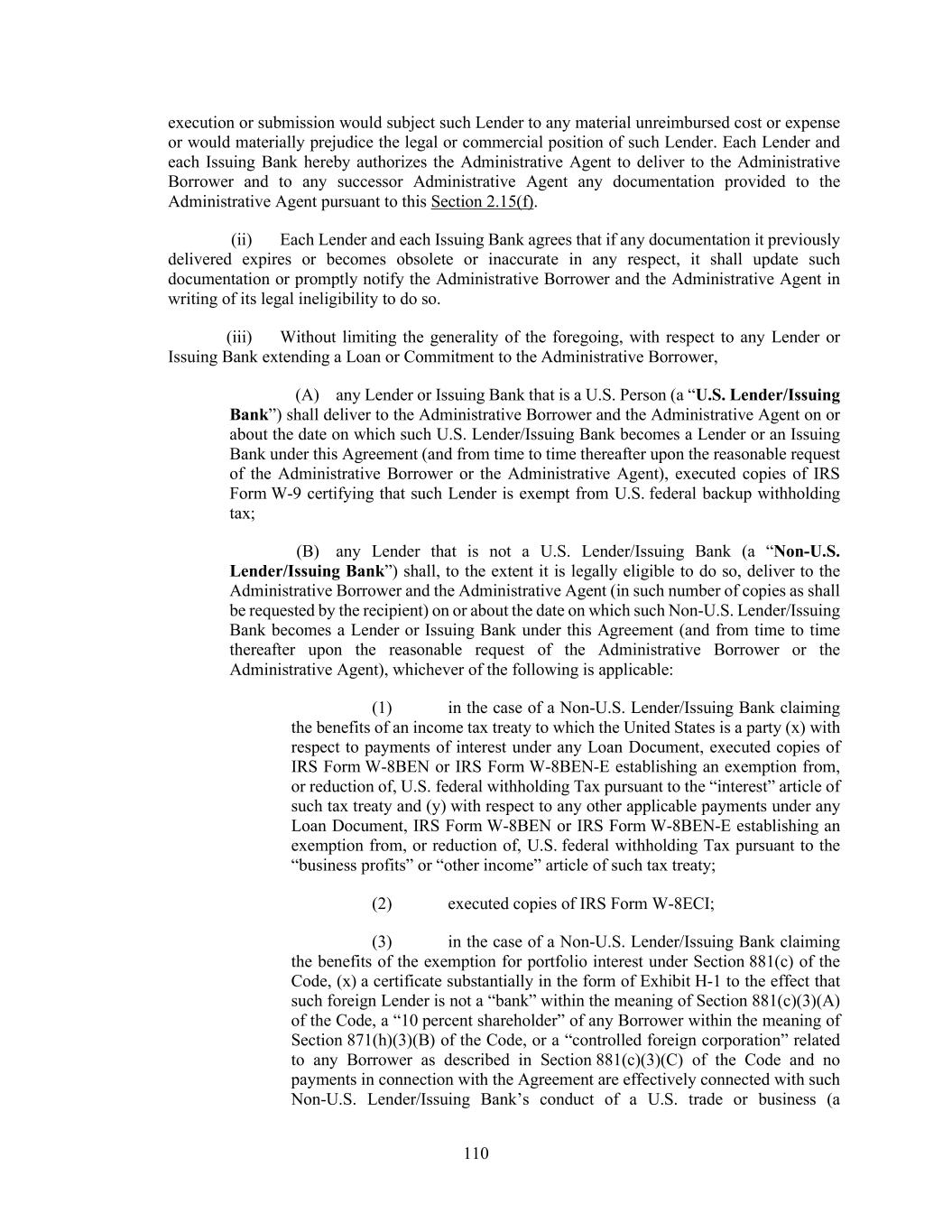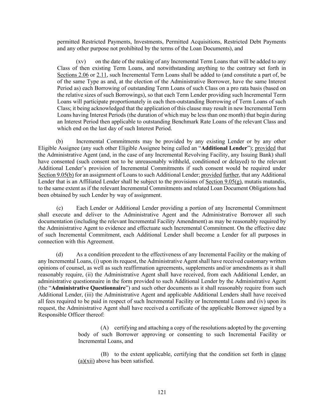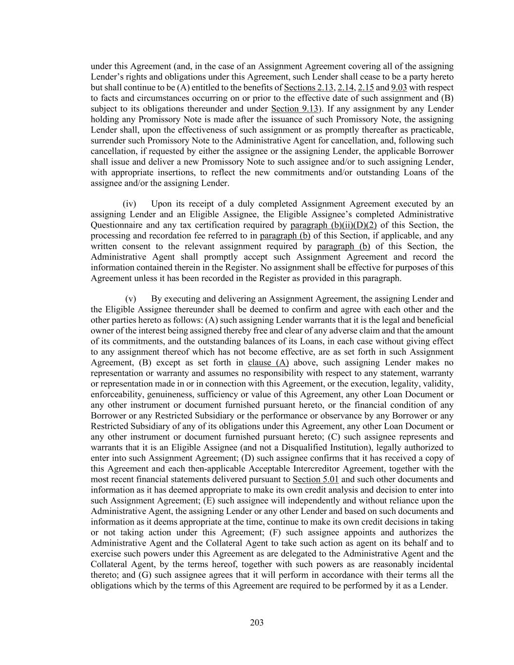 203 under this Agreement (and, in the case of an Assignment Agreement covering all of the assigning Lender’s rights and obligations under this Agreement, such Lender shall cease to be a party hereto but shall continue to be (A) entitled to the benefits of Sections 2.13, 2.14, 2.15 and 9.03 with respect to facts and circumstances occurring on or prior to the effective date of such assignment and (B) subject to its obligations thereunder and under Section 9.13). If any assignment by any Lender holding any Promissory Note is made after the issuance of such Promissory Note, the assigning Lender shall, upon the effectiveness of such assignment or as promptly thereafter as practicable, surrender such Promissory Note to the Administrative Agent for cancellation, and, following such cancellation, if requested by either the assignee or the assigning Lender, the applicable Borrower shall issue and deliver a new Promissory Note to such assignee and/or to such assigning Lender, with appropriate insertions, to reflect the new commitments and/or outstanding Loans of the assignee and/or the assigning Lender. (iv) Upon its receipt of a duly completed Assignment Agreement executed by an assigning Lender and an Eligible Assignee, the Eligible Assignee’s completed Administrative Questionnaire and any tax certification required by paragraph (b)(ii)(D)(2) of this Section, the processing and recordation fee referred to in paragraph (b) of this Section, if applicable, and any written consent to the relevant assignment required by paragraph (b) of this Section, the Administrative Agent shall promptly accept such Assignment Agreement and record the information contained therein in the Register. No assignment shall be effective for purposes of this Agreement unless it has been recorded in the Register as provided in this paragraph. (v) By executing and delivering an Assignment Agreement, the assigning Lender and the Eligible Assignee thereunder shall be deemed to confirm and agree with each other and the other parties hereto as follows: (A) such assigning Lender warrants that it is the legal and beneficial owner of the interest being assigned thereby free and clear of any adverse claim and that the amount of its commitments, and the outstanding balances of its Loans, in each case without giving effect to any assignment thereof which has not become effective, are as set forth in such Assignment Agreement, (B) except as set forth in clause (A) above, such assigning Lender makes no representation or warranty and assumes no responsibility with respect to any statement, warranty or representation made in or in connection with this Agreement, or the execution, legality, validity, enforceability, genuineness, sufficiency or value of this Agreement, any other Loan Document or any other instrument or document furnished pursuant hereto, or the financial condition of any Borrower or any Restricted Subsidiary or the performance or observance by any Borrower or any Restricted Subsidiary of any of its obligations under this Agreement, any other Loan Document or any other instrument or document furnished pursuant hereto; (C) such assignee represents and warrants that it is an Eligible Assignee (and not a Disqualified Institution), legally authorized to enter into such Assignment Agreement; (D) such assignee confirms that it has received a copy of this Agreement and each then-applicable Acceptable Intercreditor Agreement, together with the most recent financial statements delivered pursuant to Section 5.01 and such other documents and information as it has deemed appropriate to make its own credit analysis and decision to enter into such Assignment Agreement; (E) such assignee will independently and without reliance upon the Administrative Agent, the assigning Lender or any other Lender and based on such documents and information as it deems appropriate at the time, continue to make its own credit decisions in taking or not taking action under this Agreement; (F) such assignee appoints and authorizes the Administrative Agent and the Collateral Agent to take such action as agent on its behalf and to exercise such powers under this Agreement as are delegated to the Administrative Agent and the Collateral Agent, by the terms hereof, together with such powers as are reasonably incidental thereto; and (G) such assignee agrees that it will perform in accordance with their terms all the obligations which by the terms of this Agreement are required to be performed by it as a Lender.