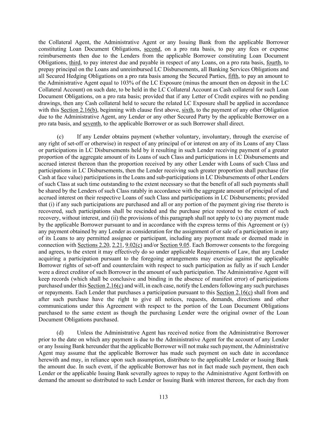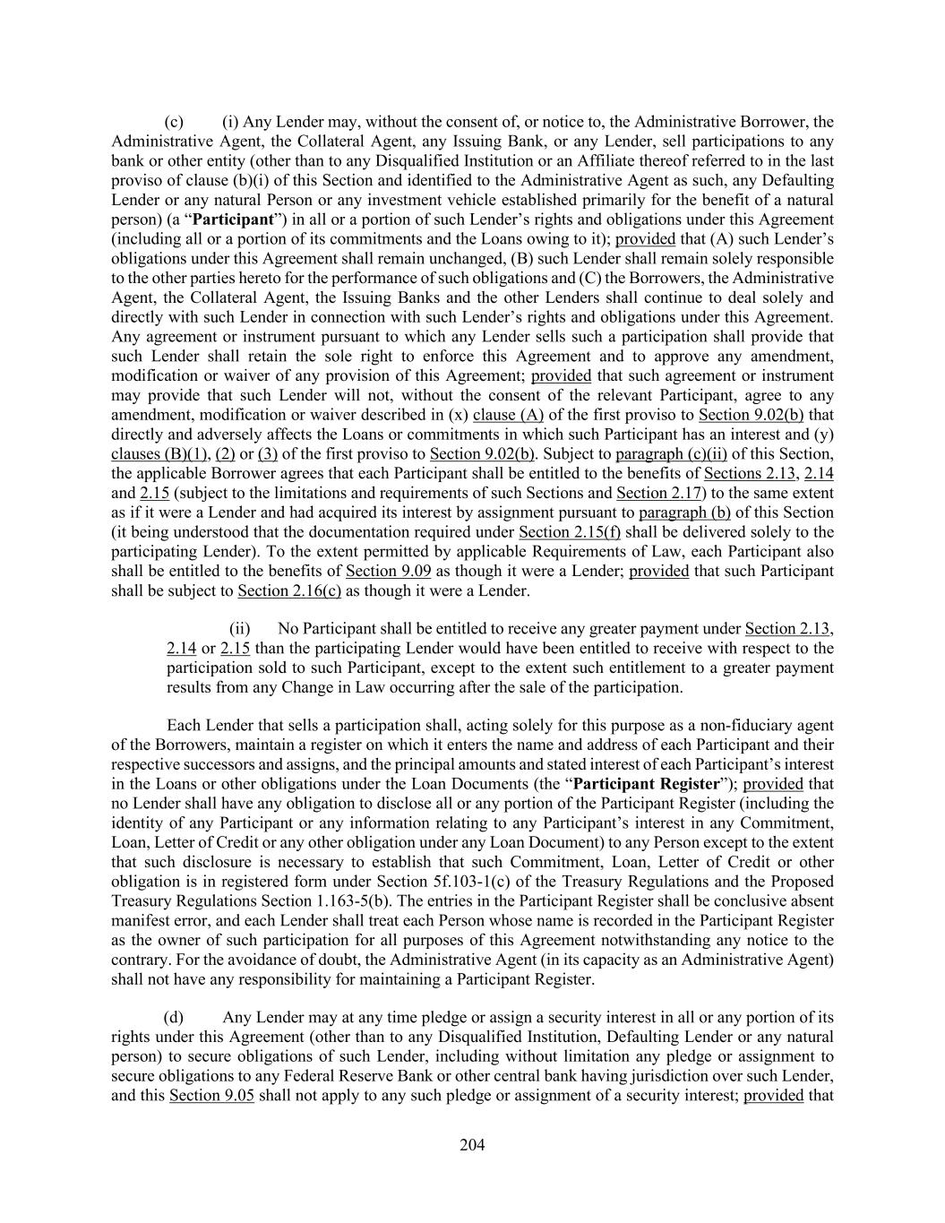 204 (c) (i) Any Lender may, without the consent of, or notice to, the Administrative Borrower, the Administrative Agent, the Collateral Agent, any Issuing Bank, or any Lender, sell participations to any bank or other entity (other than to any Disqualified Institution or an Affiliate thereof referred to in the last proviso of clause (b)(i) of this Section and identified to the Administrative Agent as such, any Defaulting Lender or any natural Person or any investment vehicle established primarily for the benefit of a natural person) (a “Participant”) in all or a portion of such Lender’s rights and obligations under this Agreement (including all or a portion of its commitments and the Loans owing to it); provided that (A) such Lender’s obligations under this Agreement shall remain unchanged, (B) such Lender shall remain solely responsible to the other parties hereto for the performance of such obligations and (C) the Borrowers, the Administrative Agent, the Collateral Agent, the Issuing Banks and the other Lenders shall continue to deal solely and directly with such Lender in connection with such Lender’s rights and obligations under this Agreement. Any agreement or instrument pursuant to which any Lender sells such a participation shall provide that such Lender shall retain the sole right to enforce this Agreement and to approve any amendment, modification or waiver of any provision of this Agreement; provided that such agreement or instrument may provide that such Lender will not, without the consent of the relevant Participant, agree to any amendment, modification or waiver described in (x) clause (A) of the first proviso to Section 9.02(b) that directly and adversely affects the Loans or commitments in which such Participant has an interest and (y) clauses (B)(1), (2) or (3) of the first proviso to Section 9.02(b). Subject to paragraph (c)(ii) of this Section, the applicable Borrower agrees that each Participant shall be entitled to the benefits of Sections 2.13, 2.14 and 2.15 (subject to the limitations and requirements of such Sections and Section 2.17) to the same extent as if it were a Lender and had acquired its interest by assignment pursuant to paragraph (b) of this Section (it being understood that the documentation required under Section 2.15(f) shall be delivered solely to the participating Lender). To the extent permitted by applicable Requirements of Law, each Participant also shall be entitled to the benefits of Section 9.09 as though it were a Lender; provided that such Participant shall be subject to Section 2.16(c) as though it were a Lender. (ii) No Participant shall be entitled to receive any greater payment under Section 2.13, 2.14 or 2.15 than the participating Lender would have been entitled to receive with respect to the participation sold to such Participant, except to the extent such entitlement to a greater payment results from any Change in Law occurring after the sale of the participation. Each Lender that sells a participation shall, acting solely for this purpose as a non-fiduciary agent of the Borrowers, maintain a register on which it enters the name and address of each Participant and their respective successors and assigns, and the principal amounts and stated interest of each Participant’s interest in the Loans or other obligations under the Loan Documents (the “Participant Register”); provided that no Lender shall have any obligation to disclose all or any portion of the Participant Register (including the identity of any Participant or any information relating to any Participant’s interest in any Commitment, Loan, Letter of Credit or any other obligation under any Loan Document) to any Person except to the extent that such disclosure is necessary to establish that such Commitment, Loan, Letter of Credit or other obligation is in registered form under Section 5f.103-1(c) of the Treasury Regulations and the Proposed Treasury Regulations Section 1.163-5(b). The entries in the Participant Register shall be conclusive absent manifest error, and each Lender shall treat each Person whose name is recorded in the Participant Register as the owner of such participation for all purposes of this Agreement notwithstanding any notice to the contrary. For the avoidance of doubt, the Administrative Agent (in its capacity as an Administrative Agent) shall not have any responsibility for maintaining a Participant Register. (d) Any Lender may at any time pledge or assign a security interest in all or any portion of its rights under this Agreement (other than to any Disqualified Institution, Defaulting Lender or any natural person) to secure obligations of such Lender, including without limitation any pledge or assignment to secure obligations to any Federal Reserve Bank or other central bank having jurisdiction over such Lender, and this Section 9.05 shall not apply to any such pledge or assignment of a security interest; provided that