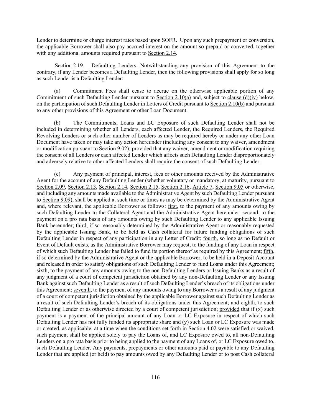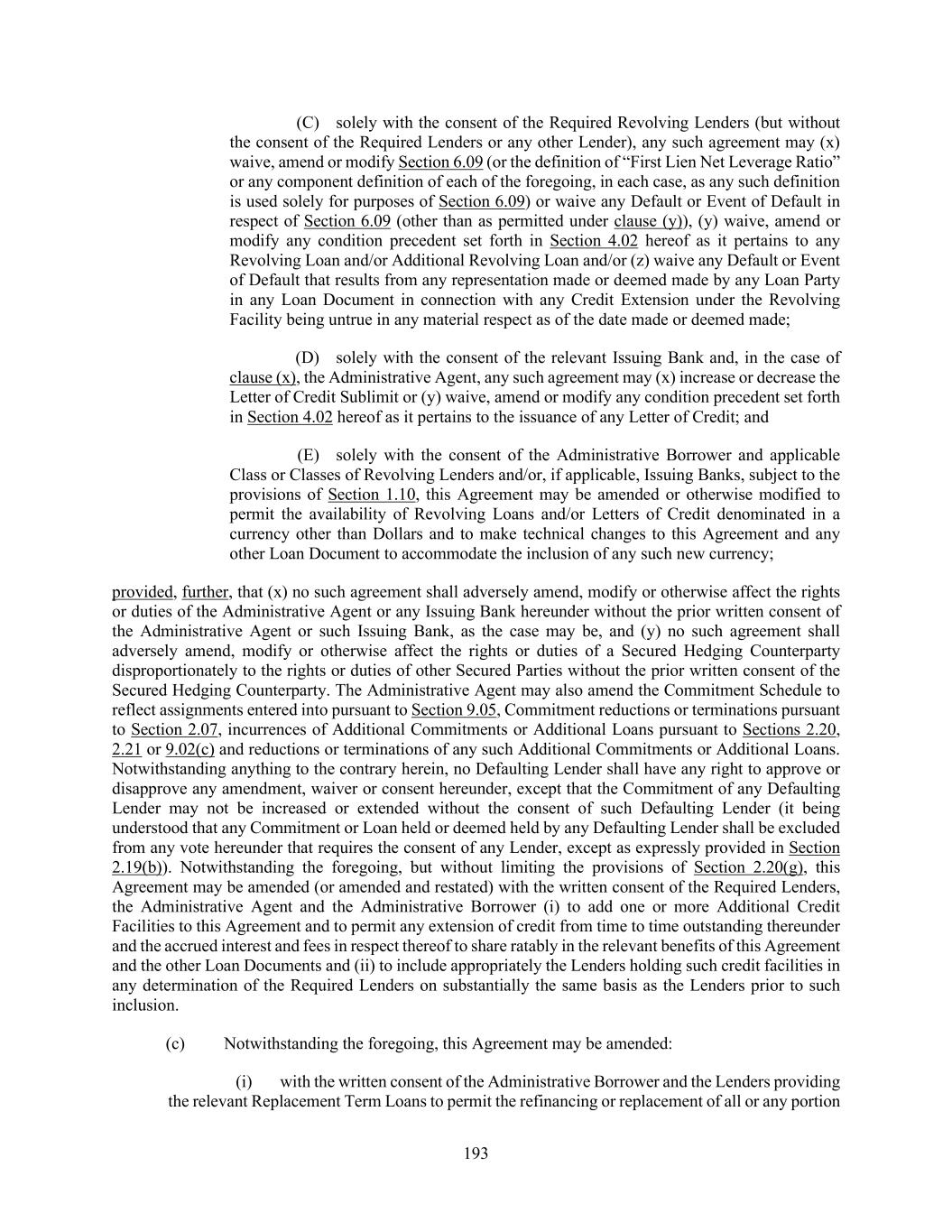 193 (C) solely with the consent of the Required Revolving Lenders (but without the consent of the Required Lenders or any other Lender), any such agreement may (x) waive, amend or modify Section 6.09 (or the definition of “First Lien Net Leverage Ratio” or any component definition of each of the foregoing, in each case, as any such definition is used solely for purposes of Section 6.09) or waive any Default or Event of Default in respect of Section 6.09 (other than as permitted under clause (y)), (y) waive, amend or modify any condition precedent set forth in Section 4.02 hereof as it pertains to any Revolving Loan and/or Additional Revolving Loan and/or (z) waive any Default or Event of Default that results from any representation made or deemed made by any Loan Party in any Loan Document in connection with any Credit Extension under the Revolving Facility being untrue in any material respect as of the date made or deemed made; (D) solely with the consent of the relevant Issuing Bank and, in the case of clause (x), the Administrative Agent, any such agreement may (x) increase or decrease the Letter of Credit Sublimit or (y) waive, amend or modify any condition precedent set forth in Section 4.02 hereof as it pertains to the issuance of any Letter of Credit; and (E) solely with the consent of the Administrative Borrower and applicable Class or Classes of Revolving Lenders and/or, if applicable, Issuing Banks, subject to the provisions of Section 1.10, this Agreement may be amended or otherwise modified to permit the availability of Revolving Loans and/or Letters of Credit denominated in a currency other than Dollars and to make technical changes to this Agreement and any other Loan Document to accommodate the inclusion of any such new currency; provided, further, that (x) no such agreement shall adversely amend, modify or otherwise affect the rights or duties of the Administrative Agent or any Issuing Bank hereunder without the prior written consent of the Administrative Agent or such Issuing Bank, as the case may be, and (y) no such agreement shall adversely amend, modify or otherwise affect the rights or duties of a Secured Hedging Counterparty disproportionately to the rights or duties of other Secured Parties without the prior written consent of the Secured Hedging Counterparty. The Administrative Agent may also amend the Commitment Schedule to reflect assignments entered into pursuant to Section 9.05, Commitment reductions or terminations pursuant to Section 2.07, incurrences of Additional Commitments or Additional Loans pursuant to Sections 2.20, 2.21 or 9.02(c) and reductions or terminations of any such Additional Commitments or Additional Loans. Notwithstanding anything to the contrary herein, no Defaulting Lender shall have any right to approve or disapprove any amendment, waiver or consent hereunder, except that the Commitment of any Defaulting Lender may not be increased or extended without the consent of such Defaulting Lender (it being understood that any Commitment or Loan held or deemed held by any Defaulting Lender shall be excluded from any vote hereunder that requires the consent of any Lender, except as expressly provided in Section 2.19(b)). Notwithstanding the foregoing, but without limiting the provisions of Section 2.20(g), this Agreement may be amended (or amended and restated) with the written consent of the Required Lenders, the Administrative Agent and the Administrative Borrower (i) to add one or more Additional Credit Facilities to this Agreement and to permit any extension of credit from time to time outstanding thereunder and the accrued interest and fees in respect thereof to share ratably in the relevant benefits of this Agreement and the other Loan Documents and (ii) to include appropriately the Lenders holding such credit facilities in any determination of the Required Lenders on substantially the same basis as the Lenders prior to such inclusion. (c) Notwithstanding the foregoing, this Agreement may be amended: (i) with the written consent of the Administrative Borrower and the Lenders providing the relevant Replacement Term Loans to permit the refinancing or replacement of all or any portion