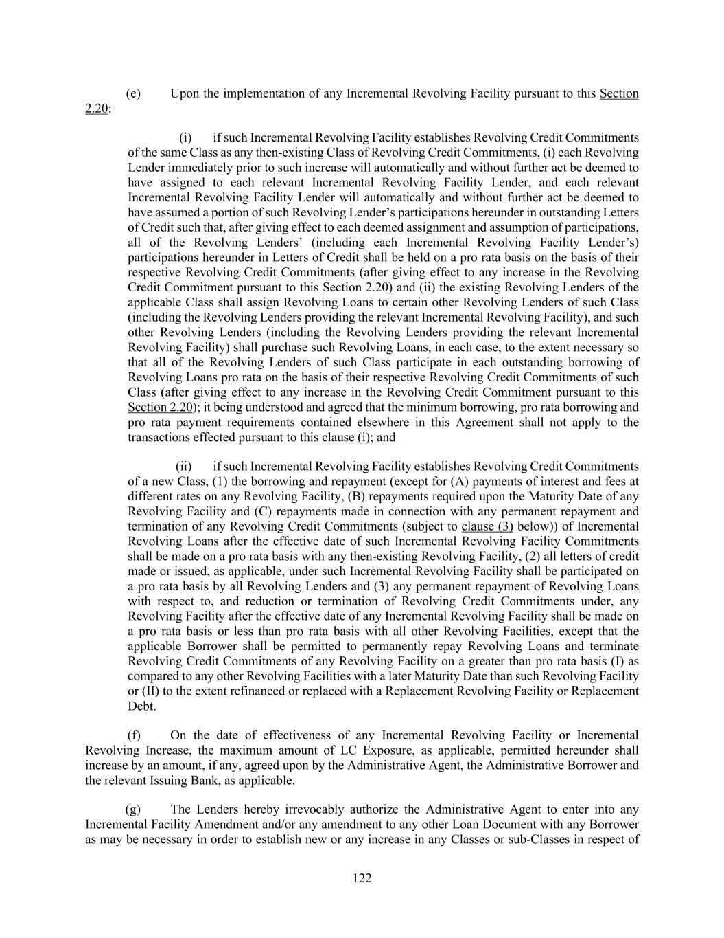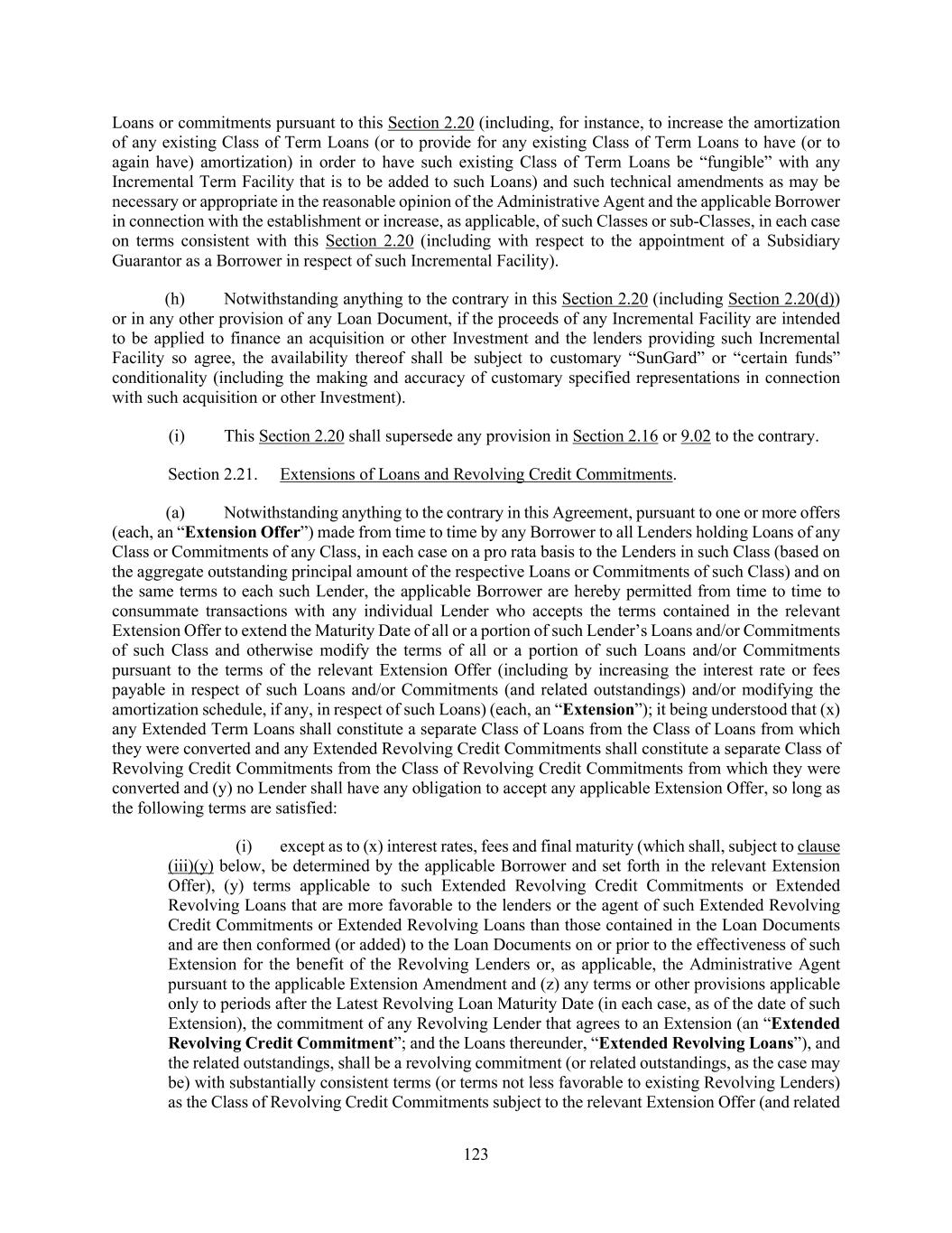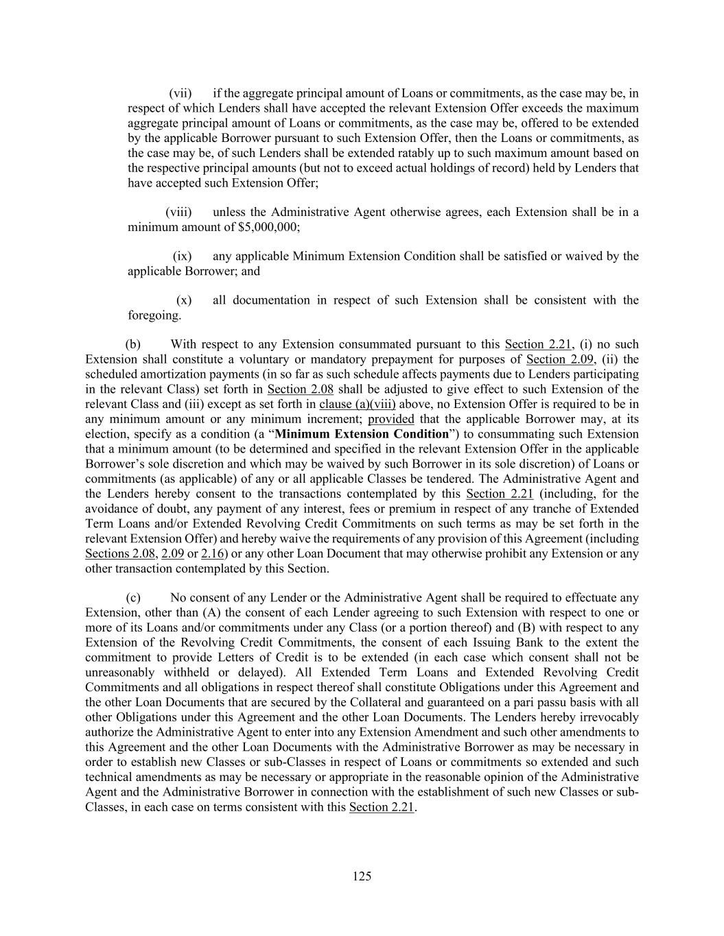125 (vii) if the aggregate principal amount of Loans or commitments, as the case may be, in respect of which Lenders shall have accepted the relevant Extension Offer exceeds the maximum aggregate principal amount of Loans or commitments, as the case may be, offered to be extended by the applicable Borrower pursuant to such Extension Offer, then the Loans or commitments, as the case may be, of such Lenders shall be extended ratably up to such maximum amount based on the respective principal amounts (but not to exceed actual holdings of record) held by Lenders that have accepted such Extension Offer; (viii) unless the Administrative Agent otherwise agrees, each Extension shall be in a minimum amount of $5,000,000; (ix) any applicable Minimum Extension Condition shall be satisfied or waived by the applicable Borrower; and (x) all documentation in respect of such Extension shall be consistent with the foregoing. (b) With respect to any Extension consummated pursuant to this Section 2.21, (i) no such Extension shall constitute a voluntary or mandatory prepayment for purposes of Section 2.09, (ii) the scheduled amortization payments (in so far as such schedule affects payments due to Lenders participating in the relevant Class) set forth in Section 2.08 shall be adjusted to give effect to such Extension of the relevant Class and (iii) except as set forth in clause (a)(viii) above, no Extension Offer is required to be in any minimum amount or any minimum increment; provided that the applicable Borrower may, at its election, specify as a condition (a “Minimum Extension Condition”) to consummating such Extension that a minimum amount (to be determined and specified in the relevant Extension Offer in the applicable Borrower’s sole discretion and which may be waived by such Borrower in its sole discretion) of Loans or commitments (as applicable) of any or all applicable Classes be tendered. The Administrative Agent and the Lenders hereby consent to the transactions contemplated by this Section 2.21 (including, for the avoidance of doubt, any payment of any interest, fees or premium in respect of any tranche of Extended Term Loans and/or Extended Revolving Credit Commitments on such terms as may be set forth in the relevant Extension Offer) and hereby waive the requirements of any provision of this Agreement (including Sections 2.08, 2.09 or 2.16) or any other Loan Document that may otherwise prohibit any Extension or any other transaction contemplated by this Section. (c) No consent of any Lender or the Administrative Agent shall be required to effectuate any Extension, other than (A) the consent of each Lender agreeing to such Extension with respect to one or more of its Loans and/or commitments under any Class (or a portion thereof) and (B) with respect to any Extension of the Revolving Credit Commitments, the consent of each Issuing Bank to the extent the commitment to provide Letters of Credit is to be extended (in each case which consent shall not be unreasonably withheld or delayed). All Extended Term Loans and Extended Revolving Credit Commitments and all obligations in respect thereof shall constitute Obligations under this Agreement and the other Loan Documents that are secured by the Collateral and guaranteed on a pari passu basis with all other Obligations under this Agreement and the other Loan Documents. The Lenders hereby irrevocably authorize the Administrative Agent to enter into any Extension Amendment and such other amendments to this Agreement and the other Loan Documents with the Administrative Borrower as may be necessary in order to establish new Classes or sub-Classes in respect of Loans or commitments so extended and such technical amendments as may be necessary or appropriate in the reasonable opinion of the Administrative Agent and the Administrative Borrower in connection with the establishment of such new Classes or sub- Classes, in each case on terms consistent with this Section 2.21.