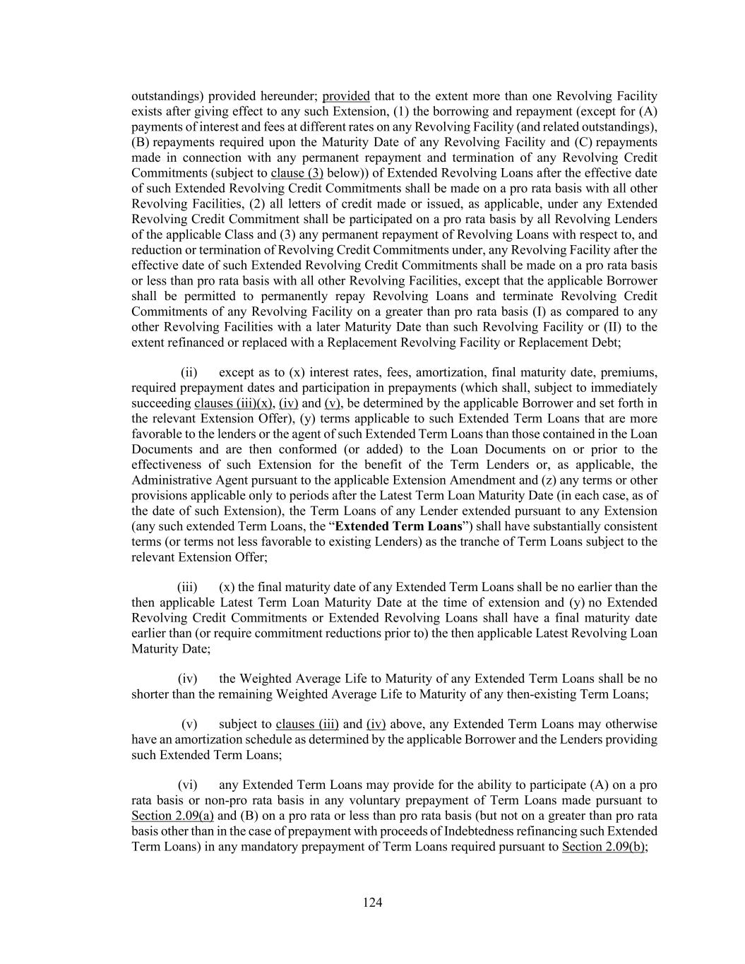 124 outstandings) provided hereunder; provided that to the extent more than one Revolving Facility exists after giving effect to any such Extension, (1) the borrowing and repayment (except for (A) payments of interest and fees at different rates on any Revolving Facility (and related outstandings), (B) repayments required upon the Maturity Date of any Revolving Facility and (C) repayments made in connection with any permanent repayment and termination of any Revolving Credit Commitments (subject to clause (3) below)) of Extended Revolving Loans after the effective date of such Extended Revolving Credit Commitments shall be made on a pro rata basis with all other Revolving Facilities, (2) all letters of credit made or issued, as applicable, under any Extended Revolving Credit Commitment shall be participated on a pro rata basis by all Revolving Lenders of the applicable Class and (3) any permanent repayment of Revolving Loans with respect to, and reduction or termination of Revolving Credit Commitments under, any Revolving Facility after the effective date of such Extended Revolving Credit Commitments shall be made on a pro rata basis or less than pro rata basis with all other Revolving Facilities, except that the applicable Borrower shall be permitted to permanently repay Revolving Loans and terminate Revolving Credit Commitments of any Revolving Facility on a greater than pro rata basis (I) as compared to any other Revolving Facilities with a later Maturity Date than such Revolving Facility or (II) to the extent refinanced or replaced with a Replacement Revolving Facility or Replacement Debt; (ii) except as to (x) interest rates, fees, amortization, final maturity date, premiums, required prepayment dates and participation in prepayments (which shall, subject to immediately succeeding clauses (iii)(x), (iv) and (v), be determined by the applicable Borrower and set forth in the relevant Extension Offer), (y) terms applicable to such Extended Term Loans that are more favorable to the lenders or the agent of such Extended Term Loans than those contained in the Loan Documents and are then conformed (or added) to the Loan Documents on or prior to the effectiveness of such Extension for the benefit of the Term Lenders or, as applicable, the Administrative Agent pursuant to the applicable Extension Amendment and (z) any terms or other provisions applicable only to periods after the Latest Term Loan Maturity Date (in each case, as of the date of such Extension), the Term Loans of any Lender extended pursuant to any Extension (any such extended Term Loans, the “Extended Term Loans”) shall have substantially consistent terms (or terms not less favorable to existing Lenders) as the tranche of Term Loans subject to the relevant Extension Offer; (iii) (x) the final maturity date of any Extended Term Loans shall be no earlier than the then applicable Latest Term Loan Maturity Date at the time of extension and (y) no Extended Revolving Credit Commitments or Extended Revolving Loans shall have a final maturity date earlier than (or require commitment reductions prior to) the then applicable Latest Revolving Loan Maturity Date; (iv) the Weighted Average Life to Maturity of any Extended Term Loans shall be no shorter than the remaining Weighted Average Life to Maturity of any then-existing Term Loans; (v) subject to clauses (iii) and (iv) above, any Extended Term Loans may otherwise have an amortization schedule as determined by the applicable Borrower and the Lenders providing such Extended Term Loans; (vi) any Extended Term Loans may provide for the ability to participate (A) on a pro rata basis or non-pro rata basis in any voluntary prepayment of Term Loans made pursuant to Section 2.09(a) and (B) on a pro rata or less than pro rata basis (but not on a greater than pro rata basis other than in the case of prepayment with proceeds of Indebtedness refinancing such Extended Term Loans) in any mandatory prepayment of Term Loans required pursuant to Section 2.09(b);