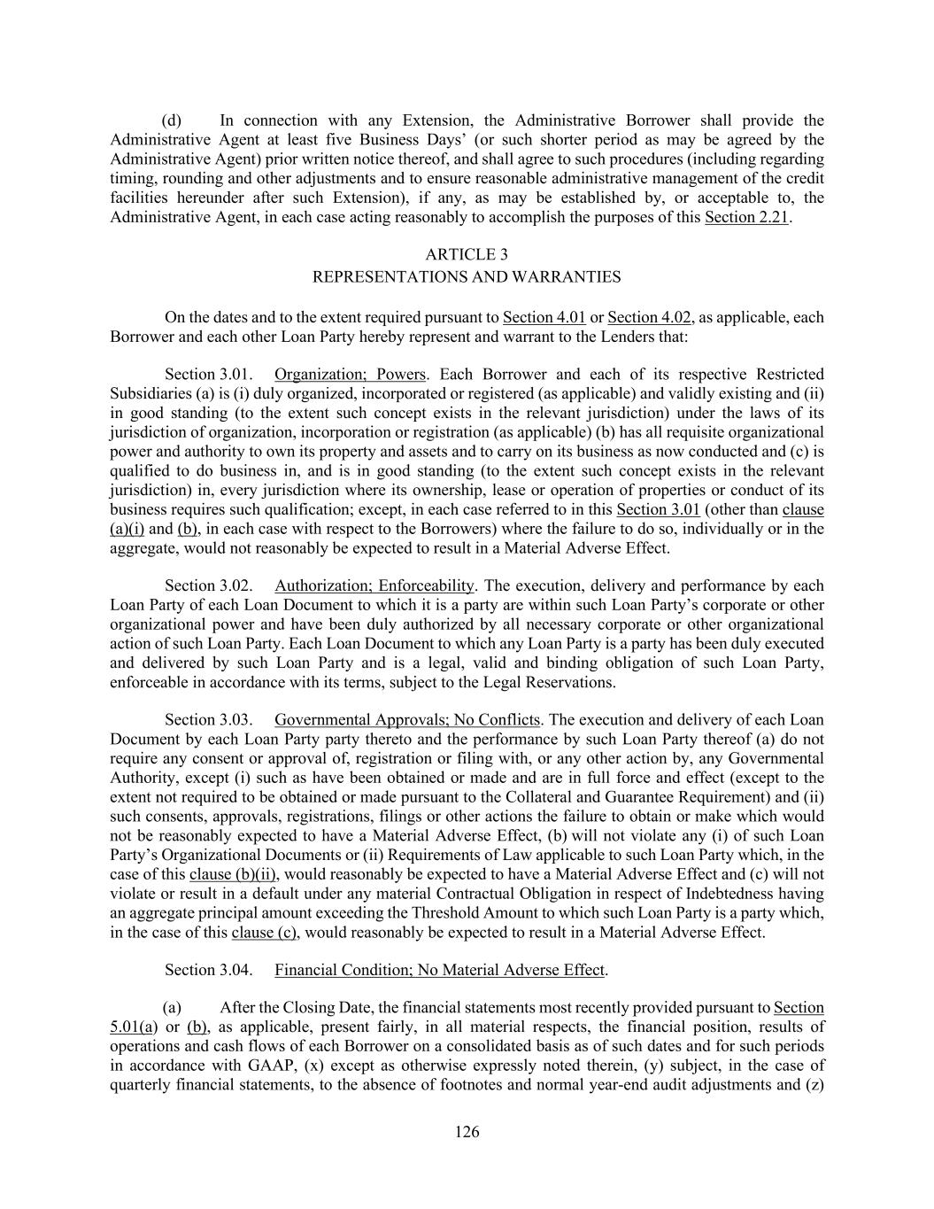126 (d) In connection with any Extension, the Administrative Borrower shall provide the Administrative Agent at least five Business Days’ (or such shorter period as may be agreed by the Administrative Agent) prior written notice thereof, and shall agree to such procedures (including regarding timing, rounding and other adjustments and to ensure reasonable administrative management of the credit facilities hereunder after such Extension), if any, as may be established by, or acceptable to, the Administrative Agent, in each case acting reasonably to accomplish the purposes of this Section 2.21. ARTICLE 3 REPRESENTATIONS AND WARRANTIES On the dates and to the extent required pursuant to Section 4.01 or Section 4.02, as applicable, each Borrower and each other Loan Party hereby represent and warrant to the Lenders that: Section 3.01. Organization; Powers. Each Borrower and each of its respective Restricted Subsidiaries (a) is (i) duly organized, incorporated or registered (as applicable) and validly existing and (ii) in good standing (to the extent such concept exists in the relevant jurisdiction) under the laws of its jurisdiction of organization, incorporation or registration (as applicable) (b) has all requisite organizational power and authority to own its property and assets and to carry on its business as now conducted and (c) is qualified to do business in, and is in good standing (to the extent such concept exists in the relevant jurisdiction) in, every jurisdiction where its ownership, lease or operation of properties or conduct of its business requires such qualification; except, in each case referred to in this Section 3.01 (other than clause (a)(i) and (b), in each case with respect to the Borrowers) where the failure to do so, individually or in the aggregate, would not reasonably be expected to result in a Material Adverse Effect. Section 3.02. Authorization; Enforceability. The execution, delivery and performance by each Loan Party of each Loan Document to which it is a party are within such Loan Party’s corporate or other organizational power and have been duly authorized by all necessary corporate or other organizational action of such Loan Party. Each Loan Document to which any Loan Party is a party has been duly executed and delivered by such Loan Party and is a legal, valid and binding obligation of such Loan Party, enforceable in accordance with its terms, subject to the Legal Reservations. Section 3.03. Governmental Approvals; No Conflicts. The execution and delivery of each Loan Document by each Loan Party party thereto and the performance by such Loan Party thereof (a) do not require any consent or approval of, registration or filing with, or any other action by, any Governmental Authority, except (i) such as have been obtained or made and are in full force and effect (except to the extent not required to be obtained or made pursuant to the Collateral and Guarantee Requirement) and (ii) such consents, approvals, registrations, filings or other actions the failure to obtain or make which would not be reasonably expected to have a Material Adverse Effect, (b) will not violate any (i) of such Loan Party’s Organizational Documents or (ii) Requirements of Law applicable to such Loan Party which, in the case of this clause (b)(ii), would reasonably be expected to have a Material Adverse Effect and (c) will not violate or result in a default under any material Contractual Obligation in respect of Indebtedness having an aggregate principal amount exceeding the Threshold Amount to which such Loan Party is a party which, in the case of this clause (c), would reasonably be expected to result in a Material Adverse Effect. Section 3.04. Financial Condition; No Material Adverse Effect. (a) After the Closing Date, the financial statements most recently provided pursuant to Section 5.01(a) or (b), as applicable, present fairly, in all material respects, the financial position, results of operations and cash flows of each Borrower on a consolidated basis as of such dates and for such periods in accordance with GAAP, (x) except as otherwise expressly noted therein, (y) subject, in the case of quarterly financial statements, to the absence of footnotes and normal year-end audit adjustments and (z)