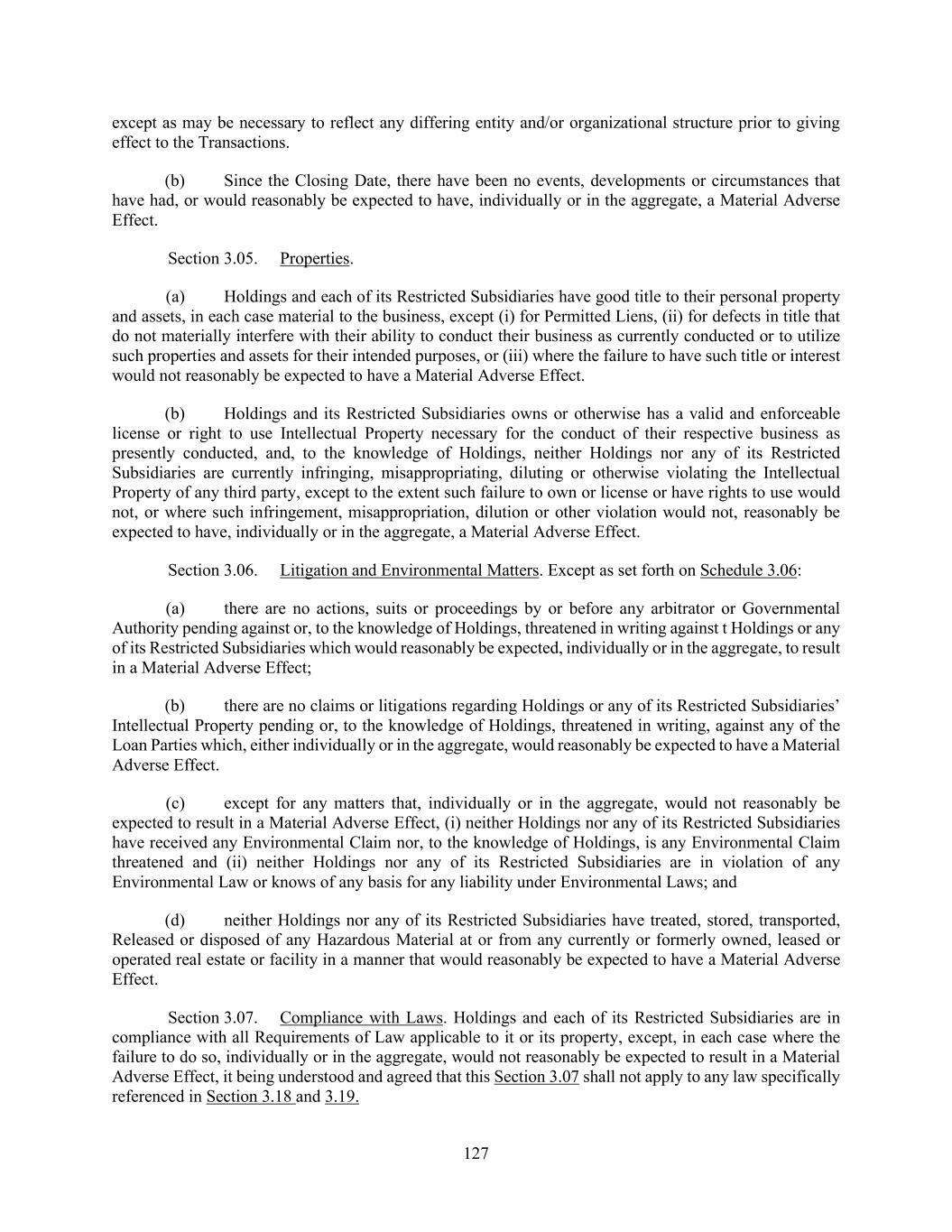 127 except as may be necessary to reflect any differing entity and/or organizational structure prior to giving effect to the Transactions. (b) Since the Closing Date, there have been no events, developments or circumstances that have had, or would reasonably be expected to have, individually or in the aggregate, a Material Adverse Effect. Section 3.05. Properties. (a) Holdings and each of its Restricted Subsidiaries have good title to their personal property and assets, in each case material to the business, except (i) for Permitted Liens, (ii) for defects in title that do not materially interfere with their ability to conduct their business as currently conducted or to utilize such properties and assets for their intended purposes, or (iii) where the failure to have such title or interest would not reasonably be expected to have a Material Adverse Effect. (b) Holdings and its Restricted Subsidiaries owns or otherwise has a valid and enforceable license or right to use Intellectual Property necessary for the conduct of their respective business as presently conducted, and, to the knowledge of Holdings, neither Holdings nor any of its Restricted Subsidiaries are currently infringing, misappropriating, diluting or otherwise violating the Intellectual Property of any third party, except to the extent such failure to own or license or have rights to use would not, or where such infringement, misappropriation, dilution or other violation would not, reasonably be expected to have, individually or in the aggregate, a Material Adverse Effect. Section 3.06. Litigation and Environmental Matters. Except as set forth on Schedule 3.06: (a) there are no actions, suits or proceedings by or before any arbitrator or Governmental Authority pending against or, to the knowledge of Holdings, threatened in writing against t Holdings or any of its Restricted Subsidiaries which would reasonably be expected, individually or in the aggregate, to result in a Material Adverse Effect; (b) there are no claims or litigations regarding Holdings or any of its Restricted Subsidiaries’ Intellectual Property pending or, to the knowledge of Holdings, threatened in writing, against any of the Loan Parties which, either individually or in the aggregate, would reasonably be expected to have a Material Adverse Effect. (c) except for any matters that, individually or in the aggregate, would not reasonably be expected to result in a Material Adverse Effect, (i) neither Holdings nor any of its Restricted Subsidiaries have received any Environmental Claim nor, to the knowledge of Holdings, is any Environmental Claim threatened and (ii) neither Holdings nor any of its Restricted Subsidiaries are in violation of any Environmental Law or knows of any basis for any liability under Environmental Laws; and (d) neither Holdings nor any of its Restricted Subsidiaries have treated, stored, transported, Released or disposed of any Hazardous Material at or from any currently or formerly owned, leased or operated real estate or facility in a manner that would reasonably be expected to have a Material Adverse Effect. Section 3.07. Compliance with Laws. Holdings and each of its Restricted Subsidiaries are in compliance with all Requirements of Law applicable to it or its property, except, in each case where the failure to do so, individually or in the aggregate, would not reasonably be expected to result in a Material Adverse Effect, it being understood and agreed that this Section 3.07 shall not apply to any law specifically referenced in Section 3.18 and 3.19.
