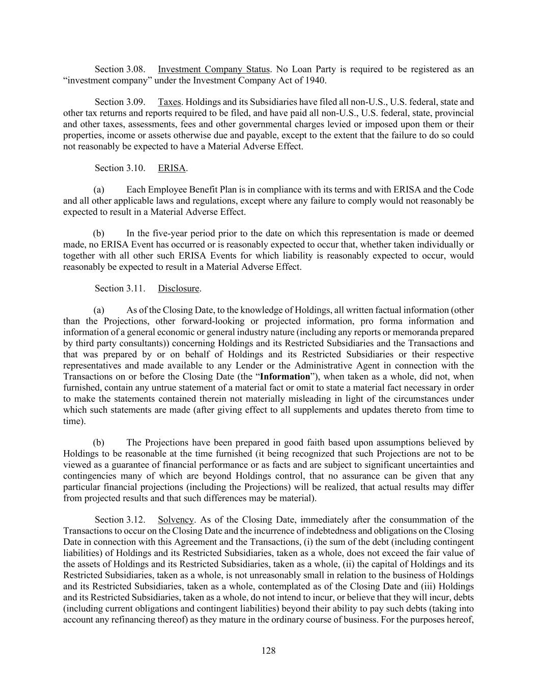 128 Section 3.08. Investment Company Status. No Loan Party is required to be registered as an “investment company” under the Investment Company Act of 1940. Section 3.09. Taxes. Holdings and its Subsidiaries have filed all non-U.S., U.S. federal, state and other tax returns and reports required to be filed, and have paid all non-U.S., U.S. federal, state, provincial and other taxes, assessments, fees and other governmental charges levied or imposed upon them or their properties, income or assets otherwise due and payable, except to the extent that the failure to do so could not reasonably be expected to have a Material Adverse Effect. Section 3.10. ERISA. (a) Each Employee Benefit Plan is in compliance with its terms and with ERISA and the Code and all other applicable laws and regulations, except where any failure to comply would not reasonably be expected to result in a Material Adverse Effect. (b) In the five-year period prior to the date on which this representation is made or deemed made, no ERISA Event has occurred or is reasonably expected to occur that, whether taken individually or together with all other such ERISA Events for which liability is reasonably expected to occur, would reasonably be expected to result in a Material Adverse Effect. Section 3.11. Disclosure. (a) As of the Closing Date, to the knowledge of Holdings, all written factual information (other than the Projections, other forward-looking or projected information, pro forma information and information of a general economic or general industry nature (including any reports or memoranda prepared by third party consultants)) concerning Holdings and its Restricted Subsidiaries and the Transactions and that was prepared by or on behalf of Holdings and its Restricted Subsidiaries or their respective representatives and made available to any Lender or the Administrative Agent in connection with the Transactions on or before the Closing Date (the “Information”), when taken as a whole, did not, when furnished, contain any untrue statement of a material fact or omit to state a material fact necessary in order to make the statements contained therein not materially misleading in light of the circumstances under which such statements are made (after giving effect to all supplements and updates thereto from time to time). (b) The Projections have been prepared in good faith based upon assumptions believed by Holdings to be reasonable at the time furnished (it being recognized that such Projections are not to be viewed as a guarantee of financial performance or as facts and are subject to significant uncertainties and contingencies many of which are beyond Holdings control, that no assurance can be given that any particular financial projections (including the Projections) will be realized, that actual results may differ from projected results and that such differences may be material). Section 3.12. Solvency. As of the Closing Date, immediately after the consummation of the Transactions to occur on the Closing Date and the incurrence of indebtedness and obligations on the Closing Date in connection with this Agreement and the Transactions, (i) the sum of the debt (including contingent liabilities) of Holdings and its Restricted Subsidiaries, taken as a whole, does not exceed the fair value of the assets of Holdings and its Restricted Subsidiaries, taken as a whole, (ii) the capital of Holdings and its Restricted Subsidiaries, taken as a whole, is not unreasonably small in relation to the business of Holdings and its Restricted Subsidiaries, taken as a whole, contemplated as of the Closing Date and (iii) Holdings and its Restricted Subsidiaries, taken as a whole, do not intend to incur, or believe that they will incur, debts (including current obligations and contingent liabilities) beyond their ability to pay such debts (taking into account any refinancing thereof) as they mature in the ordinary course of business. For the purposes hereof,