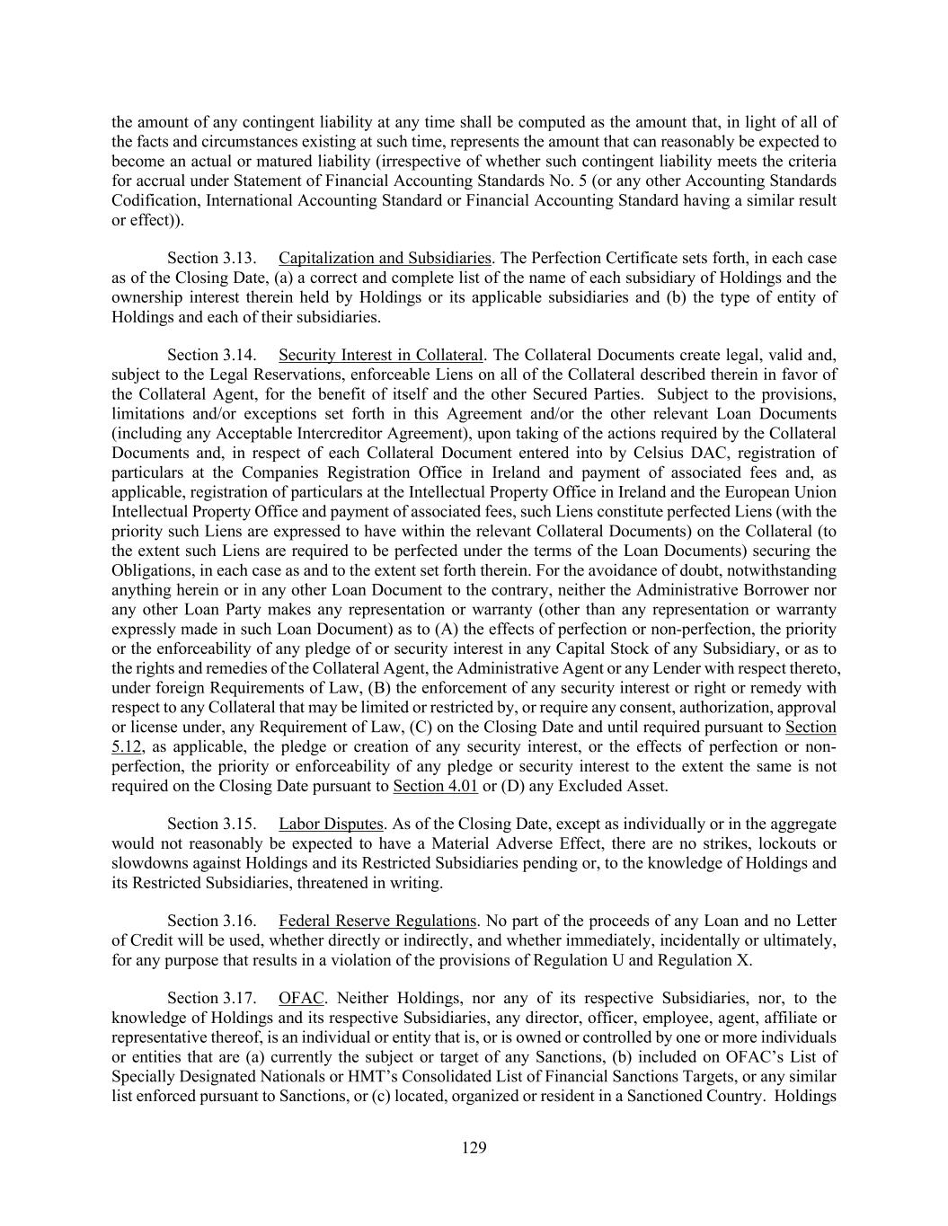129 the amount of any contingent liability at any time shall be computed as the amount that, in light of all of the facts and circumstances existing at such time, represents the amount that can reasonably be expected to become an actual or matured liability (irrespective of whether such contingent liability meets the criteria for accrual under Statement of Financial Accounting Standards No. 5 (or any other Accounting Standards Codification, International Accounting Standard or Financial Accounting Standard having a similar result or effect)). Section 3.13. Capitalization and Subsidiaries. The Perfection Certificate sets forth, in each case as of the Closing Date, (a) a correct and complete list of the name of each subsidiary of Holdings and the ownership interest therein held by Holdings or its applicable subsidiaries and (b) the type of entity of Holdings and each of their subsidiaries. Section 3.14. Security Interest in Collateral. The Collateral Documents create legal, valid and, subject to the Legal Reservations, enforceable Liens on all of the Collateral described therein in favor of the Collateral Agent, for the benefit of itself and the other Secured Parties. Subject to the provisions, limitations and/or exceptions set forth in this Agreement and/or the other relevant Loan Documents (including any Acceptable Intercreditor Agreement), upon taking of the actions required by the Collateral Documents and, in respect of each Collateral Document entered into by Celsius DAC, registration of particulars at the Companies Registration Office in Ireland and payment of associated fees and, as applicable, registration of particulars at the Intellectual Property Office in Ireland and the European Union Intellectual Property Office and payment of associated fees, such Liens constitute perfected Liens (with the priority such Liens are expressed to have within the relevant Collateral Documents) on the Collateral (to the extent such Liens are required to be perfected under the terms of the Loan Documents) securing the Obligations, in each case as and to the extent set forth therein. For the avoidance of doubt, notwithstanding anything herein or in any other Loan Document to the contrary, neither the Administrative Borrower nor any other Loan Party makes any representation or warranty (other than any representation or warranty expressly made in such Loan Document) as to (A) the effects of perfection or non-perfection, the priority or the enforceability of any pledge of or security interest in any Capital Stock of any Subsidiary, or as to the rights and remedies of the Collateral Agent, the Administrative Agent or any Lender with respect thereto, under foreign Requirements of Law, (B) the enforcement of any security interest or right or remedy with respect to any Collateral that may be limited or restricted by, or require any consent, authorization, approval or license under, any Requirement of Law, (C) on the Closing Date and until required pursuant to Section 5.12, as applicable, the pledge or creation of any security interest, or the effects of perfection or non- perfection, the priority or enforceability of any pledge or security interest to the extent the same is not required on the Closing Date pursuant to Section 4.01 or (D) any Excluded Asset. Section 3.15. Labor Disputes. As of the Closing Date, except as individually or in the aggregate would not reasonably be expected to have a Material Adverse Effect, there are no strikes, lockouts or slowdowns against Holdings and its Restricted Subsidiaries pending or, to the knowledge of Holdings and its Restricted Subsidiaries, threatened in writing. Section 3.16. Federal Reserve Regulations. No part of the proceeds of any Loan and no Letter of Credit will be used, whether directly or indirectly, and whether immediately, incidentally or ultimately, for any purpose that results in a violation of the provisions of Regulation U and Regulation X. Section 3.17. OFAC. Neither Holdings, nor any of its respective Subsidiaries, nor, to the knowledge of Holdings and its respective Subsidiaries, any director, officer, employee, agent, affiliate or representative thereof, is an individual or entity that is, or is owned or controlled by one or more individuals or entities that are (a) currently the subject or target of any Sanctions, (b) included on OFAC’s List of Specially Designated Nationals or HMT’s Consolidated List of Financial Sanctions Targets, or any similar list enforced pursuant to Sanctions, or (c) located, organized or resident in a Sanctioned Country. Holdings