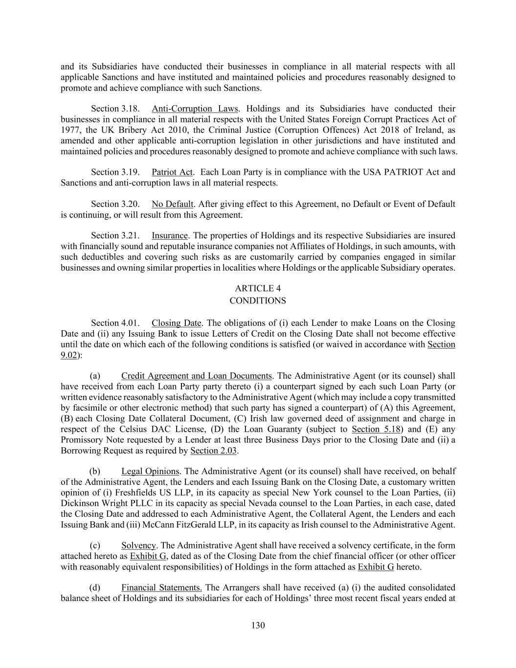 130 and its Subsidiaries have conducted their businesses in compliance in all material respects with all applicable Sanctions and have instituted and maintained policies and procedures reasonably designed to promote and achieve compliance with such Sanctions. Section 3.18. Anti-Corruption Laws. Holdings and its Subsidiaries have conducted their businesses in compliance in all material respects with the United States Foreign Corrupt Practices Act of 1977, the UK Bribery Act 2010, the Criminal Justice (Corruption Offences) Act 2018 of Ireland, as amended and other applicable anti-corruption legislation in other jurisdictions and have instituted and maintained policies and procedures reasonably designed to promote and achieve compliance with such laws. Section 3.19. Patriot Act. Each Loan Party is in compliance with the USA PATRIOT Act and Sanctions and anti-corruption laws in all material respects. Section 3.20. No Default. After giving effect to this Agreement, no Default or Event of Default is continuing, or will result from this Agreement. Section 3.21. Insurance. The properties of Holdings and its respective Subsidiaries are insured with financially sound and reputable insurance companies not Affiliates of Holdings, in such amounts, with such deductibles and covering such risks as are customarily carried by companies engaged in similar businesses and owning similar properties in localities where Holdings or the applicable Subsidiary operates. ARTICLE 4 CONDITIONS Section 4.01. Closing Date. The obligations of (i) each Lender to make Loans on the Closing Date and (ii) any Issuing Bank to issue Letters of Credit on the Closing Date shall not become effective until the date on which each of the following conditions is satisfied (or waived in accordance with Section 9.02): (a) Credit Agreement and Loan Documents. The Administrative Agent (or its counsel) shall have received from each Loan Party party thereto (i) a counterpart signed by each such Loan Party (or written evidence reasonably satisfactory to the Administrative Agent (which may include a copy transmitted by facsimile or other electronic method) that such party has signed a counterpart) of (A) this Agreement, (B) each Closing Date Collateral Document, (C) Irish law governed deed of assignment and charge in respect of the Celsius DAC License, (D) the Loan Guaranty (subject to Section 5.18) and (E) any Promissory Note requested by a Lender at least three Business Days prior to the Closing Date and (ii) a Borrowing Request as required by Section 2.03. (b) Legal Opinions. The Administrative Agent (or its counsel) shall have received, on behalf of the Administrative Agent, the Lenders and each Issuing Bank on the Closing Date, a customary written opinion of (i) Freshfields US LLP, in its capacity as special New York counsel to the Loan Parties, (ii) Dickinson Wright PLLC in its capacity as special Nevada counsel to the Loan Parties, in each case, dated the Closing Date and addressed to each Administrative Agent, the Collateral Agent, the Lenders and each Issuing Bank and (iii) McCann FitzGerald LLP, in its capacity as Irish counsel to the Administrative Agent. (c) Solvency. The Administrative Agent shall have received a solvency certificate, in the form attached hereto as Exhibit G, dated as of the Closing Date from the chief financial officer (or other officer with reasonably equivalent responsibilities) of Holdings in the form attached as Exhibit G hereto. (d) Financial Statements. The Arrangers shall have received (a) (i) the audited consolidated balance sheet of Holdings and its subsidiaries for each of Holdings’ three most recent fiscal years ended at