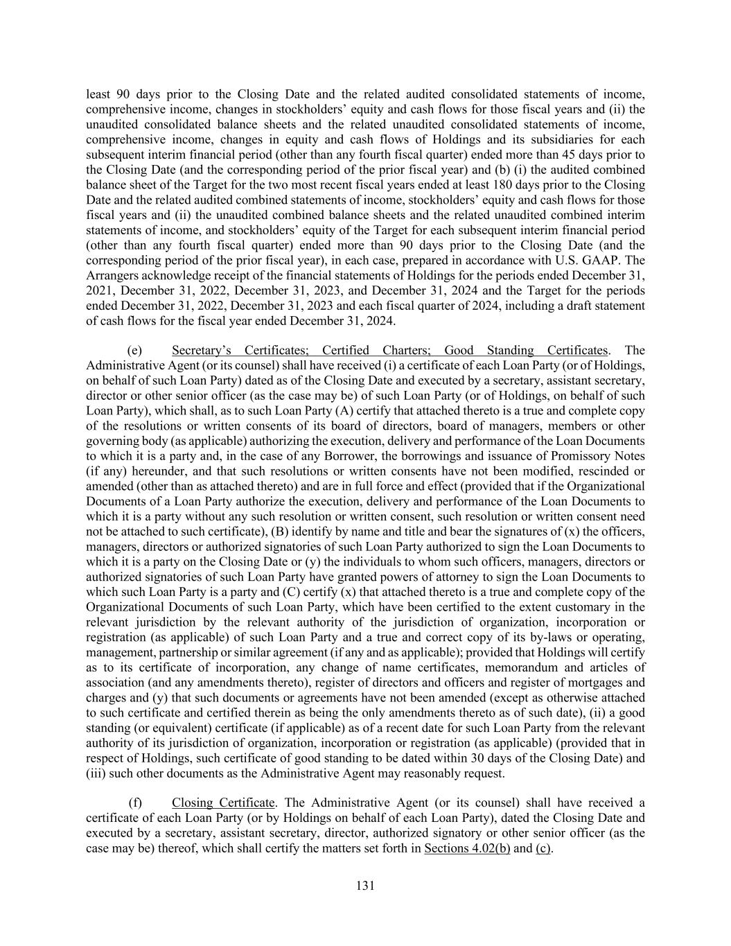 131 least 90 days prior to the Closing Date and the related audited consolidated statements of income, comprehensive income, changes in stockholders’ equity and cash flows for those fiscal years and (ii) the unaudited consolidated balance sheets and the related unaudited consolidated statements of income, comprehensive income, changes in equity and cash flows of Holdings and its subsidiaries for each subsequent interim financial period (other than any fourth fiscal quarter) ended more than 45 days prior to the Closing Date (and the corresponding period of the prior fiscal year) and (b) (i) the audited combined balance sheet of the Target for the two most recent fiscal years ended at least 180 days prior to the Closing Date and the related audited combined statements of income, stockholders’ equity and cash flows for those fiscal years and (ii) the unaudited combined balance sheets and the related unaudited combined interim statements of income, and stockholders’ equity of the Target for each subsequent interim financial period (other than any fourth fiscal quarter) ended more than 90 days prior to the Closing Date (and the corresponding period of the prior fiscal year), in each case, prepared in accordance with U.S. GAAP. The Arrangers acknowledge receipt of the financial statements of Holdings for the periods ended December 31, 2021, December 31, 2022, December 31, 2023, and December 31, 2024 and the Target for the periods ended December 31, 2022, December 31, 2023 and each fiscal quarter of 2024, including a draft statement of cash flows for the fiscal year ended December 31, 2024. (e) Secretary’s Certificates; Certified Charters; Good Standing Certificates. The Administrative Agent (or its counsel) shall have received (i) a certificate of each Loan Party (or of Holdings, on behalf of such Loan Party) dated as of the Closing Date and executed by a secretary, assistant secretary, director or other senior officer (as the case may be) of such Loan Party (or of Holdings, on behalf of such Loan Party), which shall, as to such Loan Party (A) certify that attached thereto is a true and complete copy of the resolutions or written consents of its board of directors, board of managers, members or other governing body (as applicable) authorizing the execution, delivery and performance of the Loan Documents to which it is a party and, in the case of any Borrower, the borrowings and issuance of Promissory Notes (if any) hereunder, and that such resolutions or written consents have not been modified, rescinded or amended (other than as attached thereto) and are in full force and effect (provided that if the Organizational Documents of a Loan Party authorize the execution, delivery and performance of the Loan Documents to which it is a party without any such resolution or written consent, such resolution or written consent need not be attached to such certificate), (B) identify by name and title and bear the signatures of (x) the officers, managers, directors or authorized signatories of such Loan Party authorized to sign the Loan Documents to which it is a party on the Closing Date or (y) the individuals to whom such officers, managers, directors or authorized signatories of such Loan Party have granted powers of attorney to sign the Loan Documents to which such Loan Party is a party and (C) certify (x) that attached thereto is a true and complete copy of the Organizational Documents of such Loan Party, which have been certified to the extent customary in the relevant jurisdiction by the relevant authority of the jurisdiction of organization, incorporation or registration (as applicable) of such Loan Party and a true and correct copy of its by-laws or operating, management, partnership or similar agreement (if any and as applicable); provided that Holdings will certify as to its certificate of incorporation, any change of name certificates, memorandum and articles of association (and any amendments thereto), register of directors and officers and register of mortgages and charges and (y) that such documents or agreements have not been amended (except as otherwise attached to such certificate and certified therein as being the only amendments thereto as of such date), (ii) a good standing (or equivalent) certificate (if applicable) as of a recent date for such Loan Party from the relevant authority of its jurisdiction of organization, incorporation or registration (as applicable) (provided that in respect of Holdings, such certificate of good standing to be dated within 30 days of the Closing Date) and (iii) such other documents as the Administrative Agent may reasonably request. (f) Closing Certificate. The Administrative Agent (or its counsel) shall have received a certificate of each Loan Party (or by Holdings on behalf of each Loan Party), dated the Closing Date and executed by a secretary, assistant secretary, director, authorized signatory or other senior officer (as the case may be) thereof, which shall certify the matters set forth in Sections 4.02(b) and (c).