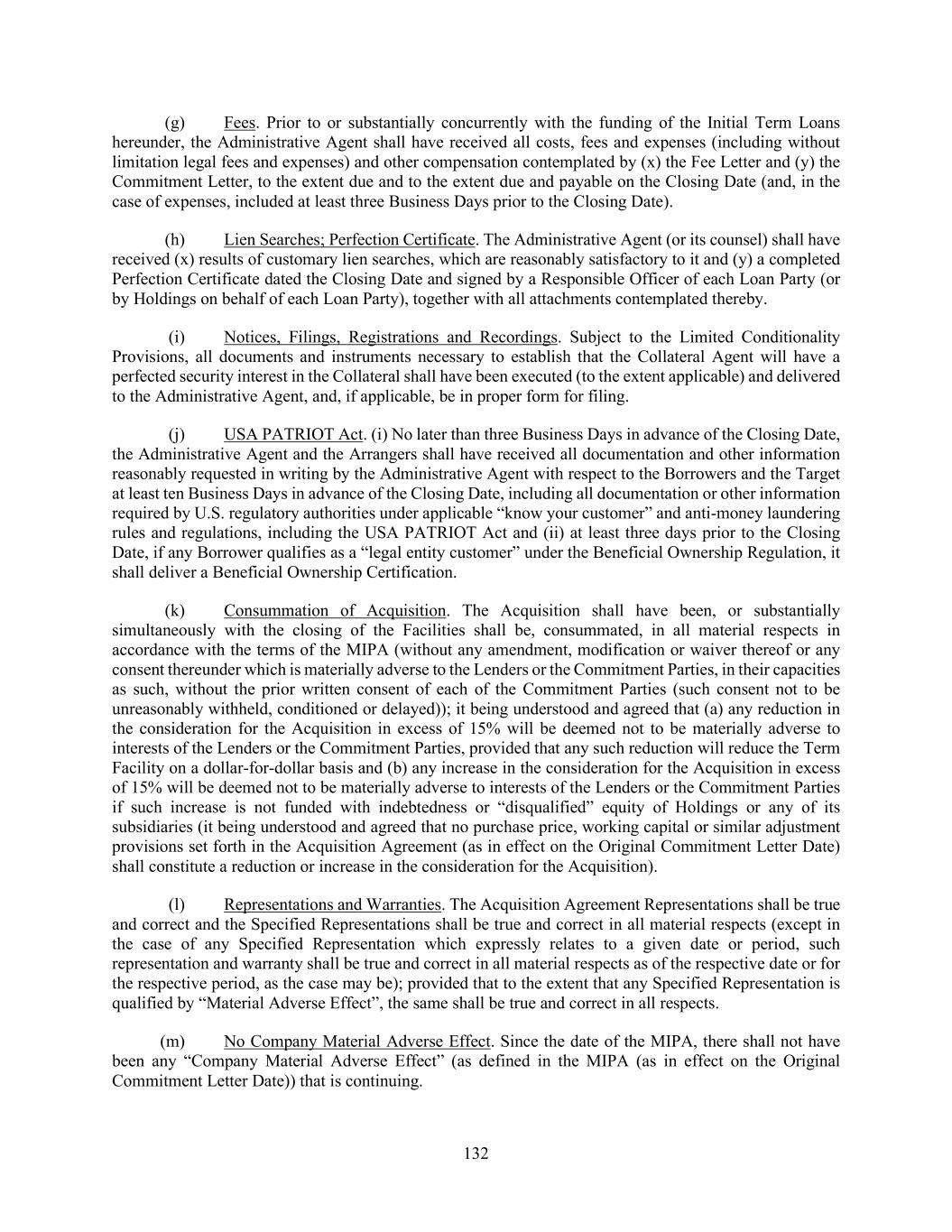 132 (g) Fees. Prior to or substantially concurrently with the funding of the Initial Term Loans hereunder, the Administrative Agent shall have received all costs, fees and expenses (including without limitation legal fees and expenses) and other compensation contemplated by (x) the Fee Letter and (y) the Commitment Letter, to the extent due and to the extent due and payable on the Closing Date (and, in the case of expenses, included at least three Business Days prior to the Closing Date). (h) Lien Searches; Perfection Certificate. The Administrative Agent (or its counsel) shall have received (x) results of customary lien searches, which are reasonably satisfactory to it and (y) a completed Perfection Certificate dated the Closing Date and signed by a Responsible Officer of each Loan Party (or by Holdings on behalf of each Loan Party), together with all attachments contemplated thereby. (i) Notices, Filings, Registrations and Recordings. Subject to the Limited Conditionality Provisions, all documents and instruments necessary to establish that the Collateral Agent will have a perfected security interest in the Collateral shall have been executed (to the extent applicable) and delivered to the Administrative Agent, and, if applicable, be in proper form for filing. (j) USA PATRIOT Act. (i) No later than three Business Days in advance of the Closing Date, the Administrative Agent and the Arrangers shall have received all documentation and other information reasonably requested in writing by the Administrative Agent with respect to the Borrowers and the Target at least ten Business Days in advance of the Closing Date, including all documentation or other information required by U.S. regulatory authorities under applicable “know your customer” and anti-money laundering rules and regulations, including the USA PATRIOT Act and (ii) at least three days prior to the Closing Date, if any Borrower qualifies as a “legal entity customer” under the Beneficial Ownership Regulation, it shall deliver a Beneficial Ownership Certification. (k) Consummation of Acquisition. The Acquisition shall have been, or substantially simultaneously with the closing of the Facilities shall be, consummated, in all material respects in accordance with the terms of the MIPA (without any amendment, modification or waiver thereof or any consent thereunder which is materially adverse to the Lenders or the Commitment Parties, in their capacities as such, without the prior written consent of each of the Commitment Parties (such consent not to be unreasonably withheld, conditioned or delayed)); it being understood and agreed that (a) any reduction in the consideration for the Acquisition in excess of 15% will be deemed not to be materially adverse to interests of the Lenders or the Commitment Parties, provided that any such reduction will reduce the Term Facility on a dollar-for-dollar basis and (b) any increase in the consideration for the Acquisition in excess of 15% will be deemed not to be materially adverse to interests of the Lenders or the Commitment Parties if such increase is not funded with indebtedness or “disqualified” equity of Holdings or any of its subsidiaries (it being understood and agreed that no purchase price, working capital or similar adjustment provisions set forth in the Acquisition Agreement (as in effect on the Original Commitment Letter Date) shall constitute a reduction or increase in the consideration for the Acquisition). (l) Representations and Warranties. The Acquisition Agreement Representations shall be true and correct and the Specified Representations shall be true and correct in all material respects (except in the case of any Specified Representation which expressly relates to a given date or period, such representation and warranty shall be true and correct in all material respects as of the respective date or for the respective period, as the case may be); provided that to the extent that any Specified Representation is qualified by “Material Adverse Effect”, the same shall be true and correct in all respects. (m) No Company Material Adverse Effect. Since the date of the MIPA, there shall not have been any “Company Material Adverse Effect” (as defined in the MIPA (as in effect on the Original Commitment Letter Date)) that is continuing.