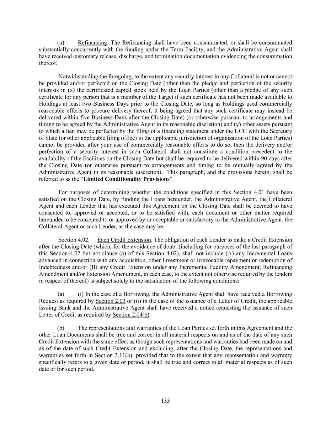 133 (n) Refinancing. The Refinancing shall have been consummated, or shall be consummated substantially concurrently with the funding under the Term Facility, and the Administrative Agent shall have received customary release, discharge, and termination documentation evidencing the consummation thereof. Notwithstanding the foregoing, to the extent any security interest in any Collateral is not or cannot be provided and/or perfected on the Closing Date (other than the pledge and perfection of the security interests in (x) the certificated capital stock held by the Loan Parties (other than a pledge of any such certificate for any person that is a member of the Target if such certificate has not been made available to Holdings at least two Business Days prior to the Closing Date, so long as Holdings used commercially reasonable efforts to procure delivery thereof, it being agreed that any such certificate may instead be delivered within five Business Days after the Closing Date) (or otherwise pursuant to arrangements and timing to be agreed by the Administrative Agent in its reasonable discretion) and (y) other assets pursuant to which a lien may be perfected by the filing of a financing statement under the UCC with the Secretary of State (or other applicable filing office) in the applicable jurisdiction of organization of the Loan Parties) cannot be provided after your use of commercially reasonable efforts to do so, then the delivery and/or perfection of a security interest in such Collateral shall not constitute a condition precedent to the availability of the Facilities on the Closing Date but shall be required to be delivered within 90 days after the Closing Date (or otherwise pursuant to arrangements and timing to be mutually agreed by the Administrative Agent in its reasonable discretion). This paragraph, and the provisions herein, shall be referred to as the “Limited Conditionality Provisions”. For purposes of determining whether the conditions specified in this Section 4.01 have been satisfied on the Closing Date, by funding the Loans hereunder, the Administrative Agent, the Collateral Agent and each Lender that has executed this Agreement on the Closing Date shall be deemed to have consented to, approved or accepted, or to be satisfied with, each document or other matter required hereunder to be consented to or approved by or acceptable or satisfactory to the Administrative Agent, the Collateral Agent or such Lender, as the case may be. Section 4.02. Each Credit Extension. The obligation of each Lender to make a Credit Extension after the Closing Date (which, for the avoidance of doubt (including for purposes of the last paragraph of this Section 4.02 but not clause (a) of this Section 4.02), shall not include (A) any Incremental Loans advanced in connection with any acquisition, other Investment or irrevocable repayment or redemption of Indebtedness and/or (B) any Credit Extension under any Incremental Facility Amendment, Refinancing Amendment and/or Extension Amendment, in each case, to the extent not otherwise required by the lenders in respect of thereof) is subject solely to the satisfaction of the following conditions: (a) (i) In the case of a Borrowing, the Administrative Agent shall have received a Borrowing Request as required by Section 2.03 or (ii) in the case of the issuance of a Letter of Credit, the applicable Issuing Bank and the Administrative Agent shall have received a notice requesting the issuance of such Letter of Credit as required by Section 2.04(b). (b) The representations and warranties of the Loan Parties set forth in this Agreement and the other Loan Documents shall be true and correct in all material respects on and as of the date of any such Credit Extension with the same effect as though such representations and warranties had been made on and as of the date of such Credit Extension and excluding, after the Closing Date, the representations and warranties set forth in Section 3.11(b); provided that to the extent that any representation and warranty specifically refers to a given date or period, it shall be true and correct in all material respects as of such date or for such period.