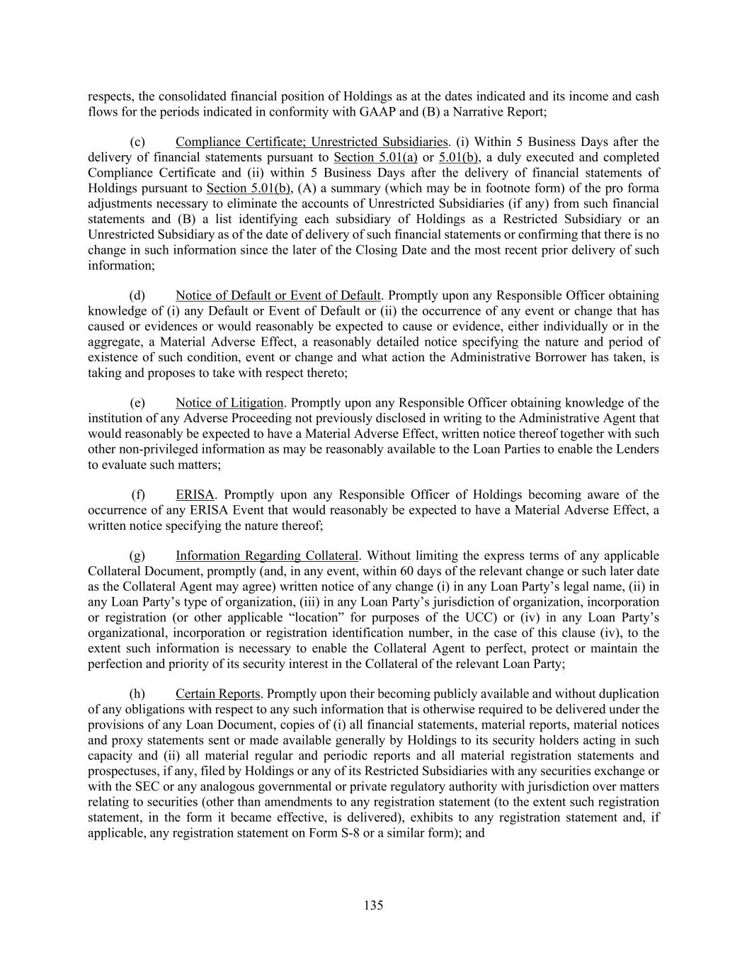 135 respects, the consolidated financial position of Holdings as at the dates indicated and its income and cash flows for the periods indicated in conformity with GAAP and (B) a Narrative Report; (c) Compliance Certificate; Unrestricted Subsidiaries. (i) Within 5 Business Days after the delivery of financial statements pursuant to Section 5.01(a) or 5.01(b), a duly executed and completed Compliance Certificate and (ii) within 5 Business Days after the delivery of financial statements of Holdings pursuant to Section 5.01(b), (A) a summary (which may be in footnote form) of the pro forma adjustments necessary to eliminate the accounts of Unrestricted Subsidiaries (if any) from such financial statements and (B) a list identifying each subsidiary of Holdings as a Restricted Subsidiary or an Unrestricted Subsidiary as of the date of delivery of such financial statements or confirming that there is no change in such information since the later of the Closing Date and the most recent prior delivery of such information; (d) Notice of Default or Event of Default. Promptly upon any Responsible Officer obtaining knowledge of (i) any Default or Event of Default or (ii) the occurrence of any event or change that has caused or evidences or would reasonably be expected to cause or evidence, either individually or in the aggregate, a Material Adverse Effect, a reasonably detailed notice specifying the nature and period of existence of such condition, event or change and what action the Administrative Borrower has taken, is taking and proposes to take with respect thereto; (e) Notice of Litigation. Promptly upon any Responsible Officer obtaining knowledge of the institution of any Adverse Proceeding not previously disclosed in writing to the Administrative Agent that would reasonably be expected to have a Material Adverse Effect, written notice thereof together with such other non-privileged information as may be reasonably available to the Loan Parties to enable the Lenders to evaluate such matters; (f) ERISA. Promptly upon any Responsible Officer of Holdings becoming aware of the occurrence of any ERISA Event that would reasonably be expected to have a Material Adverse Effect, a written notice specifying the nature thereof; (g) Information Regarding Collateral. Without limiting the express terms of any applicable Collateral Document, promptly (and, in any event, within 60 days of the relevant change or such later date as the Collateral Agent may agree) written notice of any change (i) in any Loan Party’s legal name, (ii) in any Loan Party’s type of organization, (iii) in any Loan Party’s jurisdiction of organization, incorporation or registration (or other applicable “location” for purposes of the UCC) or (iv) in any Loan Party’s organizational, incorporation or registration identification number, in the case of this clause (iv), to the extent such information is necessary to enable the Collateral Agent to perfect, protect or maintain the perfection and priority of its security interest in the Collateral of the relevant Loan Party; (h) Certain Reports. Promptly upon their becoming publicly available and without duplication of any obligations with respect to any such information that is otherwise required to be delivered under the provisions of any Loan Document, copies of (i) all financial statements, material reports, material notices and proxy statements sent or made available generally by Holdings to its security holders acting in such capacity and (ii) all material regular and periodic reports and all material registration statements and prospectuses, if any, filed by Holdings or any of its Restricted Subsidiaries with any securities exchange or with the SEC or any analogous governmental or private regulatory authority with jurisdiction over matters relating to securities (other than amendments to any registration statement (to the extent such registration statement, in the form it became effective, is delivered), exhibits to any registration statement and, if applicable, any registration statement on Form S-8 or a similar form); and