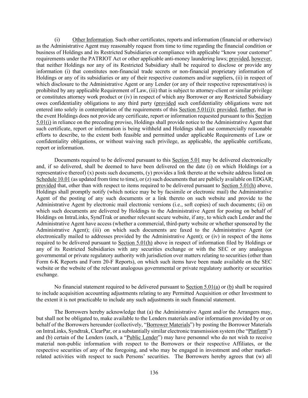 136 (i) Other Information. Such other certificates, reports and information (financial or otherwise) as the Administrative Agent may reasonably request from time to time regarding the financial condition or business of Holdings and its Restricted Subsidiaries or compliance with applicable “know your customer” requirements under the PATRIOT Act or other applicable anti-money laundering laws; provided, however, that neither Holdings nor any of its Restricted Subsidiary shall be required to disclose or provide any information (i) that constitutes non-financial trade secrets or non-financial proprietary information of Holdings or any of its subsidiaries or any of their respective customers and/or suppliers, (ii) in respect of which disclosure to the Administrative Agent or any Lender (or any of their respective representatives) is prohibited by any applicable Requirement of Law, (iii) that is subject to attorney-client or similar privilege or constitutes attorney work product or (iv) in respect of which any Borrower or any Restricted Subsidiary owes confidentiality obligations to any third party (provided such confidentiality obligations were not entered into solely in contemplation of the requirements of this Section 5.01(i)); provided, further, that in the event Holdings does not provide any certificate, report or information requested pursuant to this Section 5.01(i) in reliance on the preceding proviso, Holdings shall provide notice to the Administrative Agent that such certificate, report or information is being withheld and Holdings shall use commercially reasonable efforts to describe, to the extent both feasible and permitted under applicable Requirements of Law or confidentiality obligations, or without waiving such privilege, as applicable, the applicable certificate, report or information. Documents required to be delivered pursuant to this Section 5.01 may be delivered electronically and, if so delivered, shall be deemed to have been delivered on the date (i) on which Holdings (or a representative thereof) (x) posts such documents, (y) provides a link thereto at the website address listed on Schedule 10.01 (as updated from time to time), or (z) such documents that are publicly available on EDGAR; provided that, other than with respect to items required to be delivered pursuant to Section 5.01(h) above, Holdings shall promptly notify (which notice may be by facsimile or electronic mail) the Administrative Agent of the posting of any such documents or a link thereto on such website and provide to the Administrative Agent by electronic mail electronic versions (i.e., soft copies) of such documents; (ii) on which such documents are delivered by Holdings to the Administrative Agent for posting on behalf of Holdings on IntraLinks, SyndTrak or another relevant secure website, if any, to which each Lender and the Administrative Agent have access (whether a commercial, third-party website or whether sponsored by the Administrative Agent); (iii) on which such documents are faxed to the Administrative Agent (or electronically mailed to addresses provided by the Administrative Agent); or (iv) in respect of the items required to be delivered pursuant to Section 5.01(h) above in respect of information filed by Holdings or any of its Restricted Subsidiaries with any securities exchange or with the SEC or any analogous governmental or private regulatory authority with jurisdiction over matters relating to securities (other than Form 6-K Reports and Form 20-F Reports), on which such items have been made available on the SEC website or the website of the relevant analogous governmental or private regulatory authority or securities exchange. No financial statement required to be delivered pursuant to Section 5.01(a) or (b) shall be required to include acquisition accounting adjustments relating to any Permitted Acquisition or other Investment to the extent it is not practicable to include any such adjustments in such financial statement. The Borrowers hereby acknowledge that (a) the Administrative Agent and/or the Arrangers may, but shall not be obligated to, make available to the Lenders materials and/or information provided by or on behalf of the Borrowers hereunder (collectively, “Borrower Materials”) by posting the Borrower Materials on IntraLinks, Syndtrak, ClearPar, or a substantially similar electronic transmission system (the “Platform”) and (b) certain of the Lenders (each, a “Public Lender”) may have personnel who do not wish to receive material non-public information with respect to the Borrowers or their respective Affiliates, or the respective securities of any of the foregoing, and who may be engaged in investment and other market- related activities with respect to such Persons’ securities. The Borrowers hereby agrees that (w) all