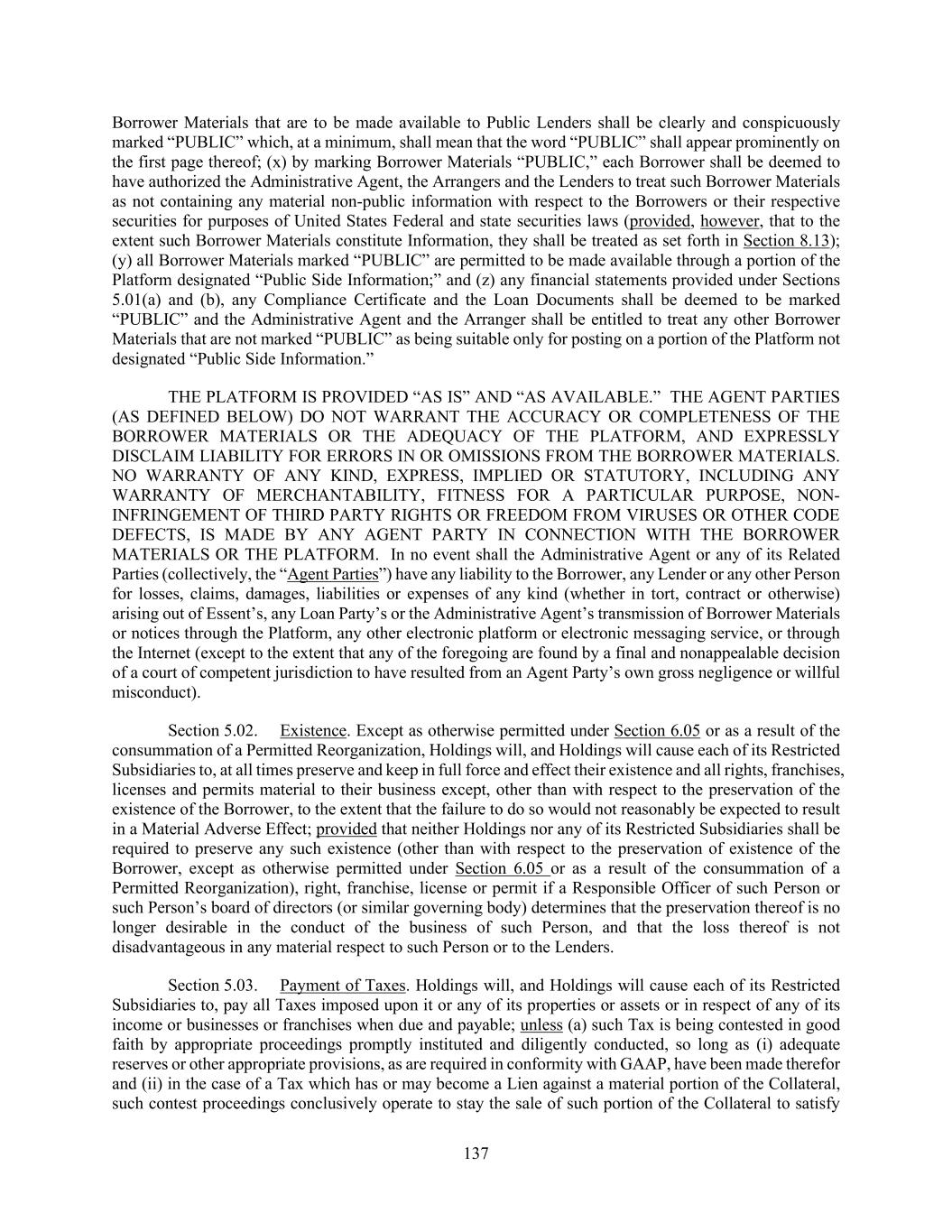 137 Borrower Materials that are to be made available to Public Lenders shall be clearly and conspicuously marked “PUBLIC” which, at a minimum, shall mean that the word “PUBLIC” shall appear prominently on the first page thereof; (x) by marking Borrower Materials “PUBLIC,” each Borrower shall be deemed to have authorized the Administrative Agent, the Arrangers and the Lenders to treat such Borrower Materials as not containing any material non-public information with respect to the Borrowers or their respective securities for purposes of United States Federal and state securities laws (provided, however, that to the extent such Borrower Materials constitute Information, they shall be treated as set forth in Section 8.13); (y) all Borrower Materials marked “PUBLIC” are permitted to be made available through a portion of the Platform designated “Public Side Information;” and (z) any financial statements provided under Sections 5.01(a) and (b), any Compliance Certificate and the Loan Documents shall be deemed to be marked “PUBLIC” and the Administrative Agent and the Arranger shall be entitled to treat any other Borrower Materials that are not marked “PUBLIC” as being suitable only for posting on a portion of the Platform not designated “Public Side Information.” THE PLATFORM IS PROVIDED “AS IS” AND “AS AVAILABLE.” THE AGENT PARTIES (AS DEFINED BELOW) DO NOT WARRANT THE ACCURACY OR COMPLETENESS OF THE BORROWER MATERIALS OR THE ADEQUACY OF THE PLATFORM, AND EXPRESSLY DISCLAIM LIABILITY FOR ERRORS IN OR OMISSIONS FROM THE BORROWER MATERIALS. NO WARRANTY OF ANY KIND, EXPRESS, IMPLIED OR STATUTORY, INCLUDING ANY WARRANTY OF MERCHANTABILITY, FITNESS FOR A PARTICULAR PURPOSE, NON- INFRINGEMENT OF THIRD PARTY RIGHTS OR FREEDOM FROM VIRUSES OR OTHER CODE DEFECTS, IS MADE BY ANY AGENT PARTY IN CONNECTION WITH THE BORROWER MATERIALS OR THE PLATFORM. In no event shall the Administrative Agent or any of its Related Parties (collectively, the “Agent Parties”) have any liability to the Borrower, any Lender or any other Person for losses, claims, damages, liabilities or expenses of any kind (whether in tort, contract or otherwise) arising out of Essent’s, any Loan Party’s or the Administrative Agent’s transmission of Borrower Materials or notices through the Platform, any other electronic platform or electronic messaging service, or through the Internet (except to the extent that any of the foregoing are found by a final and nonappealable decision of a court of competent jurisdiction to have resulted from an Agent Party’s own gross negligence or willful misconduct). Section 5.02. Existence. Except as otherwise permitted under Section 6.05 or as a result of the consummation of a Permitted Reorganization, Holdings will, and Holdings will cause each of its Restricted Subsidiaries to, at all times preserve and keep in full force and effect their existence and all rights, franchises, licenses and permits material to their business except, other than with respect to the preservation of the existence of the Borrower, to the extent that the failure to do so would not reasonably be expected to result in a Material Adverse Effect; provided that neither Holdings nor any of its Restricted Subsidiaries shall be required to preserve any such existence (other than with respect to the preservation of existence of the Borrower, except as otherwise permitted under Section 6.05 or as a result of the consummation of a Permitted Reorganization), right, franchise, license or permit if a Responsible Officer of such Person or such Person’s board of directors (or similar governing body) determines that the preservation thereof is no longer desirable in the conduct of the business of such Person, and that the loss thereof is not disadvantageous in any material respect to such Person or to the Lenders. Section 5.03. Payment of Taxes. Holdings will, and Holdings will cause each of its Restricted Subsidiaries to, pay all Taxes imposed upon it or any of its properties or assets or in respect of any of its income or businesses or franchises when due and payable; unless (a) such Tax is being contested in good faith by appropriate proceedings promptly instituted and diligently conducted, so long as (i) adequate reserves or other appropriate provisions, as are required in conformity with GAAP, have been made therefor and (ii) in the case of a Tax which has or may become a Lien against a material portion of the Collateral, such contest proceedings conclusively operate to stay the sale of such portion of the Collateral to satisfy