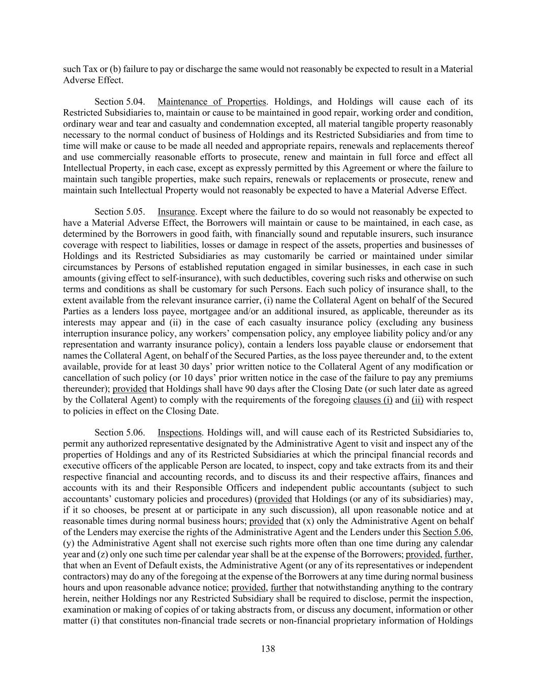 138 such Tax or (b) failure to pay or discharge the same would not reasonably be expected to result in a Material Adverse Effect. Section 5.04. Maintenance of Properties. Holdings, and Holdings will cause each of its Restricted Subsidiaries to, maintain or cause to be maintained in good repair, working order and condition, ordinary wear and tear and casualty and condemnation excepted, all material tangible property reasonably necessary to the normal conduct of business of Holdings and its Restricted Subsidiaries and from time to time will make or cause to be made all needed and appropriate repairs, renewals and replacements thereof and use commercially reasonable efforts to prosecute, renew and maintain in full force and effect all Intellectual Property, in each case, except as expressly permitted by this Agreement or where the failure to maintain such tangible properties, make such repairs, renewals or replacements or prosecute, renew and maintain such Intellectual Property would not reasonably be expected to have a Material Adverse Effect. Section 5.05. Insurance. Except where the failure to do so would not reasonably be expected to have a Material Adverse Effect, the Borrowers will maintain or cause to be maintained, in each case, as determined by the Borrowers in good faith, with financially sound and reputable insurers, such insurance coverage with respect to liabilities, losses or damage in respect of the assets, properties and businesses of Holdings and its Restricted Subsidiaries as may customarily be carried or maintained under similar circumstances by Persons of established reputation engaged in similar businesses, in each case in such amounts (giving effect to self-insurance), with such deductibles, covering such risks and otherwise on such terms and conditions as shall be customary for such Persons. Each such policy of insurance shall, to the extent available from the relevant insurance carrier, (i) name the Collateral Agent on behalf of the Secured Parties as a lenders loss payee, mortgagee and/or an additional insured, as applicable, thereunder as its interests may appear and (ii) in the case of each casualty insurance policy (excluding any business interruption insurance policy, any workers’ compensation policy, any employee liability policy and/or any representation and warranty insurance policy), contain a lenders loss payable clause or endorsement that names the Collateral Agent, on behalf of the Secured Parties, as the loss payee thereunder and, to the extent available, provide for at least 30 days’ prior written notice to the Collateral Agent of any modification or cancellation of such policy (or 10 days’ prior written notice in the case of the failure to pay any premiums thereunder); provided that Holdings shall have 90 days after the Closing Date (or such later date as agreed by the Collateral Agent) to comply with the requirements of the foregoing clauses (i) and (ii) with respect to policies in effect on the Closing Date. Section 5.06. Inspections. Holdings will, and will cause each of its Restricted Subsidiaries to, permit any authorized representative designated by the Administrative Agent to visit and inspect any of the properties of Holdings and any of its Restricted Subsidiaries at which the principal financial records and executive officers of the applicable Person are located, to inspect, copy and take extracts from its and their respective financial and accounting records, and to discuss its and their respective affairs, finances and accounts with its and their Responsible Officers and independent public accountants (subject to such accountants’ customary policies and procedures) (provided that Holdings (or any of its subsidiaries) may, if it so chooses, be present at or participate in any such discussion), all upon reasonable notice and at reasonable times during normal business hours; provided that (x) only the Administrative Agent on behalf of the Lenders may exercise the rights of the Administrative Agent and the Lenders under this Section 5.06, (y) the Administrative Agent shall not exercise such rights more often than one time during any calendar year and (z) only one such time per calendar year shall be at the expense of the Borrowers; provided, further, that when an Event of Default exists, the Administrative Agent (or any of its representatives or independent contractors) may do any of the foregoing at the expense of the Borrowers at any time during normal business hours and upon reasonable advance notice; provided, further that notwithstanding anything to the contrary herein, neither Holdings nor any Restricted Subsidiary shall be required to disclose, permit the inspection, examination or making of copies of or taking abstracts from, or discuss any document, information or other matter (i) that constitutes non-financial trade secrets or non-financial proprietary information of Holdings