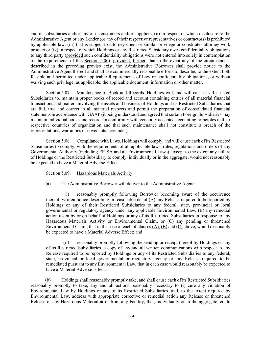 139 and its subsidiaries and/or any of its customers and/or suppliers, (ii) in respect of which disclosure to the Administrative Agent or any Lender (or any of their respective representatives or contractors) is prohibited by applicable law, (iii) that is subject to attorney-client or similar privilege or constitutes attorney work product or (iv) in respect of which Holdings or any Restricted Subsidiary owes confidentiality obligations to any third party (provided such confidentiality obligations were not entered into solely in contemplation of the requirements of this Section 5.06); provided, further, that in the event any of the circumstances described in the preceding proviso exist, the Administrative Borrower shall provide notice to the Administrative Agent thereof and shall use commercially reasonable efforts to describe, to the extent both feasible and permitted under applicable Requirements of Law or confidentiality obligations, or without waiving such privilege, as applicable, the applicable document, information or other matter. Section 5.07. Maintenance of Book and Records. Holdings will, and will cause its Restricted Subsidiaries to, maintain proper books of record and account containing entries of all material financial transactions and matters involving the assets and business of Holdings and its Restricted Subsidiaries that are full, true and correct in all material respects and permit the preparation of consolidated financial statements in accordance with GAAP (it being understood and agreed that certain Foreign Subsidiaries may maintain individual books and records in conformity with generally accepted accounting principles in their respective countries of organization and that such maintenance shall not constitute a breach of the representations, warranties or covenants hereunder). Section 5.08. Compliance with Laws. Holdings will comply, and will cause each of its Restricted Subsidiaries to comply, with the requirements of all applicable laws, rules, regulations and orders of any Governmental Authority (including ERISA and all Environmental Laws), except to the extent any failure of Holdings or the Restricted Subsidiary to comply, individually or in the aggregate, would not reasonably be expected to have a Material Adverse Effect. Section 5.09. Hazardous Materials Activity. (a) The Administrative Borrower will deliver to the Administrative Agent: (i) reasonably promptly following Borrower becoming aware of the occurrence thereof, written notice describing in reasonable detail (A) any Release required to be reported by Holdings or any of their Restricted Subsidiaries to any federal, state, provincial or local governmental or regulatory agency under any applicable Environmental Law, (B) any remedial action taken by or on behalf of Holdings or any of its Restricted Subsidiaries in response to any Hazardous Materials Activity or Environmental Claim, or (C) any pending or threatened Environmental Claim, that in the case of each of clauses (A), (B) and (C) above, would reasonably be expected to have a Material Adverse Effect; and (ii) reasonably promptly following the sending or receipt thereof by Holdings or any of its Restricted Subsidiaries, a copy of any and all written communications with respect to any Release required to be reported by Holdings or any of its Restricted Subsidiaries to any federal, state, provincial or local governmental or regulatory agency or any Release required to be remediated pursuant to any Environmental Law, that in each case would reasonably be expected to have a Material Adverse Effect. (b) Holdings shall reasonably promptly take, and shall cause each of its Restricted Subsidiaries reasonably promptly to take, any and all actions reasonably necessary to (i) cure any violation of Environmental Law by Holdings or any of its Restricted Subsidiaries, and, to the extent required by Environmental Law, address with appropriate corrective or remedial action any Release or threatened Release of any Hazardous Material at or from any Facility, that, individually or in the aggregate, could