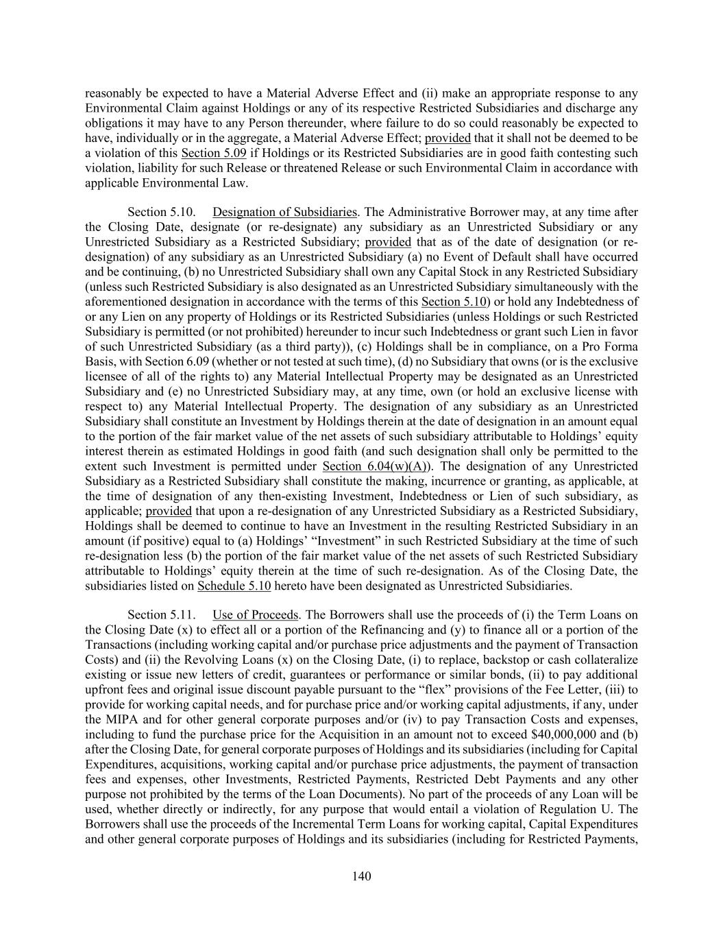 140 reasonably be expected to have a Material Adverse Effect and (ii) make an appropriate response to any Environmental Claim against Holdings or any of its respective Restricted Subsidiaries and discharge any obligations it may have to any Person thereunder, where failure to do so could reasonably be expected to have, individually or in the aggregate, a Material Adverse Effect; provided that it shall not be deemed to be a violation of this Section 5.09 if Holdings or its Restricted Subsidiaries are in good faith contesting such violation, liability for such Release or threatened Release or such Environmental Claim in accordance with applicable Environmental Law. Section 5.10. Designation of Subsidiaries. The Administrative Borrower may, at any time after the Closing Date, designate (or re-designate) any subsidiary as an Unrestricted Subsidiary or any Unrestricted Subsidiary as a Restricted Subsidiary; provided that as of the date of designation (or re- designation) of any subsidiary as an Unrestricted Subsidiary (a) no Event of Default shall have occurred and be continuing, (b) no Unrestricted Subsidiary shall own any Capital Stock in any Restricted Subsidiary (unless such Restricted Subsidiary is also designated as an Unrestricted Subsidiary simultaneously with the aforementioned designation in accordance with the terms of this Section 5.10) or hold any Indebtedness of or any Lien on any property of Holdings or its Restricted Subsidiaries (unless Holdings or such Restricted Subsidiary is permitted (or not prohibited) hereunder to incur such Indebtedness or grant such Lien in favor of such Unrestricted Subsidiary (as a third party)), (c) Holdings shall be in compliance, on a Pro Forma Basis, with Section 6.09 (whether or not tested at such time), (d) no Subsidiary that owns (or is the exclusive licensee of all of the rights to) any Material Intellectual Property may be designated as an Unrestricted Subsidiary and (e) no Unrestricted Subsidiary may, at any time, own (or hold an exclusive license with respect to) any Material Intellectual Property. The designation of any subsidiary as an Unrestricted Subsidiary shall constitute an Investment by Holdings therein at the date of designation in an amount equal to the portion of the fair market value of the net assets of such subsidiary attributable to Holdings’ equity interest therein as estimated Holdings in good faith (and such designation shall only be permitted to the extent such Investment is permitted under Section 6.04(w)(A)). The designation of any Unrestricted Subsidiary as a Restricted Subsidiary shall constitute the making, incurrence or granting, as applicable, at the time of designation of any then-existing Investment, Indebtedness or Lien of such subsidiary, as applicable; provided that upon a re-designation of any Unrestricted Subsidiary as a Restricted Subsidiary, Holdings shall be deemed to continue to have an Investment in the resulting Restricted Subsidiary in an amount (if positive) equal to (a) Holdings’ “Investment” in such Restricted Subsidiary at the time of such re-designation less (b) the portion of the fair market value of the net assets of such Restricted Subsidiary attributable to Holdings’ equity therein at the time of such re-designation. As of the Closing Date, the subsidiaries listed on Schedule 5.10 hereto have been designated as Unrestricted Subsidiaries. Section 5.11. Use of Proceeds. The Borrowers shall use the proceeds of (i) the Term Loans on the Closing Date (x) to effect all or a portion of the Refinancing and (y) to finance all or a portion of the Transactions (including working capital and/or purchase price adjustments and the payment of Transaction Costs) and (ii) the Revolving Loans (x) on the Closing Date, (i) to replace, backstop or cash collateralize existing or issue new letters of credit, guarantees or performance or similar bonds, (ii) to pay additional upfront fees and original issue discount payable pursuant to the “flex” provisions of the Fee Letter, (iii) to provide for working capital needs, and for purchase price and/or working capital adjustments, if any, under the MIPA and for other general corporate purposes and/or (iv) to pay Transaction Costs and expenses, including to fund the purchase price for the Acquisition in an amount not to exceed $40,000,000 and (b) after the Closing Date, for general corporate purposes of Holdings and its subsidiaries (including for Capital Expenditures, acquisitions, working capital and/or purchase price adjustments, the payment of transaction fees and expenses, other Investments, Restricted Payments, Restricted Debt Payments and any other purpose not prohibited by the terms of the Loan Documents). No part of the proceeds of any Loan will be used, whether directly or indirectly, for any purpose that would entail a violation of Regulation U. The Borrowers shall use the proceeds of the Incremental Term Loans for working capital, Capital Expenditures and other general corporate purposes of Holdings and its subsidiaries (including for Restricted Payments,