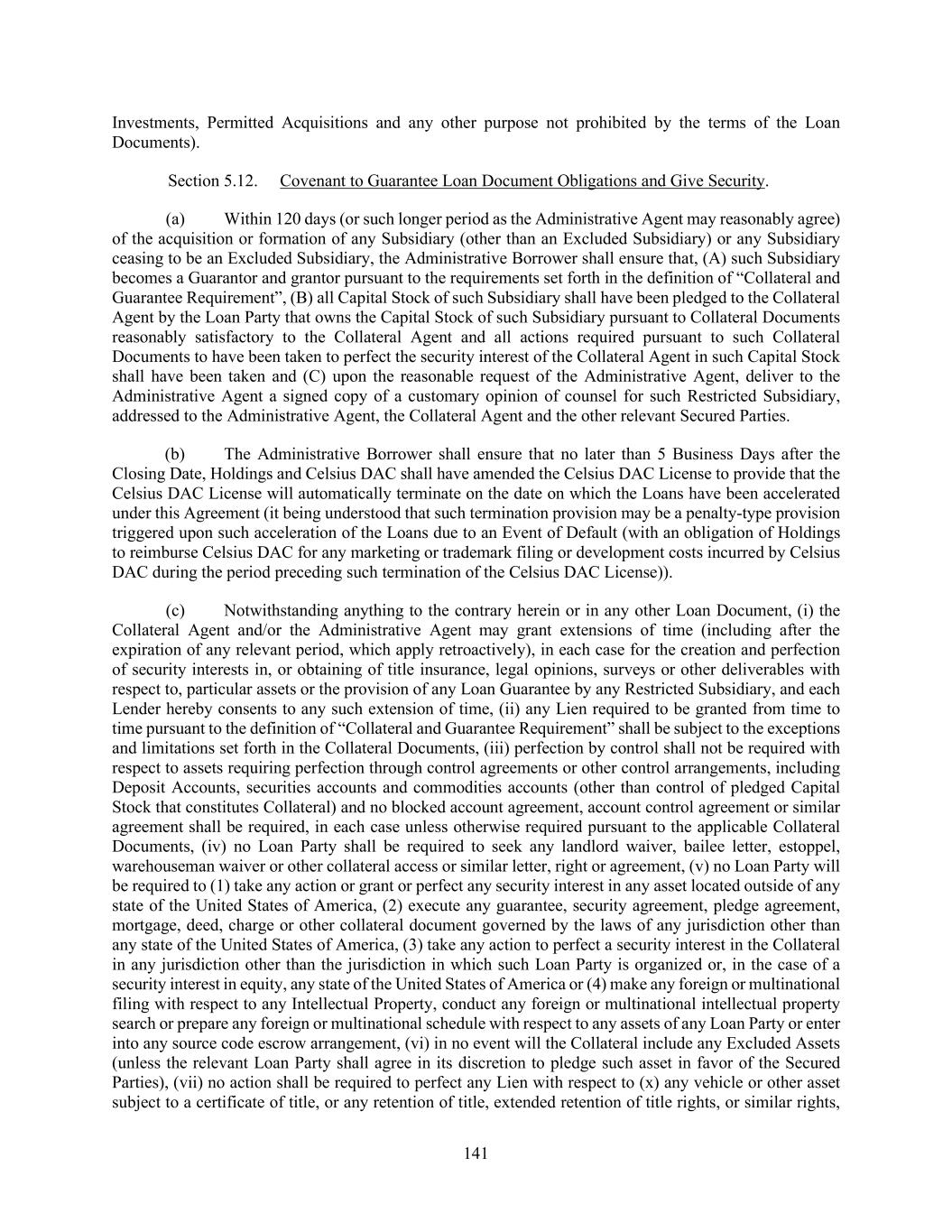 141 Investments, Permitted Acquisitions and any other purpose not prohibited by the terms of the Loan Documents). Section 5.12. Covenant to Guarantee Loan Document Obligations and Give Security. (a) Within 120 days (or such longer period as the Administrative Agent may reasonably agree) of the acquisition or formation of any Subsidiary (other than an Excluded Subsidiary) or any Subsidiary ceasing to be an Excluded Subsidiary, the Administrative Borrower shall ensure that, (A) such Subsidiary becomes a Guarantor and grantor pursuant to the requirements set forth in the definition of “Collateral and Guarantee Requirement”, (B) all Capital Stock of such Subsidiary shall have been pledged to the Collateral Agent by the Loan Party that owns the Capital Stock of such Subsidiary pursuant to Collateral Documents reasonably satisfactory to the Collateral Agent and all actions required pursuant to such Collateral Documents to have been taken to perfect the security interest of the Collateral Agent in such Capital Stock shall have been taken and (C) upon the reasonable request of the Administrative Agent, deliver to the Administrative Agent a signed copy of a customary opinion of counsel for such Restricted Subsidiary, addressed to the Administrative Agent, the Collateral Agent and the other relevant Secured Parties. (b) The Administrative Borrower shall ensure that no later than 5 Business Days after the Closing Date, Holdings and Celsius DAC shall have amended the Celsius DAC License to provide that the Celsius DAC License will automatically terminate on the date on which the Loans have been accelerated under this Agreement (it being understood that such termination provision may be a penalty-type provision triggered upon such acceleration of the Loans due to an Event of Default (with an obligation of Holdings to reimburse Celsius DAC for any marketing or trademark filing or development costs incurred by Celsius DAC during the period preceding such termination of the Celsius DAC License)). (c) Notwithstanding anything to the contrary herein or in any other Loan Document, (i) the Collateral Agent and/or the Administrative Agent may grant extensions of time (including after the expiration of any relevant period, which apply retroactively), in each case for the creation and perfection of security interests in, or obtaining of title insurance, legal opinions, surveys or other deliverables with respect to, particular assets or the provision of any Loan Guarantee by any Restricted Subsidiary, and each Lender hereby consents to any such extension of time, (ii) any Lien required to be granted from time to time pursuant to the definition of “Collateral and Guarantee Requirement” shall be subject to the exceptions and limitations set forth in the Collateral Documents, (iii) perfection by control shall not be required with respect to assets requiring perfection through control agreements or other control arrangements, including Deposit Accounts, securities accounts and commodities accounts (other than control of pledged Capital Stock that constitutes Collateral) and no blocked account agreement, account control agreement or similar agreement shall be required, in each case unless otherwise required pursuant to the applicable Collateral Documents, (iv) no Loan Party shall be required to seek any landlord waiver, bailee letter, estoppel, warehouseman waiver or other collateral access or similar letter, right or agreement, (v) no Loan Party will be required to (1) take any action or grant or perfect any security interest in any asset located outside of any state of the United States of America, (2) execute any guarantee, security agreement, pledge agreement, mortgage, deed, charge or other collateral document governed by the laws of any jurisdiction other than any state of the United States of America, (3) take any action to perfect a security interest in the Collateral in any jurisdiction other than the jurisdiction in which such Loan Party is organized or, in the case of a security interest in equity, any state of the United States of America or (4) make any foreign or multinational filing with respect to any Intellectual Property, conduct any foreign or multinational intellectual property search or prepare any foreign or multinational schedule with respect to any assets of any Loan Party or enter into any source code escrow arrangement, (vi) in no event will the Collateral include any Excluded Assets (unless the relevant Loan Party shall agree in its discretion to pledge such asset in favor of the Secured Parties), (vii) no action shall be required to perfect any Lien with respect to (x) any vehicle or other asset subject to a certificate of title, or any retention of title, extended retention of title rights, or similar rights,