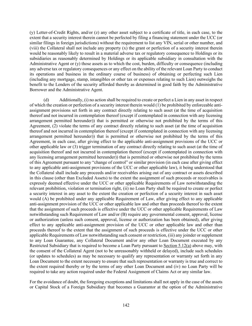 142 (y) Letter-of-Credit Rights, and/or (z) any other asset subject to a certificate of title, in each case, to the extent that a security interest therein cannot be perfected by filing a financing statement under the UCC (or similar filings in foreign jurisdictions) without the requirement to list any VIN, serial or other number, and (viii) the Collateral shall not include any property (x) the grant or perfection of a security interest therein would be reasonably likely to result in a material adverse tax or regulatory consequence to Holdings or its subsidiaries as reasonably determined by Holdings or its applicable subsidiary in consultation with the Administrative Agent or (y) those assets as to which the cost, burden, difficulty or consequence (including any adverse tax or regulatory consequences or any effect on the ability of the relevant Loan Party to conduct its operations and business in the ordinary course of business) of obtaining or perfecting such Lien (including any mortgage, stamp, intangibles or other tax or expenses relating to such Lien) outweighs the benefit to the Lenders of the security afforded thereby as determined in good faith by the Administrative Borrower and the Administrative Agent. (d) Additionally, (i) no action shall be required to create or perfect a Lien in any asset in respect of which the creation or perfection of a security interest therein would (1) be prohibited by enforceable anti- assignment provisions set forth in any contract directly relating to such asset (at the time of acquisition thereof and not incurred in contemplation thereof (except if contemplated in connection with any licensing arrangement permitted hereunder)) that is permitted or otherwise not prohibited by the terms of this Agreement, (2) violate the terms of any contract directly relating to such asset (at the time of acquisition thereof and not incurred in contemplation thereof (except if contemplated in connection with any licensing arrangement permitted hereunder)) that is permitted or otherwise not prohibited by the terms of this Agreement, in each case, after giving effect to the applicable anti-assignment provisions of the UCC or other applicable law or (3) trigger termination of any contract directly relating to such asset (at the time of acquisition thereof and not incurred in contemplation thereof (except if contemplated in connection with any licensing arrangement permitted hereunder)) that is permitted or otherwise not prohibited by the terms of this Agreement pursuant to any “change of control” or similar provision (in each case after giving effect to any applicable anti-assignment provisions of the UCC or other applicable law), it being understood that the Collateral shall include any proceeds and/or receivables arising out of any contract or assets described in this clause (other than Excluded Assets) to the extent the assignment of such proceeds or receivables is expressly deemed effective under the UCC or other applicable Requirements of Law notwithstanding the relevant prohibition, violation or termination right, (ii) no Loan Party shall be required to create or perfect a security interest in any asset to the extent the creation or perfection of a security interest in such asset would (A) be prohibited under any applicable Requirement of Law, after giving effect to any applicable anti-assignment provision of the UCC or other applicable law and other than proceeds thereof to the extent that the assignment of such proceeds is effective under the UCC or other applicable Requirements of Law notwithstanding such Requirement of Law and/or (B) require any governmental consent, approval, license or authorization (unless such consent, approval, license or authorization has been obtained), after giving effect to any applicable anti-assignment provision of the UCC or other applicable law and other than proceeds thereof to the extent that the assignment of such proceeds is effective under the UCC or other applicable Requirements of Law notwithstanding such consent or restriction, (iii) any joinder or supplement to any Loan Guarantee, any Collateral Document and/or any other Loan Document executed by any Restricted Subsidiary that is required to become a Loan Party pursuant to Section 5.12(a) above may, with the consent of the Collateral Agent (not to be unreasonably withheld or delayed), include such schedules (or updates to schedules) as may be necessary to qualify any representation or warranty set forth in any Loan Document to the extent necessary to ensure that such representation or warranty is true and correct to the extent required thereby or by the terms of any other Loan Document and (iv) no Loan Party will be required to take any action required under the Federal Assignment of Claims Act or any similar law. For the avoidance of doubt, the foregoing exceptions and limitations shall not apply in the case of the assets or Capital Stock of a Foreign Subsidiary that becomes a Guarantor at the option of the Administrative