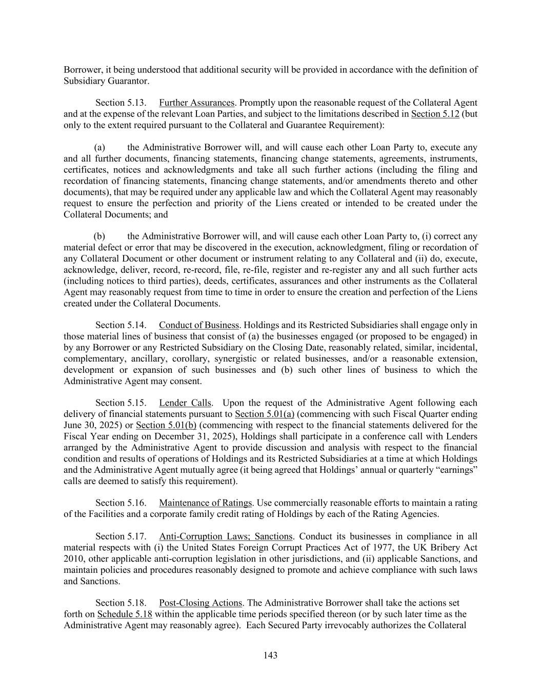143 Borrower, it being understood that additional security will be provided in accordance with the definition of Subsidiary Guarantor. Section 5.13. Further Assurances. Promptly upon the reasonable request of the Collateral Agent and at the expense of the relevant Loan Parties, and subject to the limitations described in Section 5.12 (but only to the extent required pursuant to the Collateral and Guarantee Requirement): (a) the Administrative Borrower will, and will cause each other Loan Party to, execute any and all further documents, financing statements, financing change statements, agreements, instruments, certificates, notices and acknowledgments and take all such further actions (including the filing and recordation of financing statements, financing change statements, and/or amendments thereto and other documents), that may be required under any applicable law and which the Collateral Agent may reasonably request to ensure the perfection and priority of the Liens created or intended to be created under the Collateral Documents; and (b) the Administrative Borrower will, and will cause each other Loan Party to, (i) correct any material defect or error that may be discovered in the execution, acknowledgment, filing or recordation of any Collateral Document or other document or instrument relating to any Collateral and (ii) do, execute, acknowledge, deliver, record, re-record, file, re-file, register and re-register any and all such further acts (including notices to third parties), deeds, certificates, assurances and other instruments as the Collateral Agent may reasonably request from time to time in order to ensure the creation and perfection of the Liens created under the Collateral Documents. Section 5.14. Conduct of Business. Holdings and its Restricted Subsidiaries shall engage only in those material lines of business that consist of (a) the businesses engaged (or proposed to be engaged) in by any Borrower or any Restricted Subsidiary on the Closing Date, reasonably related, similar, incidental, complementary, ancillary, corollary, synergistic or related businesses, and/or a reasonable extension, development or expansion of such businesses and (b) such other lines of business to which the Administrative Agent may consent. Section 5.15. Lender Calls. Upon the request of the Administrative Agent following each delivery of financial statements pursuant to Section 5.01(a) (commencing with such Fiscal Quarter ending June 30, 2025) or Section 5.01(b) (commencing with respect to the financial statements delivered for the Fiscal Year ending on December 31, 2025), Holdings shall participate in a conference call with Lenders arranged by the Administrative Agent to provide discussion and analysis with respect to the financial condition and results of operations of Holdings and its Restricted Subsidiaries at a time at which Holdings and the Administrative Agent mutually agree (it being agreed that Holdings’ annual or quarterly “earnings” calls are deemed to satisfy this requirement). Section 5.16. Maintenance of Ratings. Use commercially reasonable efforts to maintain a rating of the Facilities and a corporate family credit rating of Holdings by each of the Rating Agencies. Section 5.17. Anti-Corruption Laws; Sanctions. Conduct its businesses in compliance in all material respects with (i) the United States Foreign Corrupt Practices Act of 1977, the UK Bribery Act 2010, other applicable anti-corruption legislation in other jurisdictions, and (ii) applicable Sanctions, and maintain policies and procedures reasonably designed to promote and achieve compliance with such laws and Sanctions. Section 5.18. Post-Closing Actions. The Administrative Borrower shall take the actions set forth on Schedule 5.18 within the applicable time periods specified thereon (or by such later time as the Administrative Agent may reasonably agree). Each Secured Party irrevocably authorizes the Collateral