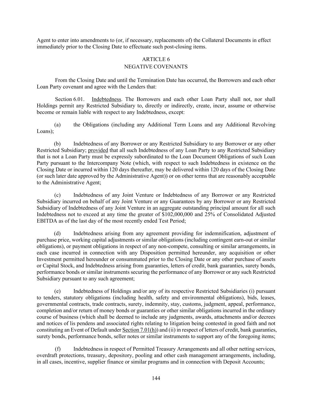 144 Agent to enter into amendments to (or, if necessary, replacements of) the Collateral Documents in effect immediately prior to the Closing Date to effectuate such post-closing items. ARTICLE 6 NEGATIVE COVENANTS From the Closing Date and until the Termination Date has occurred, the Borrowers and each other Loan Party covenant and agree with the Lenders that: Section 6.01. Indebtedness. The Borrowers and each other Loan Party shall not, nor shall Holdings permit any Restricted Subsidiary to, directly or indirectly, create, incur, assume or otherwise become or remain liable with respect to any Indebtedness, except: (a) the Obligations (including any Additional Term Loans and any Additional Revolving Loans); (b) Indebtedness of any Borrower or any Restricted Subsidiary to any Borrower or any other Restricted Subsidiary; provided that all such Indebtedness of any Loan Party to any Restricted Subsidiary that is not a Loan Party must be expressly subordinated to the Loan Document Obligations of such Loan Party pursuant to the Intercompany Note (which, with respect to such Indebtedness in existence on the Closing Date or incurred within 120 days thereafter, may be delivered within 120 days of the Closing Date (or such later date approved by the Administrative Agent)) or on other terms that are reasonably acceptable to the Administrative Agent; (c) Indebtedness of any Joint Venture or Indebtedness of any Borrower or any Restricted Subsidiary incurred on behalf of any Joint Venture or any Guarantees by any Borrower or any Restricted Subsidiary of Indebtedness of any Joint Venture in an aggregate outstanding principal amount for all such Indebtedness not to exceed at any time the greater of $102,000,000 and 25% of Consolidated Adjusted EBITDA as of the last day of the most recently ended Test Period; (d) Indebtedness arising from any agreement providing for indemnification, adjustment of purchase price, working capital adjustments or similar obligations (including contingent earn-out or similar obligations), or payment obligations in respect of any non-compete, consulting or similar arrangements, in each case incurred in connection with any Disposition permitted hereunder, any acquisition or other Investment permitted hereunder or consummated prior to the Closing Date or any other purchase of assets or Capital Stock, and Indebtedness arising from guaranties, letters of credit, bank guaranties, surety bonds, performance bonds or similar instruments securing the performance of any Borrower or any such Restricted Subsidiary pursuant to any such agreement; (e) Indebtedness of Holdings and/or any of its respective Restricted Subsidiaries (i) pursuant to tenders, statutory obligations (including health, safety and environmental obligations), bids, leases, governmental contracts, trade contracts, surety, indemnity, stay, customs, judgment, appeal, performance, completion and/or return of money bonds or guaranties or other similar obligations incurred in the ordinary course of business (which shall be deemed to include any judgments, awards, attachments and/or decrees and notices of lis pendens and associated rights relating to litigation being contested in good faith and not constituting an Event of Default under Section 7.01(h)) and (ii) in respect of letters of credit, bank guaranties, surety bonds, performance bonds, seller notes or similar instruments to support any of the foregoing items; (f) Indebtedness in respect of Permitted Treasury Arrangements and all other netting services, overdraft protections, treasury, depository, pooling and other cash management arrangements, including, in all cases, incentive, supplier finance or similar programs and in connection with Deposit Accounts;