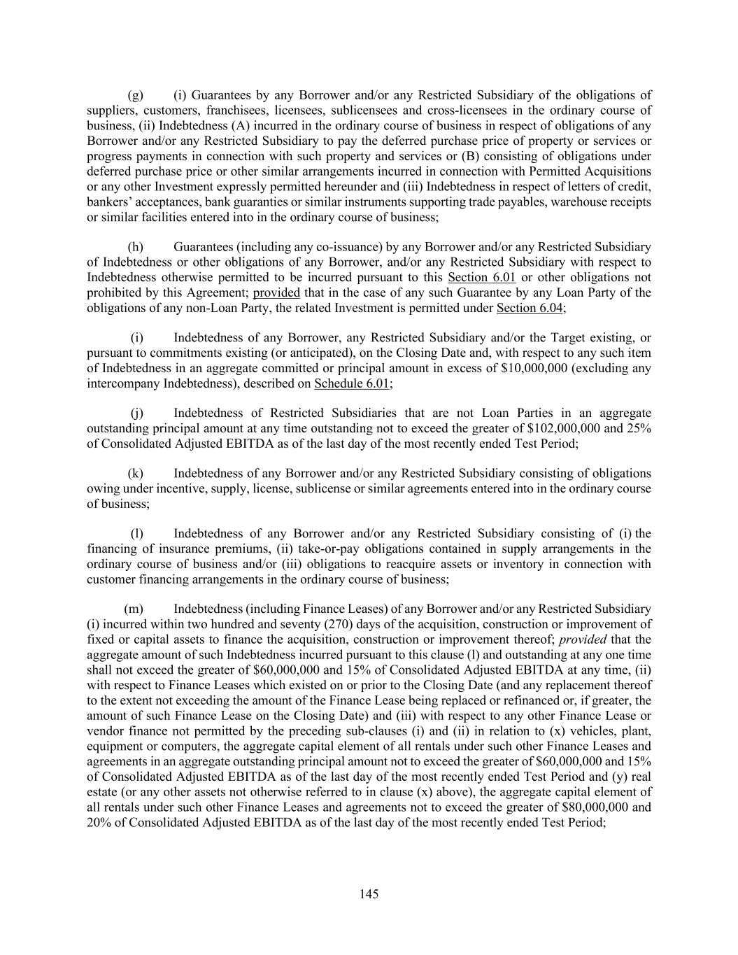 145 (g) (i) Guarantees by any Borrower and/or any Restricted Subsidiary of the obligations of suppliers, customers, franchisees, licensees, sublicensees and cross-licensees in the ordinary course of business, (ii) Indebtedness (A) incurred in the ordinary course of business in respect of obligations of any Borrower and/or any Restricted Subsidiary to pay the deferred purchase price of property or services or progress payments in connection with such property and services or (B) consisting of obligations under deferred purchase price or other similar arrangements incurred in connection with Permitted Acquisitions or any other Investment expressly permitted hereunder and (iii) Indebtedness in respect of letters of credit, bankers’ acceptances, bank guaranties or similar instruments supporting trade payables, warehouse receipts or similar facilities entered into in the ordinary course of business; (h) Guarantees (including any co-issuance) by any Borrower and/or any Restricted Subsidiary of Indebtedness or other obligations of any Borrower, and/or any Restricted Subsidiary with respect to Indebtedness otherwise permitted to be incurred pursuant to this Section 6.01 or other obligations not prohibited by this Agreement; provided that in the case of any such Guarantee by any Loan Party of the obligations of any non-Loan Party, the related Investment is permitted under Section 6.04; (i) Indebtedness of any Borrower, any Restricted Subsidiary and/or the Target existing, or pursuant to commitments existing (or anticipated), on the Closing Date and, with respect to any such item of Indebtedness in an aggregate committed or principal amount in excess of $10,000,000 (excluding any intercompany Indebtedness), described on Schedule 6.01; (j) Indebtedness of Restricted Subsidiaries that are not Loan Parties in an aggregate outstanding principal amount at any time outstanding not to exceed the greater of $102,000,000 and 25% of Consolidated Adjusted EBITDA as of the last day of the most recently ended Test Period; (k) Indebtedness of any Borrower and/or any Restricted Subsidiary consisting of obligations owing under incentive, supply, license, sublicense or similar agreements entered into in the ordinary course of business; (l) Indebtedness of any Borrower and/or any Restricted Subsidiary consisting of (i) the financing of insurance premiums, (ii) take-or-pay obligations contained in supply arrangements in the ordinary course of business and/or (iii) obligations to reacquire assets or inventory in connection with customer financing arrangements in the ordinary course of business; (m) Indebtedness (including Finance Leases) of any Borrower and/or any Restricted Subsidiary (i) incurred within two hundred and seventy (270) days of the acquisition, construction or improvement of fixed or capital assets to finance the acquisition, construction or improvement thereof; provided that the aggregate amount of such Indebtedness incurred pursuant to this clause (l) and outstanding at any one time shall not exceed the greater of $60,000,000 and 15% of Consolidated Adjusted EBITDA at any time, (ii) with respect to Finance Leases which existed on or prior to the Closing Date (and any replacement thereof to the extent not exceeding the amount of the Finance Lease being replaced or refinanced or, if greater, the amount of such Finance Lease on the Closing Date) and (iii) with respect to any other Finance Lease or vendor finance not permitted by the preceding sub-clauses (i) and (ii) in relation to (x) vehicles, plant, equipment or computers, the aggregate capital element of all rentals under such other Finance Leases and agreements in an aggregate outstanding principal amount not to exceed the greater of $60,000,000 and 15% of Consolidated Adjusted EBITDA as of the last day of the most recently ended Test Period and (y) real estate (or any other assets not otherwise referred to in clause (x) above), the aggregate capital element of all rentals under such other Finance Leases and agreements not to exceed the greater of $80,000,000 and 20% of Consolidated Adjusted EBITDA as of the last day of the most recently ended Test Period;