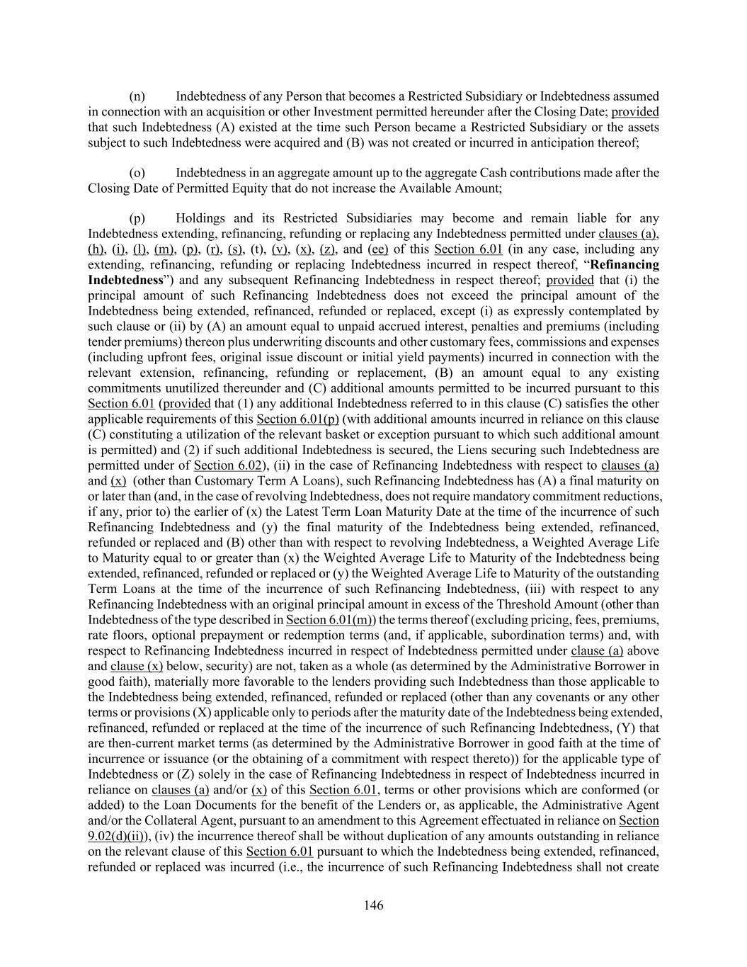 146 (n) Indebtedness of any Person that becomes a Restricted Subsidiary or Indebtedness assumed in connection with an acquisition or other Investment permitted hereunder after the Closing Date; provided that such Indebtedness (A) existed at the time such Person became a Restricted Subsidiary or the assets subject to such Indebtedness were acquired and (B) was not created or incurred in anticipation thereof; (o) Indebtedness in an aggregate amount up to the aggregate Cash contributions made after the Closing Date of Permitted Equity that do not increase the Available Amount; (p) Holdings and its Restricted Subsidiaries may become and remain liable for any Indebtedness extending, refinancing, refunding or replacing any Indebtedness permitted under clauses (a), (h), (i), (l), (m), (p), (r), (s), (t), (v), (x), (z), and (ee) of this Section 6.01 (in any case, including any extending, refinancing, refunding or replacing Indebtedness incurred in respect thereof, “Refinancing Indebtedness”) and any subsequent Refinancing Indebtedness in respect thereof; provided that (i) the principal amount of such Refinancing Indebtedness does not exceed the principal amount of the Indebtedness being extended, refinanced, refunded or replaced, except (i) as expressly contemplated by such clause or (ii) by (A) an amount equal to unpaid accrued interest, penalties and premiums (including tender premiums) thereon plus underwriting discounts and other customary fees, commissions and expenses (including upfront fees, original issue discount or initial yield payments) incurred in connection with the relevant extension, refinancing, refunding or replacement, (B) an amount equal to any existing commitments unutilized thereunder and (C) additional amounts permitted to be incurred pursuant to this Section 6.01 (provided that (1) any additional Indebtedness referred to in this clause (C) satisfies the other applicable requirements of this Section 6.01(p) (with additional amounts incurred in reliance on this clause (C) constituting a utilization of the relevant basket or exception pursuant to which such additional amount is permitted) and (2) if such additional Indebtedness is secured, the Liens securing such Indebtedness are permitted under of Section 6.02), (ii) in the case of Refinancing Indebtedness with respect to clauses (a) and (x) (other than Customary Term A Loans), such Refinancing Indebtedness has (A) a final maturity on or later than (and, in the case of revolving Indebtedness, does not require mandatory commitment reductions, if any, prior to) the earlier of (x) the Latest Term Loan Maturity Date at the time of the incurrence of such Refinancing Indebtedness and (y) the final maturity of the Indebtedness being extended, refinanced, refunded or replaced and (B) other than with respect to revolving Indebtedness, a Weighted Average Life to Maturity equal to or greater than (x) the Weighted Average Life to Maturity of the Indebtedness being extended, refinanced, refunded or replaced or (y) the Weighted Average Life to Maturity of the outstanding Term Loans at the time of the incurrence of such Refinancing Indebtedness, (iii) with respect to any Refinancing Indebtedness with an original principal amount in excess of the Threshold Amount (other than Indebtedness of the type described in Section 6.01(m)) the terms thereof (excluding pricing, fees, premiums, rate floors, optional prepayment or redemption terms (and, if applicable, subordination terms) and, with respect to Refinancing Indebtedness incurred in respect of Indebtedness permitted under clause (a) above and clause (x) below, security) are not, taken as a whole (as determined by the Administrative Borrower in good faith), materially more favorable to the lenders providing such Indebtedness than those applicable to the Indebtedness being extended, refinanced, refunded or replaced (other than any covenants or any other terms or provisions (X) applicable only to periods after the maturity date of the Indebtedness being extended, refinanced, refunded or replaced at the time of the incurrence of such Refinancing Indebtedness, (Y) that are then-current market terms (as determined by the Administrative Borrower in good faith at the time of incurrence or issuance (or the obtaining of a commitment with respect thereto)) for the applicable type of Indebtedness or (Z) solely in the case of Refinancing Indebtedness in respect of Indebtedness incurred in reliance on clauses (a) and/or (x) of this Section 6.01, terms or other provisions which are conformed (or added) to the Loan Documents for the benefit of the Lenders or, as applicable, the Administrative Agent and/or the Collateral Agent, pursuant to an amendment to this Agreement effectuated in reliance on Section 9.02(d)(ii)), (iv) the incurrence thereof shall be without duplication of any amounts outstanding in reliance on the relevant clause of this Section 6.01 pursuant to which the Indebtedness being extended, refinanced, refunded or replaced was incurred (i.e., the incurrence of such Refinancing Indebtedness shall not create