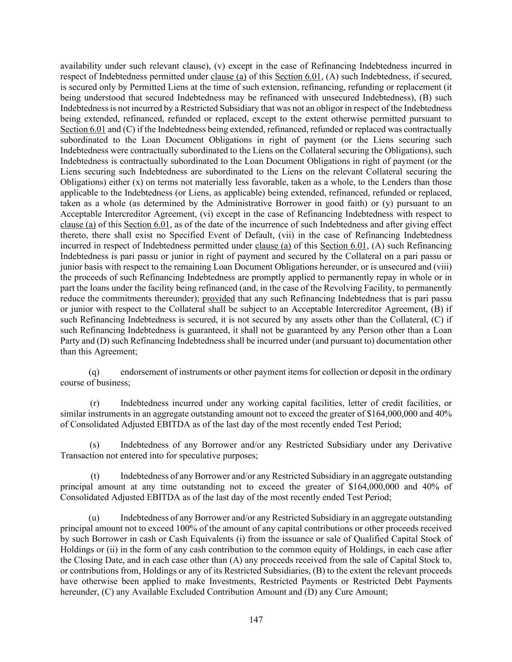147 availability under such relevant clause), (v) except in the case of Refinancing Indebtedness incurred in respect of Indebtedness permitted under clause (a) of this Section 6.01, (A) such Indebtedness, if secured, is secured only by Permitted Liens at the time of such extension, refinancing, refunding or replacement (it being understood that secured Indebtedness may be refinanced with unsecured Indebtedness), (B) such Indebtedness is not incurred by a Restricted Subsidiary that was not an obligor in respect of the Indebtedness being extended, refinanced, refunded or replaced, except to the extent otherwise permitted pursuant to Section 6.01 and (C) if the Indebtedness being extended, refinanced, refunded or replaced was contractually subordinated to the Loan Document Obligations in right of payment (or the Liens securing such Indebtedness were contractually subordinated to the Liens on the Collateral securing the Obligations), such Indebtedness is contractually subordinated to the Loan Document Obligations in right of payment (or the Liens securing such Indebtedness are subordinated to the Liens on the relevant Collateral securing the Obligations) either (x) on terms not materially less favorable, taken as a whole, to the Lenders than those applicable to the Indebtedness (or Liens, as applicable) being extended, refinanced, refunded or replaced, taken as a whole (as determined by the Administrative Borrower in good faith) or (y) pursuant to an Acceptable Intercreditor Agreement, (vi) except in the case of Refinancing Indebtedness with respect to clause (a) of this Section 6.01, as of the date of the incurrence of such Indebtedness and after giving effect thereto, there shall exist no Specified Event of Default, (vii) in the case of Refinancing Indebtedness incurred in respect of Indebtedness permitted under clause (a) of this Section 6.01, (A) such Refinancing Indebtedness is pari passu or junior in right of payment and secured by the Collateral on a pari passu or junior basis with respect to the remaining Loan Document Obligations hereunder, or is unsecured and (viii) the proceeds of such Refinancing Indebtedness are promptly applied to permanently repay in whole or in part the loans under the facility being refinanced (and, in the case of the Revolving Facility, to permanently reduce the commitments thereunder); provided that any such Refinancing Indebtedness that is pari passu or junior with respect to the Collateral shall be subject to an Acceptable Intercreditor Agreement, (B) if such Refinancing Indebtedness is secured, it is not secured by any assets other than the Collateral, (C) if such Refinancing Indebtedness is guaranteed, it shall not be guaranteed by any Person other than a Loan Party and (D) such Refinancing Indebtedness shall be incurred under (and pursuant to) documentation other than this Agreement; (q) endorsement of instruments or other payment items for collection or deposit in the ordinary course of business; (r) Indebtedness incurred under any working capital facilities, letter of credit facilities, or similar instruments in an aggregate outstanding amount not to exceed the greater of $164,000,000 and 40% of Consolidated Adjusted EBITDA as of the last day of the most recently ended Test Period; (s) Indebtedness of any Borrower and/or any Restricted Subsidiary under any Derivative Transaction not entered into for speculative purposes; (t) Indebtedness of any Borrower and/or any Restricted Subsidiary in an aggregate outstanding principal amount at any time outstanding not to exceed the greater of $164,000,000 and 40% of Consolidated Adjusted EBITDA as of the last day of the most recently ended Test Period; (u) Indebtedness of any Borrower and/or any Restricted Subsidiary in an aggregate outstanding principal amount not to exceed 100% of the amount of any capital contributions or other proceeds received by such Borrower in cash or Cash Equivalents (i) from the issuance or sale of Qualified Capital Stock of Holdings or (ii) in the form of any cash contribution to the common equity of Holdings, in each case after the Closing Date, and in each case other than (A) any proceeds received from the sale of Capital Stock to, or contributions from, Holdings or any of its Restricted Subsidiaries, (B) to the extent the relevant proceeds have otherwise been applied to make Investments, Restricted Payments or Restricted Debt Payments hereunder, (C) any Available Excluded Contribution Amount and (D) any Cure Amount;