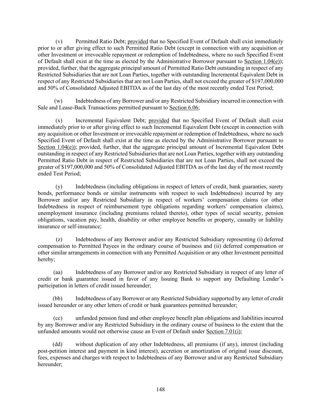 148 (v) Permitted Ratio Debt; provided that no Specified Event of Default shall exist immediately prior to or after giving effect to such Permitted Ratio Debt (except in connection with any acquisition or other Investment or irrevocable repayment or redemption of Indebtedness, where no such Specified Event of Default shall exist at the time as elected by the Administrative Borrower pursuant to Section 1.04(e)); provided, further, that the aggregate principal amount of Permitted Ratio Debt outstanding in respect of any Restricted Subsidiaries that are not Loan Parties, together with outstanding Incremental Equivalent Debt in respect of any Restricted Subsidiaries that are not Loan Parties, shall not exceed the greater of $197,000,000 and 50% of Consolidated Adjusted EBITDA as of the last day of the most recently ended Test Period; (w) Indebtedness of any Borrower and/or any Restricted Subsidiary incurred in connection with Sale and Lease-Back Transactions permitted pursuant to Section 6.06; (x) Incremental Equivalent Debt; provided that no Specified Event of Default shall exist immediately prior to or after giving effect to such Incremental Equivalent Debt (except in connection with any acquisition or other Investment or irrevocable repayment or redemption of Indebtedness, where no such Specified Event of Default shall exist at the time as elected by the Administrative Borrower pursuant to Section 1.04(e)); provided, further, that the aggregate principal amount of Incremental Equivalent Debt outstanding in respect of any Restricted Subsidiaries that are not Loan Parties, together with any outstanding Permitted Ratio Debt in respect of Restricted Subsidiaries that are not Loan Parties, shall not exceed the greater of $197,000,000 and 50% of Consolidated Adjusted EBITDA as of the last day of the most recently ended Test Period; (y) Indebtedness (including obligations in respect of letters of credit, bank guaranties, surety bonds, performance bonds or similar instruments with respect to such Indebtedness) incurred by any Borrower and/or any Restricted Subsidiary in respect of workers’ compensation claims (or other Indebtedness in respect of reimbursement type obligations regarding workers’ compensation claims), unemployment insurance (including premiums related thereto), other types of social security, pension obligations, vacation pay, health, disability or other employee benefits or property, casualty or liability insurance or self-insurance; (z) Indebtedness of any Borrower and/or any Restricted Subsidiary representing (i) deferred compensation to Permitted Payees in the ordinary course of business and (ii) deferred compensation or other similar arrangements in connection with any Permitted Acquisition or any other Investment permitted hereby; (aa) Indebtedness of any Borrower and/or any Restricted Subsidiary in respect of any letter of credit or bank guarantee issued in favor of any Issuing Bank to support any Defaulting Lender’s participation in letters of credit issued hereunder; (bb) Indebtedness of any Borrower or any Restricted Subsidiary supported by any letter of credit issued hereunder or any other letters of credit or bank guarantees permitted hereunder; (cc) unfunded pension fund and other employee benefit plan obligations and liabilities incurred by any Borrower and/or any Restricted Subsidiary in the ordinary course of business to the extent that the unfunded amounts would not otherwise cause an Event of Default under Section 7.01(i); (dd) without duplication of any other Indebtedness, all premiums (if any), interest (including post-petition interest and payment in kind interest), accretion or amortization of original issue discount, fees, expenses and charges with respect to Indebtedness of any Borrower and/or any Restricted Subsidiary hereunder;