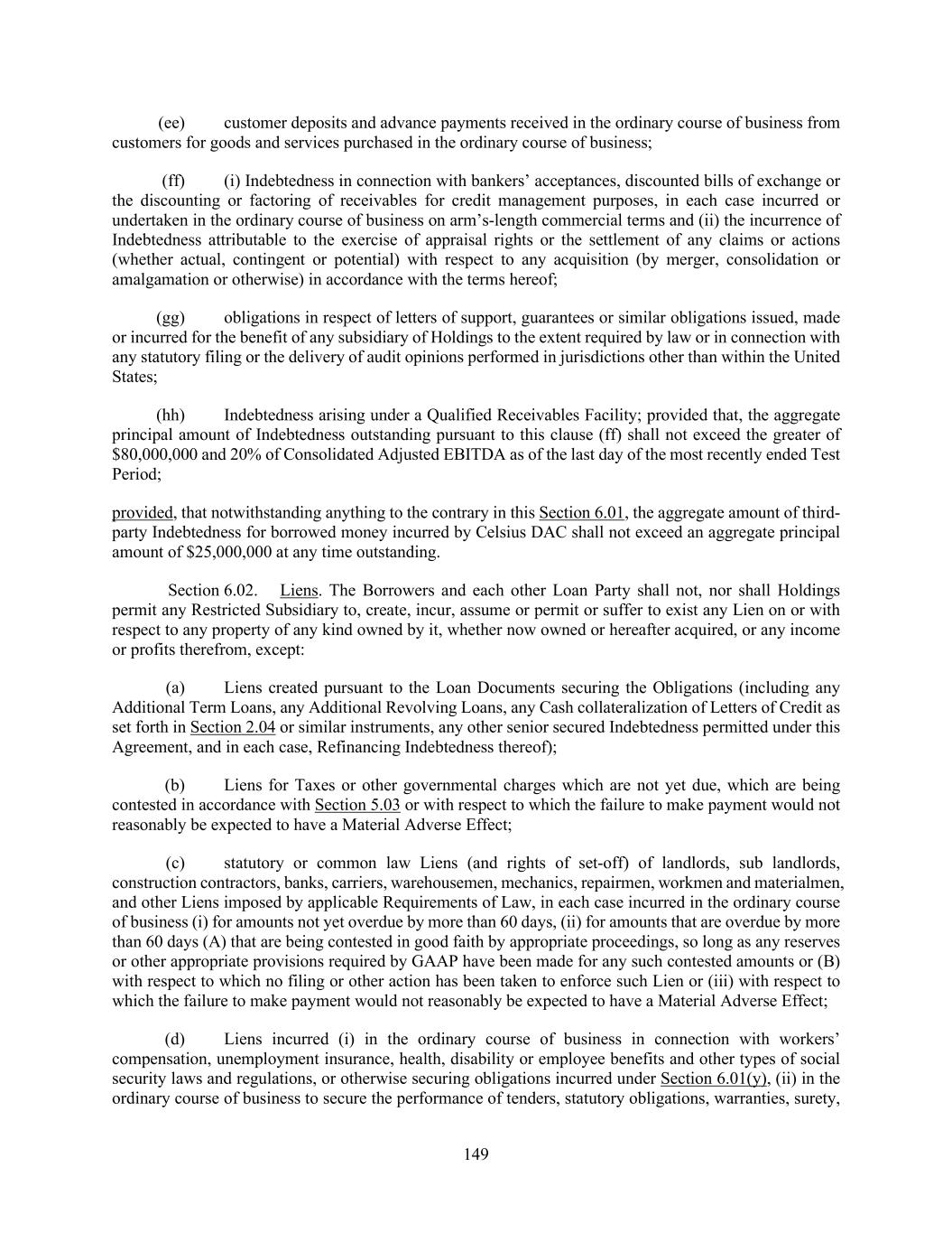 149 (ee) customer deposits and advance payments received in the ordinary course of business from customers for goods and services purchased in the ordinary course of business; (ff) (i) Indebtedness in connection with bankers’ acceptances, discounted bills of exchange or the discounting or factoring of receivables for credit management purposes, in each case incurred or undertaken in the ordinary course of business on arm’s-length commercial terms and (ii) the incurrence of Indebtedness attributable to the exercise of appraisal rights or the settlement of any claims or actions (whether actual, contingent or potential) with respect to any acquisition (by merger, consolidation or amalgamation or otherwise) in accordance with the terms hereof; (gg) obligations in respect of letters of support, guarantees or similar obligations issued, made or incurred for the benefit of any subsidiary of Holdings to the extent required by law or in connection with any statutory filing or the delivery of audit opinions performed in jurisdictions other than within the United States; (hh) Indebtedness arising under a Qualified Receivables Facility; provided that, the aggregate principal amount of Indebtedness outstanding pursuant to this clause (ff) shall not exceed the greater of $80,000,000 and 20% of Consolidated Adjusted EBITDA as of the last day of the most recently ended Test Period; provided, that notwithstanding anything to the contrary in this Section 6.01, the aggregate amount of third- party Indebtedness for borrowed money incurred by Celsius DAC shall not exceed an aggregate principal amount of $25,000,000 at any time outstanding. Section 6.02. Liens. The Borrowers and each other Loan Party shall not, nor shall Holdings permit any Restricted Subsidiary to, create, incur, assume or permit or suffer to exist any Lien on or with respect to any property of any kind owned by it, whether now owned or hereafter acquired, or any income or profits therefrom, except: (a) Liens created pursuant to the Loan Documents securing the Obligations (including any Additional Term Loans, any Additional Revolving Loans, any Cash collateralization of Letters of Credit as set forth in Section 2.04 or similar instruments, any other senior secured Indebtedness permitted under this Agreement, and in each case, Refinancing Indebtedness thereof); (b) Liens for Taxes or other governmental charges which are not yet due, which are being contested in accordance with Section 5.03 or with respect to which the failure to make payment would not reasonably be expected to have a Material Adverse Effect; (c) statutory or common law Liens (and rights of set-off) of landlords, sub landlords, construction contractors, banks, carriers, warehousemen, mechanics, repairmen, workmen and materialmen, and other Liens imposed by applicable Requirements of Law, in each case incurred in the ordinary course of business (i) for amounts not yet overdue by more than 60 days, (ii) for amounts that are overdue by more than 60 days (A) that are being contested in good faith by appropriate proceedings, so long as any reserves or other appropriate provisions required by GAAP have been made for any such contested amounts or (B) with respect to which no filing or other action has been taken to enforce such Lien or (iii) with respect to which the failure to make payment would not reasonably be expected to have a Material Adverse Effect; (d) Liens incurred (i) in the ordinary course of business in connection with workers’ compensation, unemployment insurance, health, disability or employee benefits and other types of social security laws and regulations, or otherwise securing obligations incurred under Section 6.01(y), (ii) in the ordinary course of business to secure the performance of tenders, statutory obligations, warranties, surety,