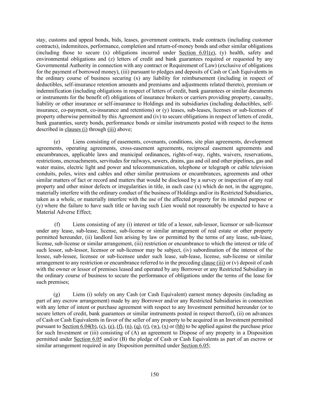 150 stay, customs and appeal bonds, bids, leases, government contracts, trade contracts (including customer contracts), indemnitees, performance, completion and return-of-money bonds and other similar obligations (including those to secure (x) obligations incurred under Section 6.01(e), (y) health, safety and environmental obligations and (z) letters of credit and bank guarantees required or requested by any Governmental Authority in connection with any contract or Requirement of Law) (exclusive of obligations for the payment of borrowed money), (iii) pursuant to pledges and deposits of Cash or Cash Equivalents in the ordinary course of business securing (x) any liability for reimbursement (including in respect of deductibles, self-insurance retention amounts and premiums and adjustments related thereto), premium or indemnification (including obligations in respect of letters of credit, bank guarantees or similar documents or instruments for the benefit of) obligations of insurance brokers or carriers providing property, casualty, liability or other insurance or self-insurance to Holdings and its subsidiaries (including deductibles, self- insurance, co-payment, co-insurance and retentions) or (y) leases, sub-leases, licenses or sub-licenses of property otherwise permitted by this Agreement and (iv) to secure obligations in respect of letters of credit, bank guaranties, surety bonds, performance bonds or similar instruments posted with respect to the items described in clauses (i) through (iii) above; (e) Liens consisting of easements, covenants, conditions, site plan agreements, development agreements, operating agreements, cross-easement agreements, reciprocal easement agreements and encumbrances, applicable laws and municipal ordinances, rights-of-way, rights, waivers, reservations, restrictions, encroachments, servitudes for railways, sewers, drains, gas and oil and other pipelines, gas and water mains, electric light and power and telecommunication, telephone or telegraph or cable television conduits, poles, wires and cables and other similar protrusions or encumbrances, agreements and other similar matters of fact or record and matters that would be disclosed by a survey or inspection of any real property and other minor defects or irregularities in title, in each case (x) which do not, in the aggregate, materially interfere with the ordinary conduct of the business of Holdings and/or its Restricted Subsidiaries, taken as a whole, or materially interfere with the use of the affected property for its intended purpose or (y) where the failure to have such title or having such Lien would not reasonably be expected to have a Material Adverse Effect; (f) Liens consisting of any (i) interest or title of a lessor, sub-lessor, licensor or sub-licensor under any lease, sub-lease, license, sub-license or similar arrangement of real estate or other property permitted hereunder, (ii) landlord lien arising by law or permitted by the terms of any lease, sub-lease, license, sub-license or similar arrangement, (iii) restriction or encumbrance to which the interest or title of such lessor, sub-lessor, licensor or sub-licensor may be subject, (iv) subordination of the interest of the lessee, sub-lessee, licensee or sub-licensee under such lease, sub-lease, license, sub-license or similar arrangement to any restriction or encumbrance referred to in the preceding clause (iii) or (v) deposit of cash with the owner or lessor of premises leased and operated by any Borrower or any Restricted Subsidiary in the ordinary course of business to secure the performance of obligations under the terms of the lease for such premises; (g) Liens (i) solely on any Cash (or Cash Equivalent) earnest money deposits (including as part of any escrow arrangement) made by any Borrower and/or any Restricted Subsidiaries in connection with any letter of intent or purchase agreement with respect to any Investment permitted hereunder (or to secure letters of credit, bank guarantees or similar instruments posted in respect thereof), (ii) on advances of Cash or Cash Equivalents in favor of the seller of any property to be acquired in an Investment permitted pursuant to Section 6.04(b), (c), (e), (f), (n), (q), (r), (w), (x) or (hh) to be applied against the purchase price for such Investment or (iii) consisting of (A) an agreement to Dispose of any property in a Disposition permitted under Section 6.05 and/or (B) the pledge of Cash or Cash Equivalents as part of an escrow or similar arrangement required in any Disposition permitted under Section 6.05;