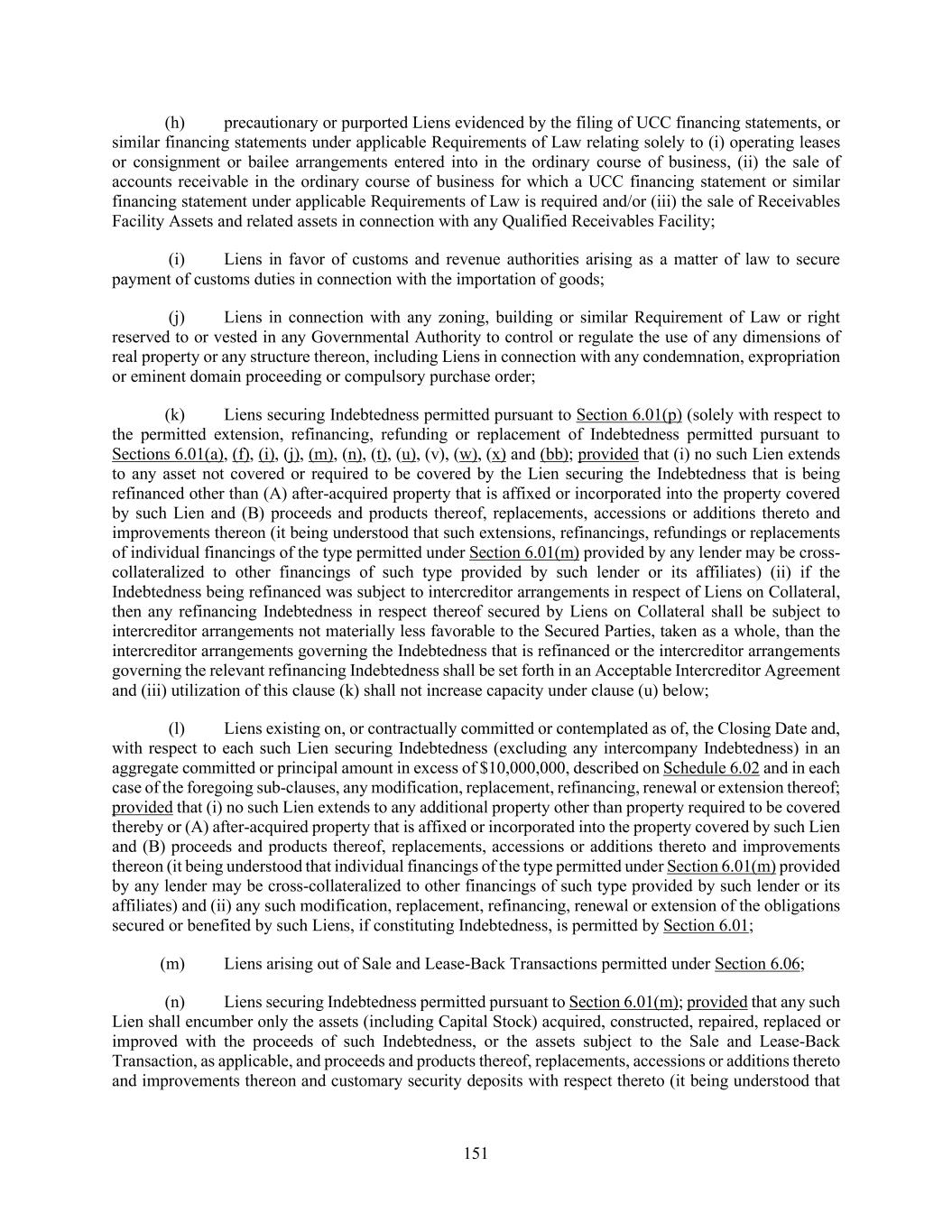 151 (h) precautionary or purported Liens evidenced by the filing of UCC financing statements, or similar financing statements under applicable Requirements of Law relating solely to (i) operating leases or consignment or bailee arrangements entered into in the ordinary course of business, (ii) the sale of accounts receivable in the ordinary course of business for which a UCC financing statement or similar financing statement under applicable Requirements of Law is required and/or (iii) the sale of Receivables Facility Assets and related assets in connection with any Qualified Receivables Facility; (i) Liens in favor of customs and revenue authorities arising as a matter of law to secure payment of customs duties in connection with the importation of goods; (j) Liens in connection with any zoning, building or similar Requirement of Law or right reserved to or vested in any Governmental Authority to control or regulate the use of any dimensions of real property or any structure thereon, including Liens in connection with any condemnation, expropriation or eminent domain proceeding or compulsory purchase order; (k) Liens securing Indebtedness permitted pursuant to Section 6.01(p) (solely with respect to the permitted extension, refinancing, refunding or replacement of Indebtedness permitted pursuant to Sections 6.01(a), (f), (i), (j), (m), (n), (t), (u), (v), (w), (x) and (bb); provided that (i) no such Lien extends to any asset not covered or required to be covered by the Lien securing the Indebtedness that is being refinanced other than (A) after-acquired property that is affixed or incorporated into the property covered by such Lien and (B) proceeds and products thereof, replacements, accessions or additions thereto and improvements thereon (it being understood that such extensions, refinancings, refundings or replacements of individual financings of the type permitted under Section 6.01(m) provided by any lender may be cross- collateralized to other financings of such type provided by such lender or its affiliates) (ii) if the Indebtedness being refinanced was subject to intercreditor arrangements in respect of Liens on Collateral, then any refinancing Indebtedness in respect thereof secured by Liens on Collateral shall be subject to intercreditor arrangements not materially less favorable to the Secured Parties, taken as a whole, than the intercreditor arrangements governing the Indebtedness that is refinanced or the intercreditor arrangements governing the relevant refinancing Indebtedness shall be set forth in an Acceptable Intercreditor Agreement and (iii) utilization of this clause (k) shall not increase capacity under clause (u) below; (l) Liens existing on, or contractually committed or contemplated as of, the Closing Date and, with respect to each such Lien securing Indebtedness (excluding any intercompany Indebtedness) in an aggregate committed or principal amount in excess of $10,000,000, described on Schedule 6.02 and in each case of the foregoing sub-clauses, any modification, replacement, refinancing, renewal or extension thereof; provided that (i) no such Lien extends to any additional property other than property required to be covered thereby or (A) after-acquired property that is affixed or incorporated into the property covered by such Lien and (B) proceeds and products thereof, replacements, accessions or additions thereto and improvements thereon (it being understood that individual financings of the type permitted under Section 6.01(m) provided by any lender may be cross-collateralized to other financings of such type provided by such lender or its affiliates) and (ii) any such modification, replacement, refinancing, renewal or extension of the obligations secured or benefited by such Liens, if constituting Indebtedness, is permitted by Section 6.01; (m) Liens arising out of Sale and Lease-Back Transactions permitted under Section 6.06; (n) Liens securing Indebtedness permitted pursuant to Section 6.01(m); provided that any such Lien shall encumber only the assets (including Capital Stock) acquired, constructed, repaired, replaced or improved with the proceeds of such Indebtedness, or the assets subject to the Sale and Lease-Back Transaction, as applicable, and proceeds and products thereof, replacements, accessions or additions thereto and improvements thereon and customary security deposits with respect thereto (it being understood that
