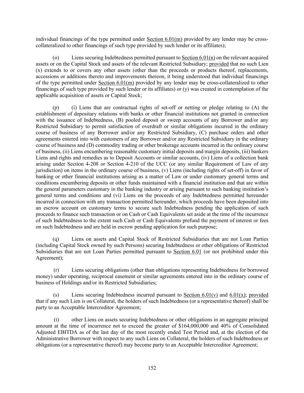 152 individual financings of the type permitted under Section 6.01(m) provided by any lender may be cross- collateralized to other financings of such type provided by such lender or its affiliates); (o) Liens securing Indebtedness permitted pursuant to Section 6.01(n) on the relevant acquired assets or on the Capital Stock and assets of the relevant Restricted Subsidiary; provided that no such Lien (x) extends to or covers any other assets (other than the proceeds or products thereof, replacements, accessions or additions thereto and improvements thereon, it being understood that individual financings of the type permitted under Section 6.01(m) provided by any lender may be cross-collateralized to other financings of such type provided by such lender or its affiliates) or (y) was created in contemplation of the applicable acquisition of assets or Capital Stock; (p) (i) Liens that are contractual rights of set-off or netting or pledge relating to (A) the establishment of depositary relations with banks or other financial institutions not granted in connection with the issuance of Indebtedness, (B) pooled deposit or sweep accounts of any Borrower and/or any Restricted Subsidiary to permit satisfaction of overdraft or similar obligations incurred in the ordinary course of business of any Borrower and/or any Restricted Subsidiary, (C) purchase orders and other agreements entered into with customers of any Borrower and/or any Restricted Subsidiary in the ordinary course of business and (D) commodity trading or other brokerage accounts incurred in the ordinary course of business, (ii) Liens encumbering reasonable customary initial deposits and margin deposits, (iii) bankers Liens and rights and remedies as to Deposit Accounts or similar accounts, (iv) Liens of a collection bank arising under Section 4-208 or Section 4-210 of the UCC (or any similar Requirement of Law of any jurisdiction) on items in the ordinary course of business, (v) Liens (including rights of set-off) in favor of banking or other financial institutions arising as a matter of Law or under customary general terms and conditions encumbering deposits or other funds maintained with a financial institution and that are within the general parameters customary in the banking industry or arising pursuant to such banking institution’s general terms and conditions and (vi) Liens on the proceeds of any Indebtedness permitted hereunder incurred in connection with any transaction permitted hereunder, which proceeds have been deposited into an escrow account on customary terms to secure such Indebtedness pending the application of such proceeds to finance such transaction or on Cash or Cash Equivalents set aside at the time of the incurrence of such Indebtedness to the extent such Cash or Cash Equivalents prefund the payment of interest or fees on such Indebtedness and are held in escrow pending application for such purpose; (q) Liens on assets and Capital Stock of Restricted Subsidiaries that are not Loan Parties (including Capital Stock owned by such Persons) securing Indebtedness or other obligations of Restricted Subsidiaries that are not Loan Parties permitted pursuant to Section 6.01 (or not prohibited under this Agreement); (r) Liens securing obligations (other than obligations representing Indebtedness for borrowed money) under operating, reciprocal easement or similar agreements entered into in the ordinary course of business of Holdings and/or its Restricted Subsidiaries; (s) Liens securing Indebtedness incurred pursuant to Section 6.01(v) and 6.01(x); provided that if any such Lien is on Collateral, the holders of such Indebtedness (or a representative thereof) shall be party to an Acceptable Intercreditor Agreement; (t) other Liens on assets securing Indebtedness or other obligations in an aggregate principal amount at the time of incurrence not to exceed the greater of $164,000,000 and 40% of Consolidated Adjusted EBITDA as of the last day of the most recently ended Test Period and, at the election of the Administrative Borrower with respect to any such Liens on Collateral, the holders of such Indebtedness or obligations (or a representative thereof) may become party to an Acceptable Intercreditor Agreement;