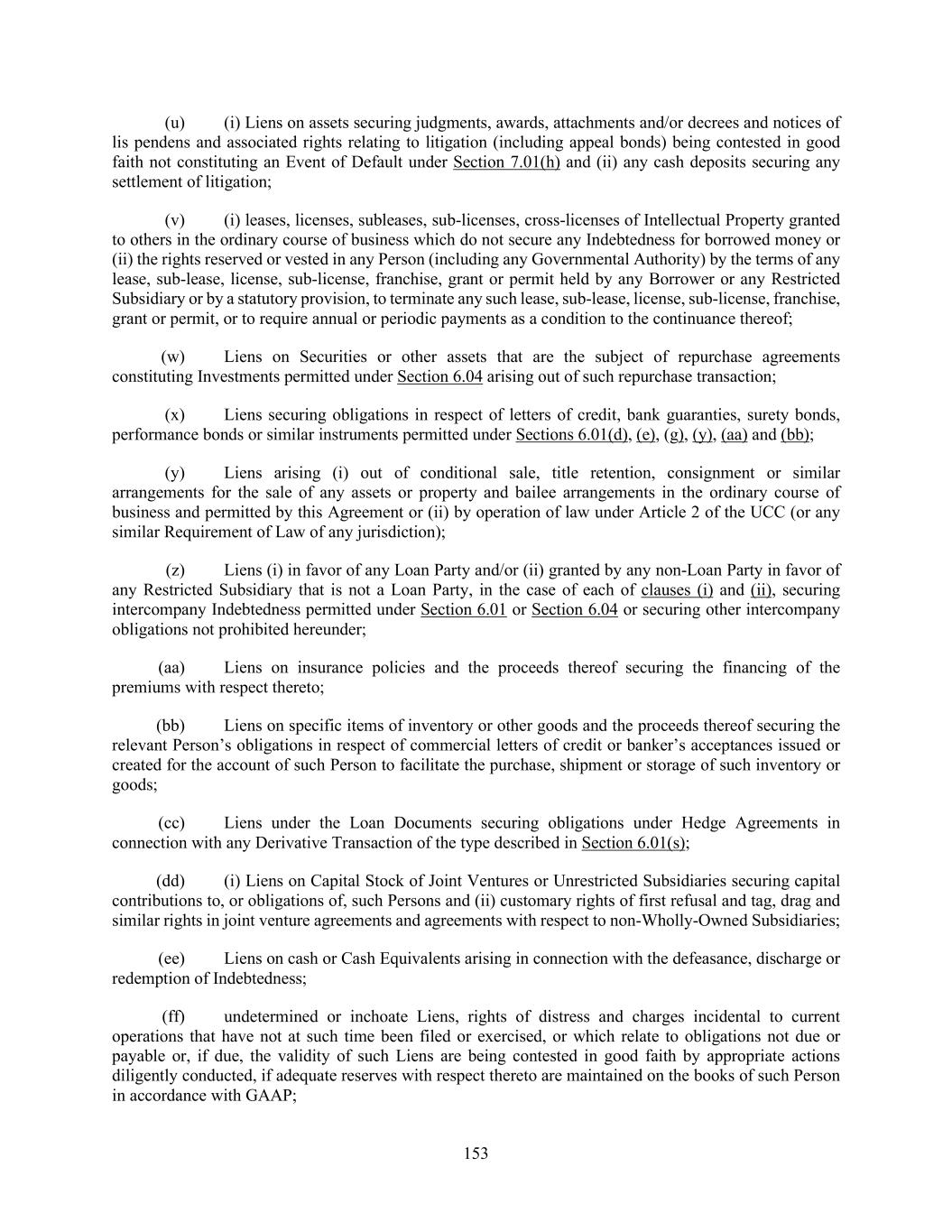 153 (u) (i) Liens on assets securing judgments, awards, attachments and/or decrees and notices of lis pendens and associated rights relating to litigation (including appeal bonds) being contested in good faith not constituting an Event of Default under Section 7.01(h) and (ii) any cash deposits securing any settlement of litigation; (v) (i) leases, licenses, subleases, sub-licenses, cross-licenses of Intellectual Property granted to others in the ordinary course of business which do not secure any Indebtedness for borrowed money or (ii) the rights reserved or vested in any Person (including any Governmental Authority) by the terms of any lease, sub-lease, license, sub-license, franchise, grant or permit held by any Borrower or any Restricted Subsidiary or by a statutory provision, to terminate any such lease, sub-lease, license, sub-license, franchise, grant or permit, or to require annual or periodic payments as a condition to the continuance thereof; (w) Liens on Securities or other assets that are the subject of repurchase agreements constituting Investments permitted under Section 6.04 arising out of such repurchase transaction; (x) Liens securing obligations in respect of letters of credit, bank guaranties, surety bonds, performance bonds or similar instruments permitted under Sections 6.01(d), (e), (g), (y), (aa) and (bb); (y) Liens arising (i) out of conditional sale, title retention, consignment or similar arrangements for the sale of any assets or property and bailee arrangements in the ordinary course of business and permitted by this Agreement or (ii) by operation of law under Article 2 of the UCC (or any similar Requirement of Law of any jurisdiction); (z) Liens (i) in favor of any Loan Party and/or (ii) granted by any non-Loan Party in favor of any Restricted Subsidiary that is not a Loan Party, in the case of each of clauses (i) and (ii), securing intercompany Indebtedness permitted under Section 6.01 or Section 6.04 or securing other intercompany obligations not prohibited hereunder; (aa) Liens on insurance policies and the proceeds thereof securing the financing of the premiums with respect thereto; (bb) Liens on specific items of inventory or other goods and the proceeds thereof securing the relevant Person’s obligations in respect of commercial letters of credit or banker’s acceptances issued or created for the account of such Person to facilitate the purchase, shipment or storage of such inventory or goods; (cc) Liens under the Loan Documents securing obligations under Hedge Agreements in connection with any Derivative Transaction of the type described in Section 6.01(s); (dd) (i) Liens on Capital Stock of Joint Ventures or Unrestricted Subsidiaries securing capital contributions to, or obligations of, such Persons and (ii) customary rights of first refusal and tag, drag and similar rights in joint venture agreements and agreements with respect to non-Wholly-Owned Subsidiaries; (ee) Liens on cash or Cash Equivalents arising in connection with the defeasance, discharge or redemption of Indebtedness; (ff) undetermined or inchoate Liens, rights of distress and charges incidental to current operations that have not at such time been filed or exercised, or which relate to obligations not due or payable or, if due, the validity of such Liens are being contested in good faith by appropriate actions diligently conducted, if adequate reserves with respect thereto are maintained on the books of such Person in accordance with GAAP;
