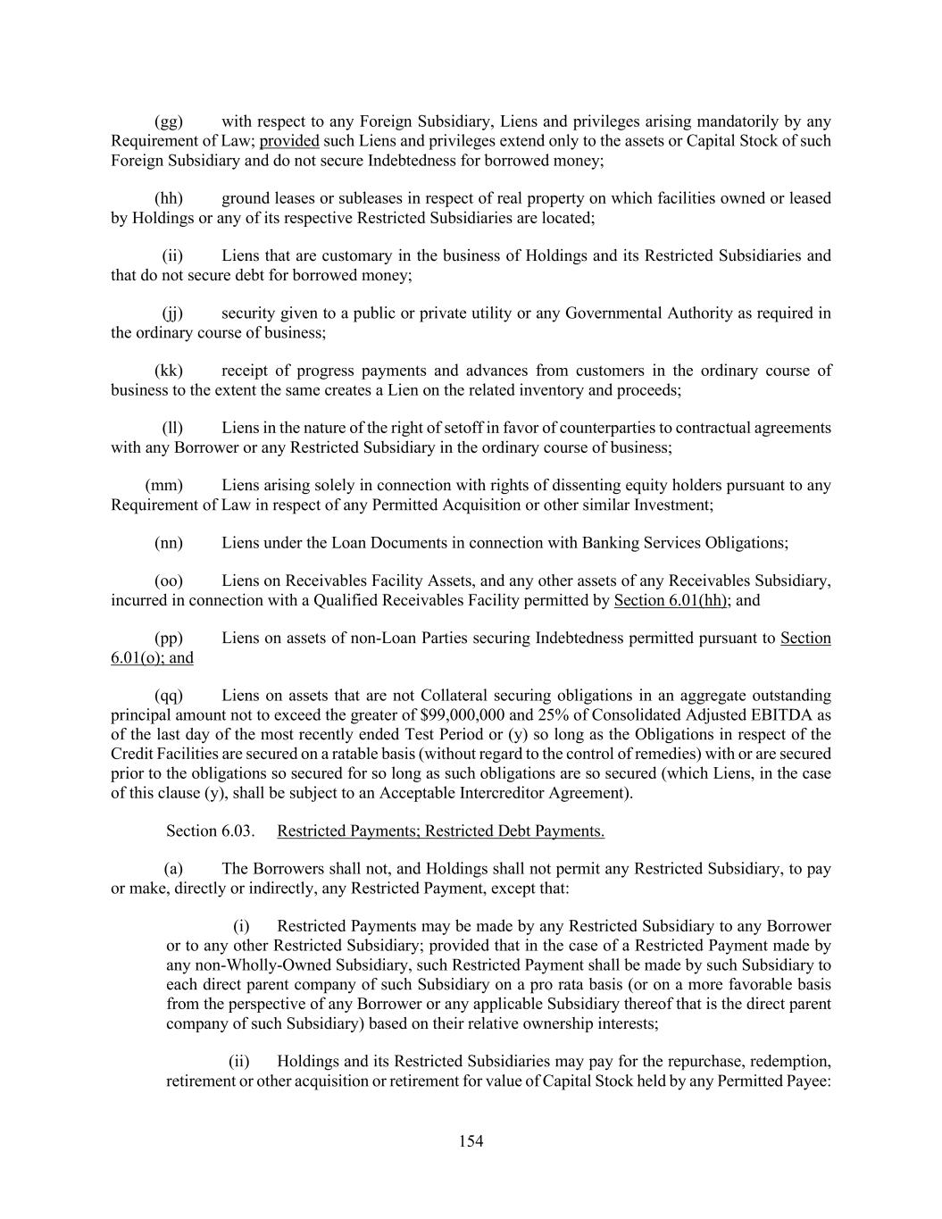 154 (gg) with respect to any Foreign Subsidiary, Liens and privileges arising mandatorily by any Requirement of Law; provided such Liens and privileges extend only to the assets or Capital Stock of such Foreign Subsidiary and do not secure Indebtedness for borrowed money; (hh) ground leases or subleases in respect of real property on which facilities owned or leased by Holdings or any of its respective Restricted Subsidiaries are located; (ii) Liens that are customary in the business of Holdings and its Restricted Subsidiaries and that do not secure debt for borrowed money; (jj) security given to a public or private utility or any Governmental Authority as required in the ordinary course of business; (kk) receipt of progress payments and advances from customers in the ordinary course of business to the extent the same creates a Lien on the related inventory and proceeds; (ll) Liens in the nature of the right of setoff in favor of counterparties to contractual agreements with any Borrower or any Restricted Subsidiary in the ordinary course of business; (mm) Liens arising solely in connection with rights of dissenting equity holders pursuant to any Requirement of Law in respect of any Permitted Acquisition or other similar Investment; (nn) Liens under the Loan Documents in connection with Banking Services Obligations; (oo) Liens on Receivables Facility Assets, and any other assets of any Receivables Subsidiary, incurred in connection with a Qualified Receivables Facility permitted by Section 6.01(hh); and (pp) Liens on assets of non-Loan Parties securing Indebtedness permitted pursuant to Section 6.01(o); and (qq) Liens on assets that are not Collateral securing obligations in an aggregate outstanding principal amount not to exceed the greater of $99,000,000 and 25% of Consolidated Adjusted EBITDA as of the last day of the most recently ended Test Period or (y) so long as the Obligations in respect of the Credit Facilities are secured on a ratable basis (without regard to the control of remedies) with or are secured prior to the obligations so secured for so long as such obligations are so secured (which Liens, in the case of this clause (y), shall be subject to an Acceptable Intercreditor Agreement). Section 6.03. Restricted Payments; Restricted Debt Payments. (a) The Borrowers shall not, and Holdings shall not permit any Restricted Subsidiary, to pay or make, directly or indirectly, any Restricted Payment, except that: (i) Restricted Payments may be made by any Restricted Subsidiary to any Borrower or to any other Restricted Subsidiary; provided that in the case of a Restricted Payment made by any non-Wholly-Owned Subsidiary, such Restricted Payment shall be made by such Subsidiary to each direct parent company of such Subsidiary on a pro rata basis (or on a more favorable basis from the perspective of any Borrower or any applicable Subsidiary thereof that is the direct parent company of such Subsidiary) based on their relative ownership interests; (ii) Holdings and its Restricted Subsidiaries may pay for the repurchase, redemption, retirement or other acquisition or retirement for value of Capital Stock held by any Permitted Payee: