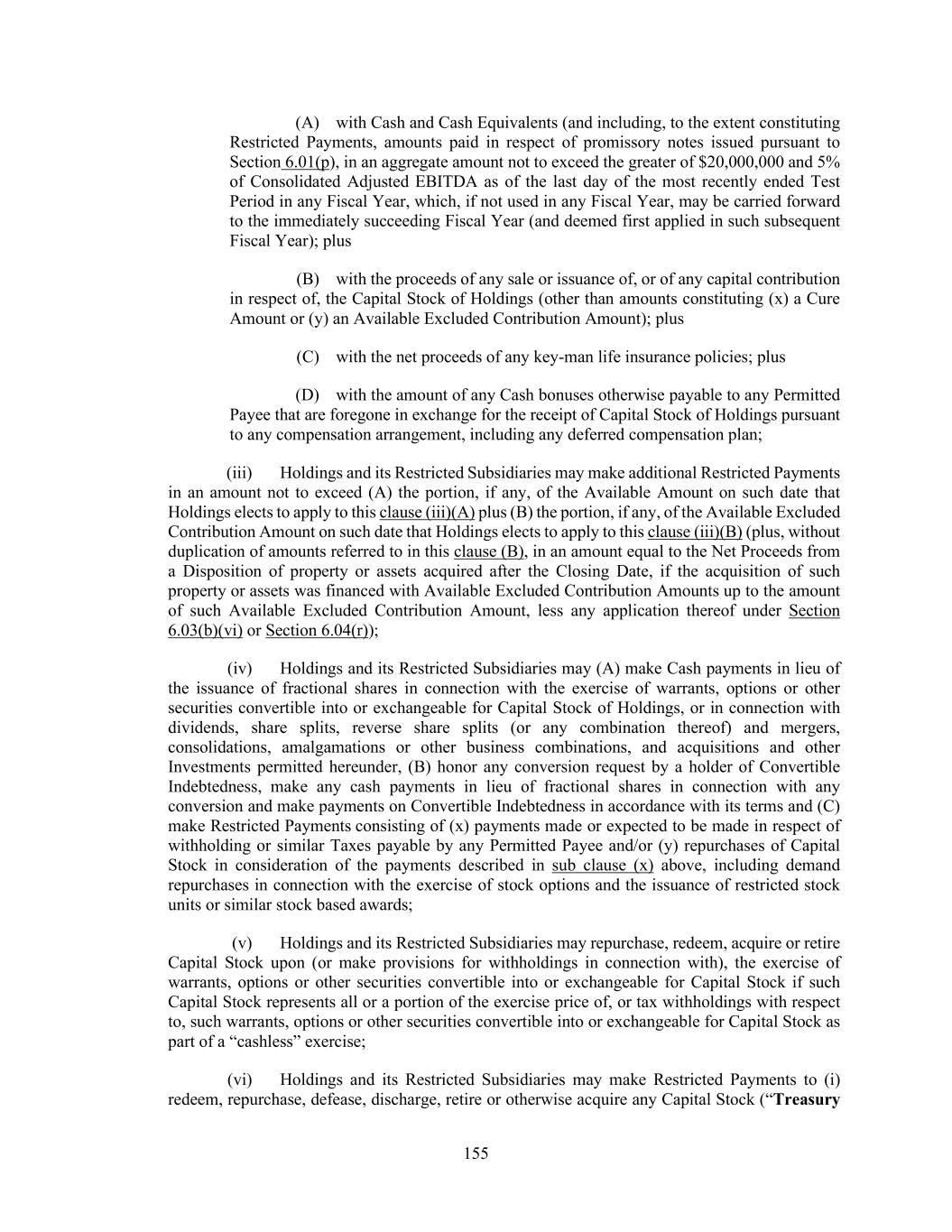 155 (A) with Cash and Cash Equivalents (and including, to the extent constituting Restricted Payments, amounts paid in respect of promissory notes issued pursuant to Section 6.01(p), in an aggregate amount not to exceed the greater of $20,000,000 and 5% of Consolidated Adjusted EBITDA as of the last day of the most recently ended Test Period in any Fiscal Year, which, if not used in any Fiscal Year, may be carried forward to the immediately succeeding Fiscal Year (and deemed first applied in such subsequent Fiscal Year); plus (B) with the proceeds of any sale or issuance of, or of any capital contribution in respect of, the Capital Stock of Holdings (other than amounts constituting (x) a Cure Amount or (y) an Available Excluded Contribution Amount); plus (C) with the net proceeds of any key-man life insurance policies; plus (D) with the amount of any Cash bonuses otherwise payable to any Permitted Payee that are foregone in exchange for the receipt of Capital Stock of Holdings pursuant to any compensation arrangement, including any deferred compensation plan; (iii) Holdings and its Restricted Subsidiaries may make additional Restricted Payments in an amount not to exceed (A) the portion, if any, of the Available Amount on such date that Holdings elects to apply to this clause (iii)(A) plus (B) the portion, if any, of the Available Excluded Contribution Amount on such date that Holdings elects to apply to this clause (iii)(B) (plus, without duplication of amounts referred to in this clause (B), in an amount equal to the Net Proceeds from a Disposition of property or assets acquired after the Closing Date, if the acquisition of such property or assets was financed with Available Excluded Contribution Amounts up to the amount of such Available Excluded Contribution Amount, less any application thereof under Section 6.03(b)(vi) or Section 6.04(r)); (iv) Holdings and its Restricted Subsidiaries may (A) make Cash payments in lieu of the issuance of fractional shares in connection with the exercise of warrants, options or other securities convertible into or exchangeable for Capital Stock of Holdings, or in connection with dividends, share splits, reverse share splits (or any combination thereof) and mergers, consolidations, amalgamations or other business combinations, and acquisitions and other Investments permitted hereunder, (B) honor any conversion request by a holder of Convertible Indebtedness, make any cash payments in lieu of fractional shares in connection with any conversion and make payments on Convertible Indebtedness in accordance with its terms and (C) make Restricted Payments consisting of (x) payments made or expected to be made in respect of withholding or similar Taxes payable by any Permitted Payee and/or (y) repurchases of Capital Stock in consideration of the payments described in sub clause (x) above, including demand repurchases in connection with the exercise of stock options and the issuance of restricted stock units or similar stock based awards; (v) Holdings and its Restricted Subsidiaries may repurchase, redeem, acquire or retire Capital Stock upon (or make provisions for withholdings in connection with), the exercise of warrants, options or other securities convertible into or exchangeable for Capital Stock if such Capital Stock represents all or a portion of the exercise price of, or tax withholdings with respect to, such warrants, options or other securities convertible into or exchangeable for Capital Stock as part of a “cashless” exercise; (vi) Holdings and its Restricted Subsidiaries may make Restricted Payments to (i) redeem, repurchase, defease, discharge, retire or otherwise acquire any Capital Stock (“Treasury
