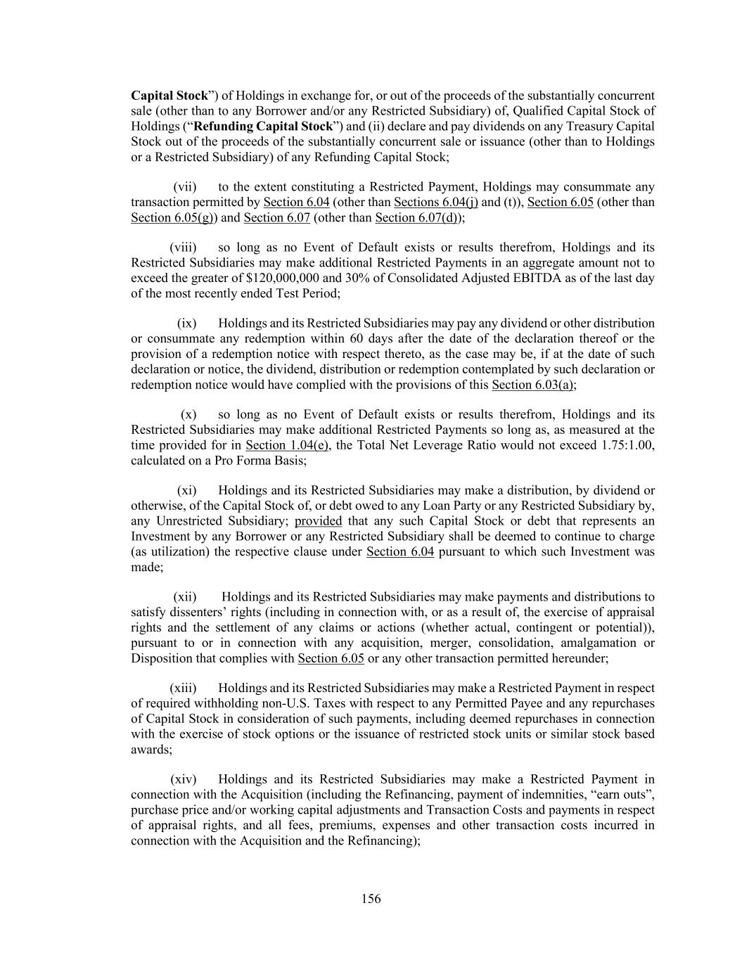 156 Capital Stock”) of Holdings in exchange for, or out of the proceeds of the substantially concurrent sale (other than to any Borrower and/or any Restricted Subsidiary) of, Qualified Capital Stock of Holdings (“Refunding Capital Stock”) and (ii) declare and pay dividends on any Treasury Capital Stock out of the proceeds of the substantially concurrent sale or issuance (other than to Holdings or a Restricted Subsidiary) of any Refunding Capital Stock; (vii) to the extent constituting a Restricted Payment, Holdings may consummate any transaction permitted by Section 6.04 (other than Sections 6.04(j) and (t)), Section 6.05 (other than Section 6.05(g)) and Section 6.07 (other than Section 6.07(d)); (viii) so long as no Event of Default exists or results therefrom, Holdings and its Restricted Subsidiaries may make additional Restricted Payments in an aggregate amount not to exceed the greater of $120,000,000 and 30% of Consolidated Adjusted EBITDA as of the last day of the most recently ended Test Period; (ix) Holdings and its Restricted Subsidiaries may pay any dividend or other distribution or consummate any redemption within 60 days after the date of the declaration thereof or the provision of a redemption notice with respect thereto, as the case may be, if at the date of such declaration or notice, the dividend, distribution or redemption contemplated by such declaration or redemption notice would have complied with the provisions of this Section 6.03(a); (x) so long as no Event of Default exists or results therefrom, Holdings and its Restricted Subsidiaries may make additional Restricted Payments so long as, as measured at the time provided for in Section 1.04(e), the Total Net Leverage Ratio would not exceed 1.75:1.00, calculated on a Pro Forma Basis; (xi) Holdings and its Restricted Subsidiaries may make a distribution, by dividend or otherwise, of the Capital Stock of, or debt owed to any Loan Party or any Restricted Subsidiary by, any Unrestricted Subsidiary; provided that any such Capital Stock or debt that represents an Investment by any Borrower or any Restricted Subsidiary shall be deemed to continue to charge (as utilization) the respective clause under Section 6.04 pursuant to which such Investment was made; (xii) Holdings and its Restricted Subsidiaries may make payments and distributions to satisfy dissenters’ rights (including in connection with, or as a result of, the exercise of appraisal rights and the settlement of any claims or actions (whether actual, contingent or potential)), pursuant to or in connection with any acquisition, merger, consolidation, amalgamation or Disposition that complies with Section 6.05 or any other transaction permitted hereunder; (xiii) Holdings and its Restricted Subsidiaries may make a Restricted Payment in respect of required withholding non-U.S. Taxes with respect to any Permitted Payee and any repurchases of Capital Stock in consideration of such payments, including deemed repurchases in connection with the exercise of stock options or the issuance of restricted stock units or similar stock based awards; (xiv) Holdings and its Restricted Subsidiaries may make a Restricted Payment in connection with the Acquisition (including the Refinancing, payment of indemnities, “earn outs”, purchase price and/or working capital adjustments and Transaction Costs and payments in respect of appraisal rights, and all fees, premiums, expenses and other transaction costs incurred in connection with the Acquisition and the Refinancing);