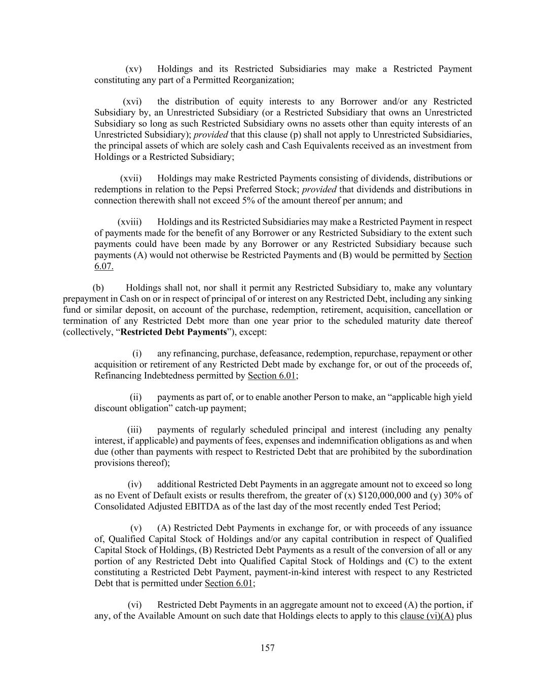 157 (xv) Holdings and its Restricted Subsidiaries may make a Restricted Payment constituting any part of a Permitted Reorganization; (xvi) the distribution of equity interests to any Borrower and/or any Restricted Subsidiary by, an Unrestricted Subsidiary (or a Restricted Subsidiary that owns an Unrestricted Subsidiary so long as such Restricted Subsidiary owns no assets other than equity interests of an Unrestricted Subsidiary); provided that this clause (p) shall not apply to Unrestricted Subsidiaries, the principal assets of which are solely cash and Cash Equivalents received as an investment from Holdings or a Restricted Subsidiary; (xvii) Holdings may make Restricted Payments consisting of dividends, distributions or redemptions in relation to the Pepsi Preferred Stock; provided that dividends and distributions in connection therewith shall not exceed 5% of the amount thereof per annum; and (xviii) Holdings and its Restricted Subsidiaries may make a Restricted Payment in respect of payments made for the benefit of any Borrower or any Restricted Subsidiary to the extent such payments could have been made by any Borrower or any Restricted Subsidiary because such payments (A) would not otherwise be Restricted Payments and (B) would be permitted by Section 6.07. (b) Holdings shall not, nor shall it permit any Restricted Subsidiary to, make any voluntary prepayment in Cash on or in respect of principal of or interest on any Restricted Debt, including any sinking fund or similar deposit, on account of the purchase, redemption, retirement, acquisition, cancellation or termination of any Restricted Debt more than one year prior to the scheduled maturity date thereof (collectively, “Restricted Debt Payments”), except: (i) any refinancing, purchase, defeasance, redemption, repurchase, repayment or other acquisition or retirement of any Restricted Debt made by exchange for, or out of the proceeds of, Refinancing Indebtedness permitted by Section 6.01; (ii) payments as part of, or to enable another Person to make, an “applicable high yield discount obligation” catch-up payment; (iii) payments of regularly scheduled principal and interest (including any penalty interest, if applicable) and payments of fees, expenses and indemnification obligations as and when due (other than payments with respect to Restricted Debt that are prohibited by the subordination provisions thereof); (iv) additional Restricted Debt Payments in an aggregate amount not to exceed so long as no Event of Default exists or results therefrom, the greater of (x) $120,000,000 and (y) 30% of Consolidated Adjusted EBITDA as of the last day of the most recently ended Test Period; (v) (A) Restricted Debt Payments in exchange for, or with proceeds of any issuance of, Qualified Capital Stock of Holdings and/or any capital contribution in respect of Qualified Capital Stock of Holdings, (B) Restricted Debt Payments as a result of the conversion of all or any portion of any Restricted Debt into Qualified Capital Stock of Holdings and (C) to the extent constituting a Restricted Debt Payment, payment-in-kind interest with respect to any Restricted Debt that is permitted under Section 6.01; (vi) Restricted Debt Payments in an aggregate amount not to exceed (A) the portion, if any, of the Available Amount on such date that Holdings elects to apply to this clause (vi)(A) plus