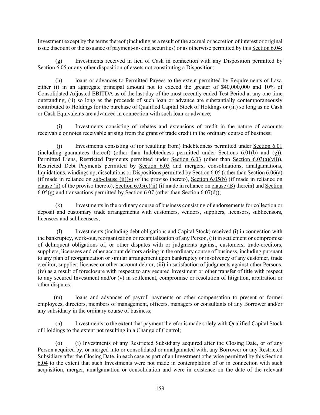 159 Investment except by the terms thereof (including as a result of the accrual or accretion of interest or original issue discount or the issuance of payment-in-kind securities) or as otherwise permitted by this Section 6.04; (g) Investments received in lieu of Cash in connection with any Disposition permitted by Section 6.05 or any other disposition of assets not constituting a Disposition; (h) loans or advances to Permitted Payees to the extent permitted by Requirements of Law, either (i) in an aggregate principal amount not to exceed the greater of $40,000,000 and 10% of Consolidated Adjusted EBITDA as of the last day of the most recently ended Test Period at any one time outstanding, (ii) so long as the proceeds of such loan or advance are substantially contemporaneously contributed to Holdings for the purchase of Qualified Capital Stock of Holdings or (iii) so long as no Cash or Cash Equivalents are advanced in connection with such loan or advance; (i) Investments consisting of rebates and extensions of credit in the nature of accounts receivable or notes receivable arising from the grant of trade credit in the ordinary course of business; (j) Investments consisting of (or resulting from) Indebtedness permitted under Section 6.01 (including guarantees thereof) (other than Indebtedness permitted under Sections 6.01(b) and (g)), Permitted Liens, Restricted Payments permitted under Section 6.03 (other than Section 6.03(a)(vii)), Restricted Debt Payments permitted by Section 6.03 and mergers, consolidations, amalgamations, liquidations, windings up, dissolutions or Dispositions permitted by Section 6.05 (other than Section 6.06(a) (if made in reliance on sub-clause (ii)(y) of the proviso thereto), Section 6.05(b) (if made in reliance on clause (ii) of the proviso thereto), Section 6.05(c)(ii) (if made in reliance on clause (B) therein) and Section 6.05(g) and transactions permitted by Section 6.07 (other than Section 6.07(d)); (k) Investments in the ordinary course of business consisting of endorsements for collection or deposit and customary trade arrangements with customers, vendors, suppliers, licensors, sublicensors, licensees and sublicensees; (l) Investments (including debt obligations and Capital Stock) received (i) in connection with the bankruptcy, work-out, reorganization or recapitalization of any Person, (ii) in settlement or compromise of delinquent obligations of, or other disputes with or judgments against, customers, trade-creditors, suppliers, licensees and other account debtors arising in the ordinary course of business, including pursuant to any plan of reorganization or similar arrangement upon bankruptcy or insolvency of any customer, trade creditor, supplier, licensee or other account debtor, (iii) in satisfaction of judgments against other Persons, (iv) as a result of foreclosure with respect to any secured Investment or other transfer of title with respect to any secured Investment and/or (v) in settlement, compromise or resolution of litigation, arbitration or other disputes; (m) loans and advances of payroll payments or other compensation to present or former employees, directors, members of management, officers, managers or consultants of any Borrower and/or any subsidiary in the ordinary course of business; (n) Investments to the extent that payment therefor is made solely with Qualified Capital Stock of Holdings to the extent not resulting in a Change of Control; (o) (i) Investments of any Restricted Subsidiary acquired after the Closing Date, or of any Person acquired by, or merged into or consolidated or amalgamated with, any Borrower or any Restricted Subsidiary after the Closing Date, in each case as part of an Investment otherwise permitted by this Section 6.04 to the extent that such Investments were not made in contemplation of or in connection with such acquisition, merger, amalgamation or consolidation and were in existence on the date of the relevant