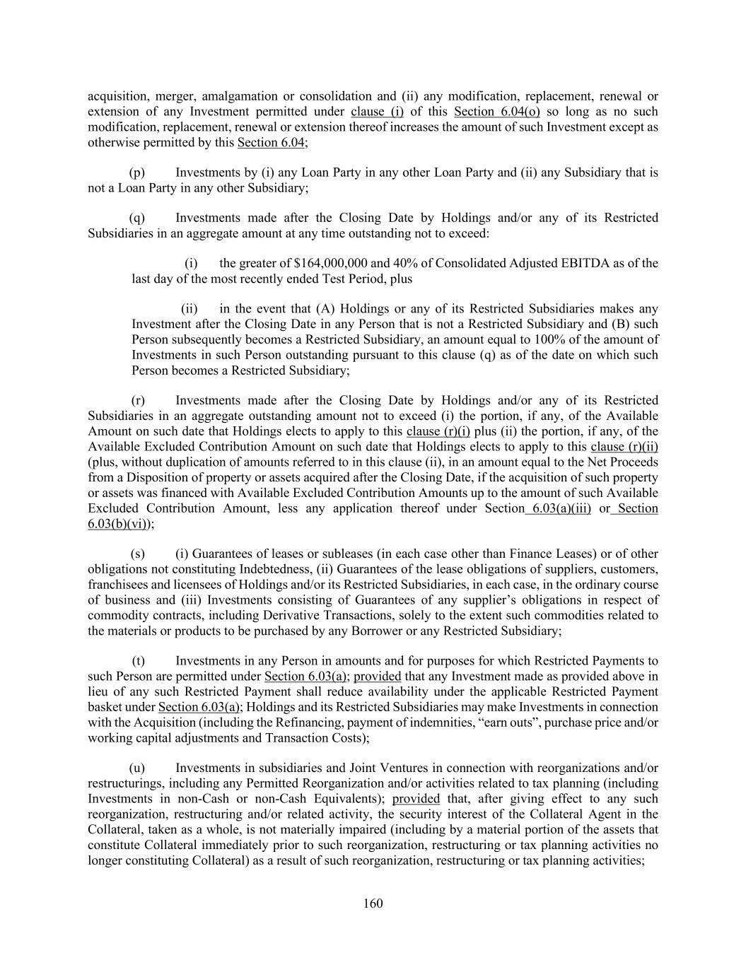 160 acquisition, merger, amalgamation or consolidation and (ii) any modification, replacement, renewal or extension of any Investment permitted under clause (i) of this Section 6.04(o) so long as no such modification, replacement, renewal or extension thereof increases the amount of such Investment except as otherwise permitted by this Section 6.04; (p) Investments by (i) any Loan Party in any other Loan Party and (ii) any Subsidiary that is not a Loan Party in any other Subsidiary; (q) Investments made after the Closing Date by Holdings and/or any of its Restricted Subsidiaries in an aggregate amount at any time outstanding not to exceed: (i) the greater of $164,000,000 and 40% of Consolidated Adjusted EBITDA as of the last day of the most recently ended Test Period, plus (ii) in the event that (A) Holdings or any of its Restricted Subsidiaries makes any Investment after the Closing Date in any Person that is not a Restricted Subsidiary and (B) such Person subsequently becomes a Restricted Subsidiary, an amount equal to 100% of the amount of Investments in such Person outstanding pursuant to this clause (q) as of the date on which such Person becomes a Restricted Subsidiary; (r) Investments made after the Closing Date by Holdings and/or any of its Restricted Subsidiaries in an aggregate outstanding amount not to exceed (i) the portion, if any, of the Available Amount on such date that Holdings elects to apply to this clause (r)(i) plus (ii) the portion, if any, of the Available Excluded Contribution Amount on such date that Holdings elects to apply to this clause (r)(ii) (plus, without duplication of amounts referred to in this clause (ii), in an amount equal to the Net Proceeds from a Disposition of property or assets acquired after the Closing Date, if the acquisition of such property or assets was financed with Available Excluded Contribution Amounts up to the amount of such Available Excluded Contribution Amount, less any application thereof under Section 6.03(a)(iii) or Section 6.03(b)(vi)); (s) (i) Guarantees of leases or subleases (in each case other than Finance Leases) or of other obligations not constituting Indebtedness, (ii) Guarantees of the lease obligations of suppliers, customers, franchisees and licensees of Holdings and/or its Restricted Subsidiaries, in each case, in the ordinary course of business and (iii) Investments consisting of Guarantees of any supplier’s obligations in respect of commodity contracts, including Derivative Transactions, solely to the extent such commodities related to the materials or products to be purchased by any Borrower or any Restricted Subsidiary; (t) Investments in any Person in amounts and for purposes for which Restricted Payments to such Person are permitted under Section 6.03(a); provided that any Investment made as provided above in lieu of any such Restricted Payment shall reduce availability under the applicable Restricted Payment basket under Section 6.03(a); Holdings and its Restricted Subsidiaries may make Investments in connection with the Acquisition (including the Refinancing, payment of indemnities, “earn outs”, purchase price and/or working capital adjustments and Transaction Costs); (u) Investments in subsidiaries and Joint Ventures in connection with reorganizations and/or restructurings, including any Permitted Reorganization and/or activities related to tax planning (including Investments in non-Cash or non-Cash Equivalents); provided that, after giving effect to any such reorganization, restructuring and/or related activity, the security interest of the Collateral Agent in the Collateral, taken as a whole, is not materially impaired (including by a material portion of the assets that constitute Collateral immediately prior to such reorganization, restructuring or tax planning activities no longer constituting Collateral) as a result of such reorganization, restructuring or tax planning activities;